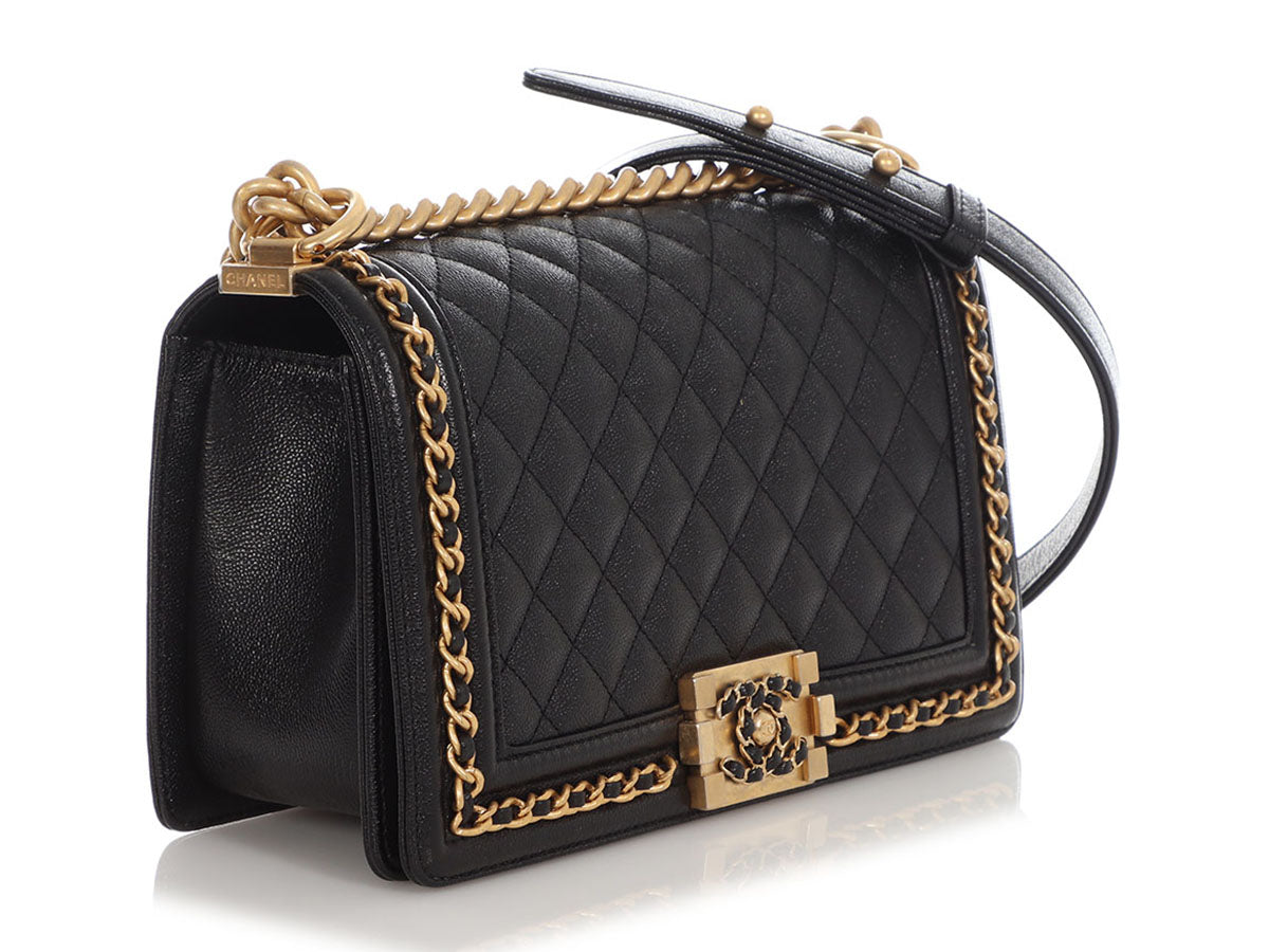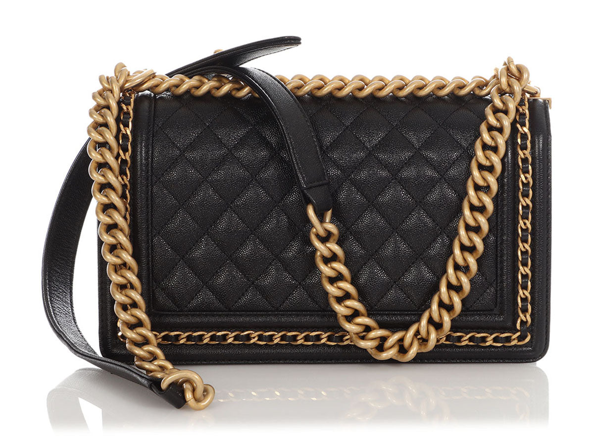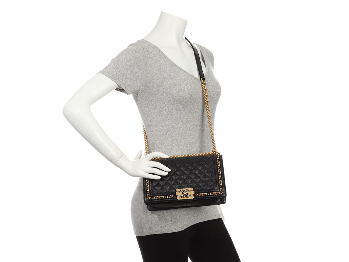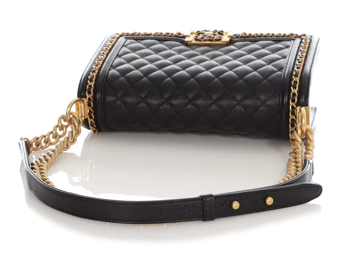 In this Chanel Old Medium Black Quilted Caviar Boy, the channel-stitched edges of a traditional Boy are replaced with leather-woven chain, giving it the name Chain Around! The diamond-quilted front face features a cool leather-and-chain antiqued gold-tone Boy clasp that opens to a black-leather interior with one long slide pocket inside. New and never worn from 2023, it comes with a box. The adjustable-length strap features a combination chunky chain and black-leather shoulder pad that can be worn doubled with an 11-inch drop or at its full length of 19.5 inches as a hands-free crossbody!