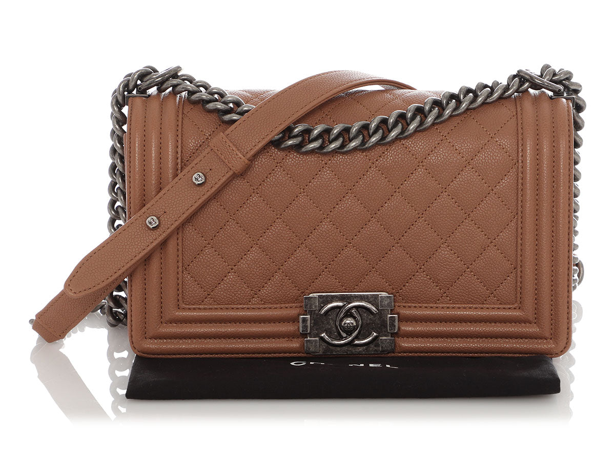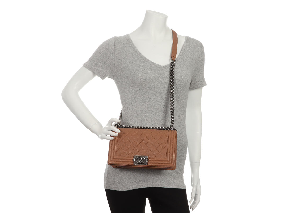 Oh boy, Chanel’s Tan Caviar Old Medium Boy Bag is sweet and stylish! Made of dark tan caviar leather with a 20.25-inch drop shown on the adjustable strap, a ruthenium clasp secures the flap, opening to matching fabric and one slide pocket inside. In very good condition with a dustbag, there is some rubbing and wear on the corners, light scratches on the hardware, a few scratches on the leather and a few small stains inside. The quilting and the hardware give it a rustic elegance!