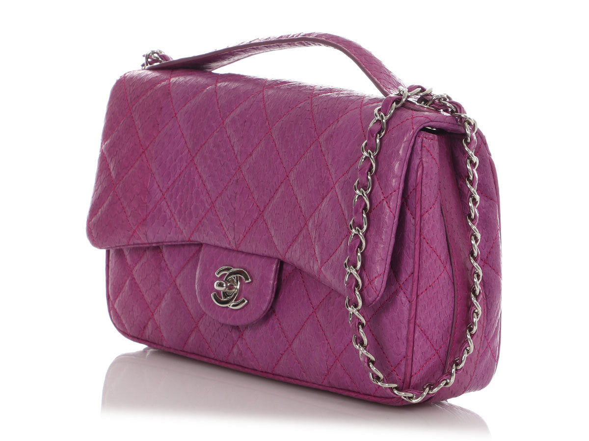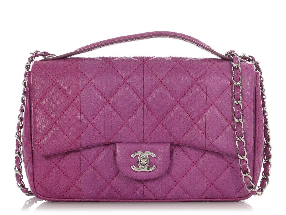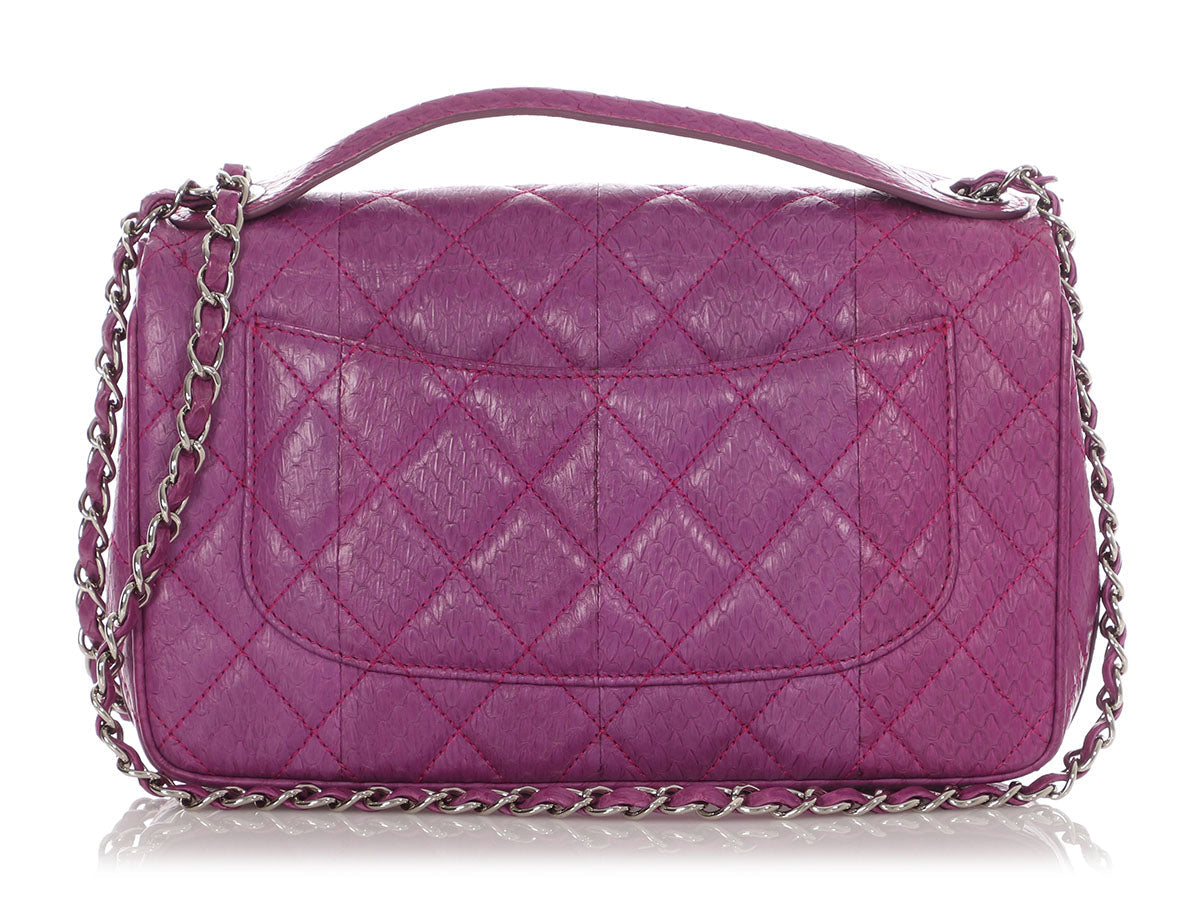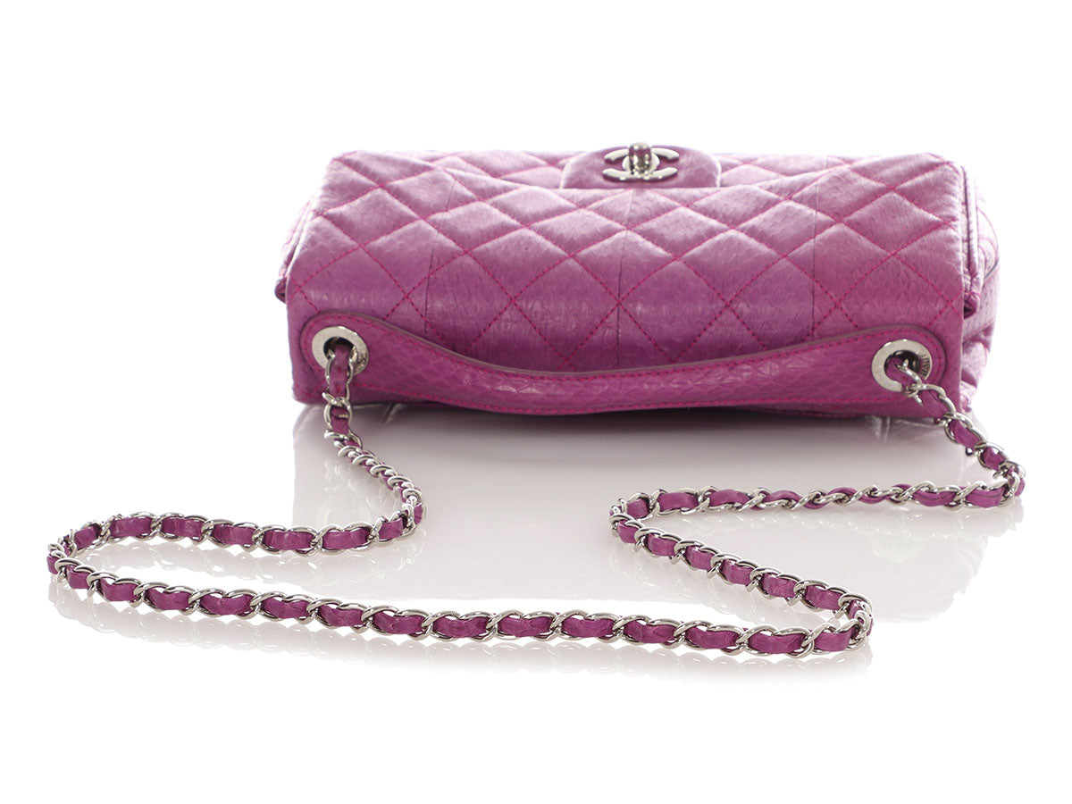 Exotic skin and a pop of fabulous color make Chanel’s Purple Quilted Watersnake Easy Carry Flap a must-have for the discriminating fashionista! Made of snakeskin with silver hardware, this diamond-quilted beauty features a flap with a logo turnlock that opens to tonal-fabric lining with one zipped pocket inside. An additional slide pocket can be found on the bag’s back face. In great condition from the 2015 Cruise collection, it comes with a dustbag, box, card, tag, and booklet, and has light scratches on the hardware and small dark marks on the underside of the flap near the hardware. Carry it by the flat leather handle with a 1-inch drop or sling it over your shoulder or crossbody by the snakeskin-through-chain strap with a 19.5-inch drop!