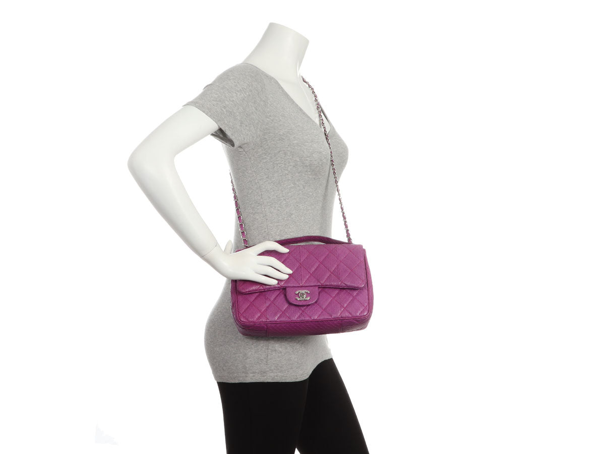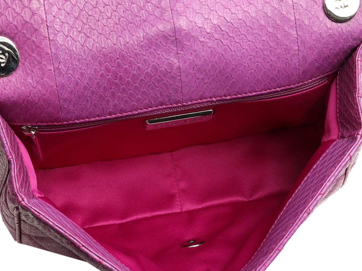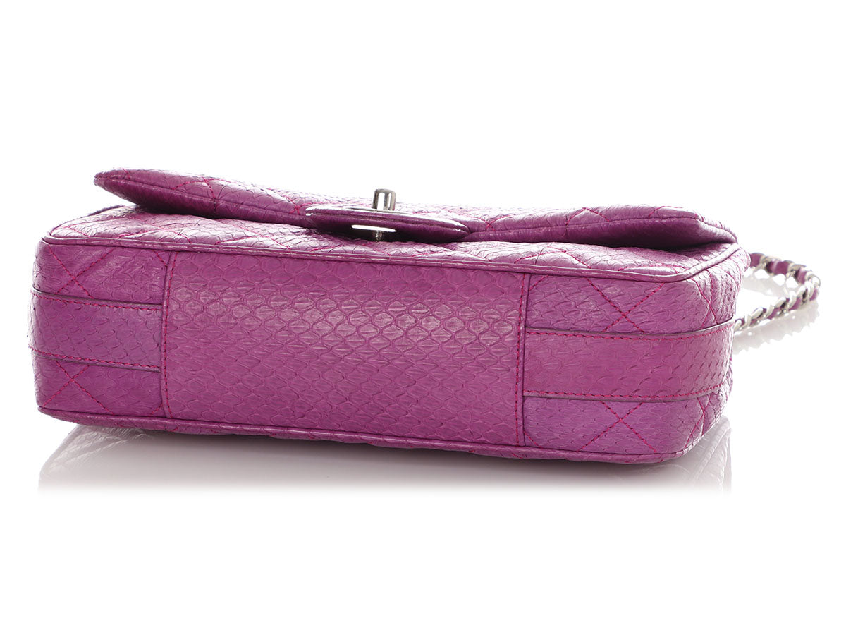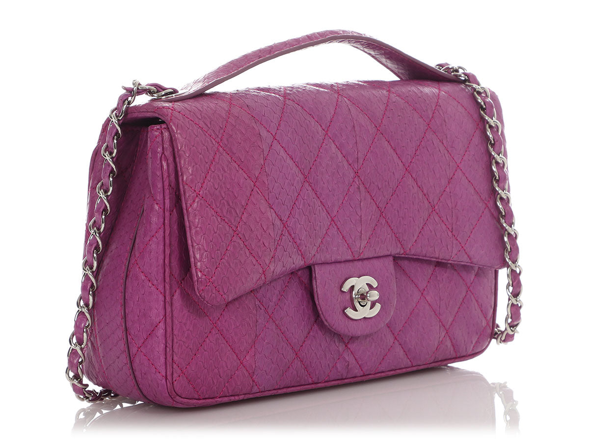 Exotic skin and a pop of fabulous color make Chanel’s Purple Quilted Watersnake Easy Carry Flap a must-have for the discriminating fashionista! Made of snakeskin with silver hardware, this diamond-quilted beauty features a flap with a logo turnlock that opens to tonal-fabric lining with one zipped pocket inside. An additional slide pocket can be found on the bag’s back face. In great condition from the 2015 Cruise collection, it comes with a dustbag, box, card, tag, and booklet, and has light scratches on the hardware and small dark marks on the underside of the flap near the hardware. Carry it by the flat leather handle with a 1-inch drop or sling it over your shoulder or crossbody by the snakeskin-through-chain strap with a 19.5-inch drop!