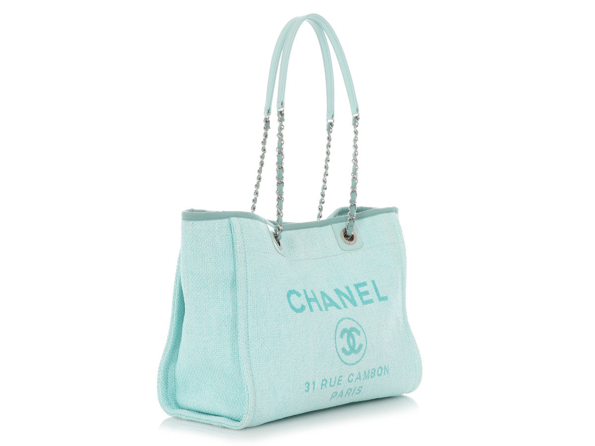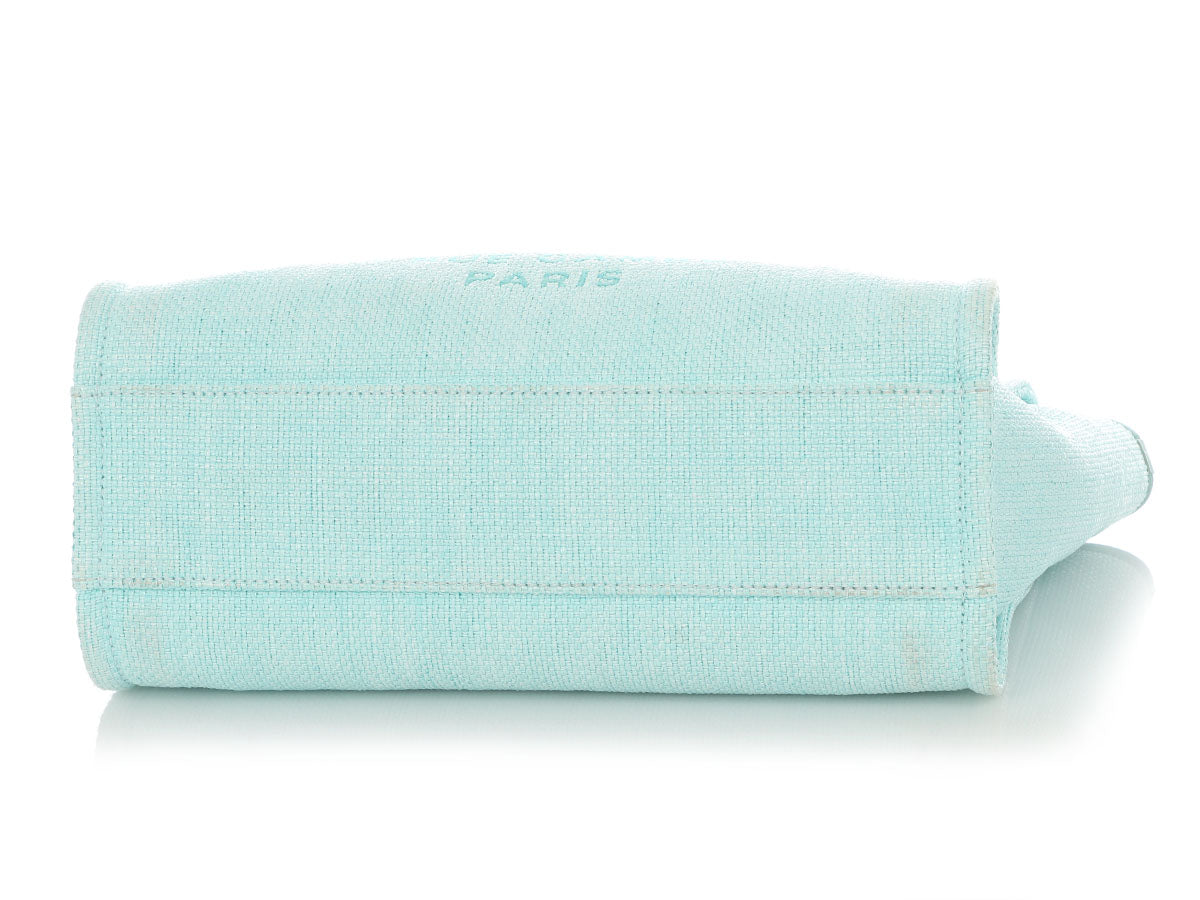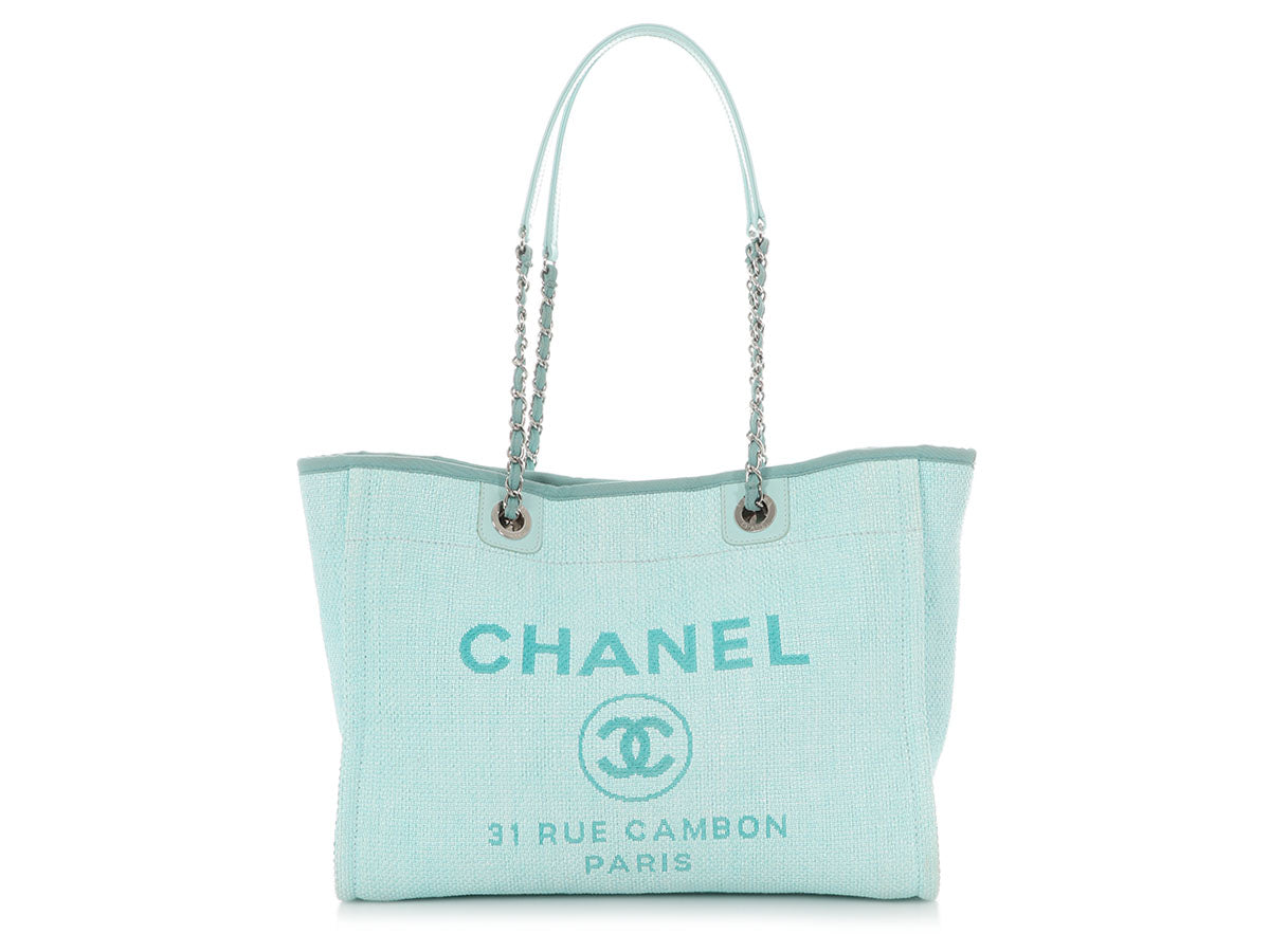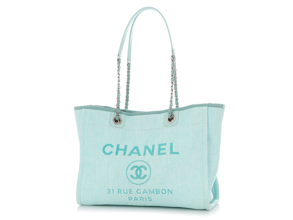 Chanel’s Small Turquoise Raffia Deauville Tote is a pretty carry in a summer color that can be worn year-round! It’s paired with silver-tone hardware in the grommets and dual fabric-and-chain handles with a 10.5-inch drop that can be worn on the shoulder with a leather pad. The front face is printed with the Chanel name, logo, and address, the bag is trimmed in a darker turquoise, and the top has a magnetic closure that opens to tonal fabric with one zipped and two slide pockets inside. In very good condition from 2017, it comes with a dustbag and card and has wear inside and light wear on the corners and edges. The squared side gussets offer a little structure to this otherwise slouchy-cool bag!