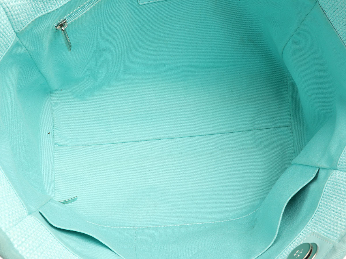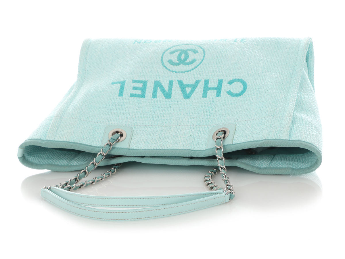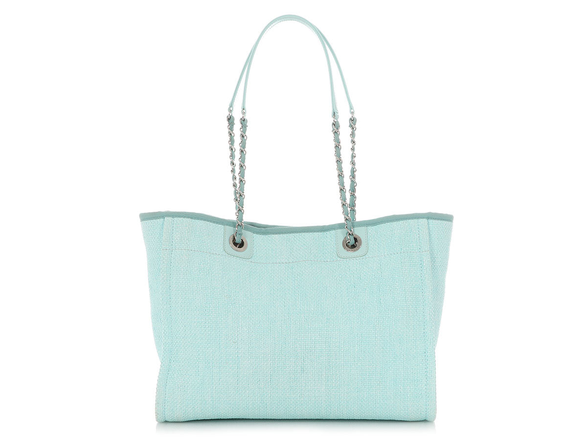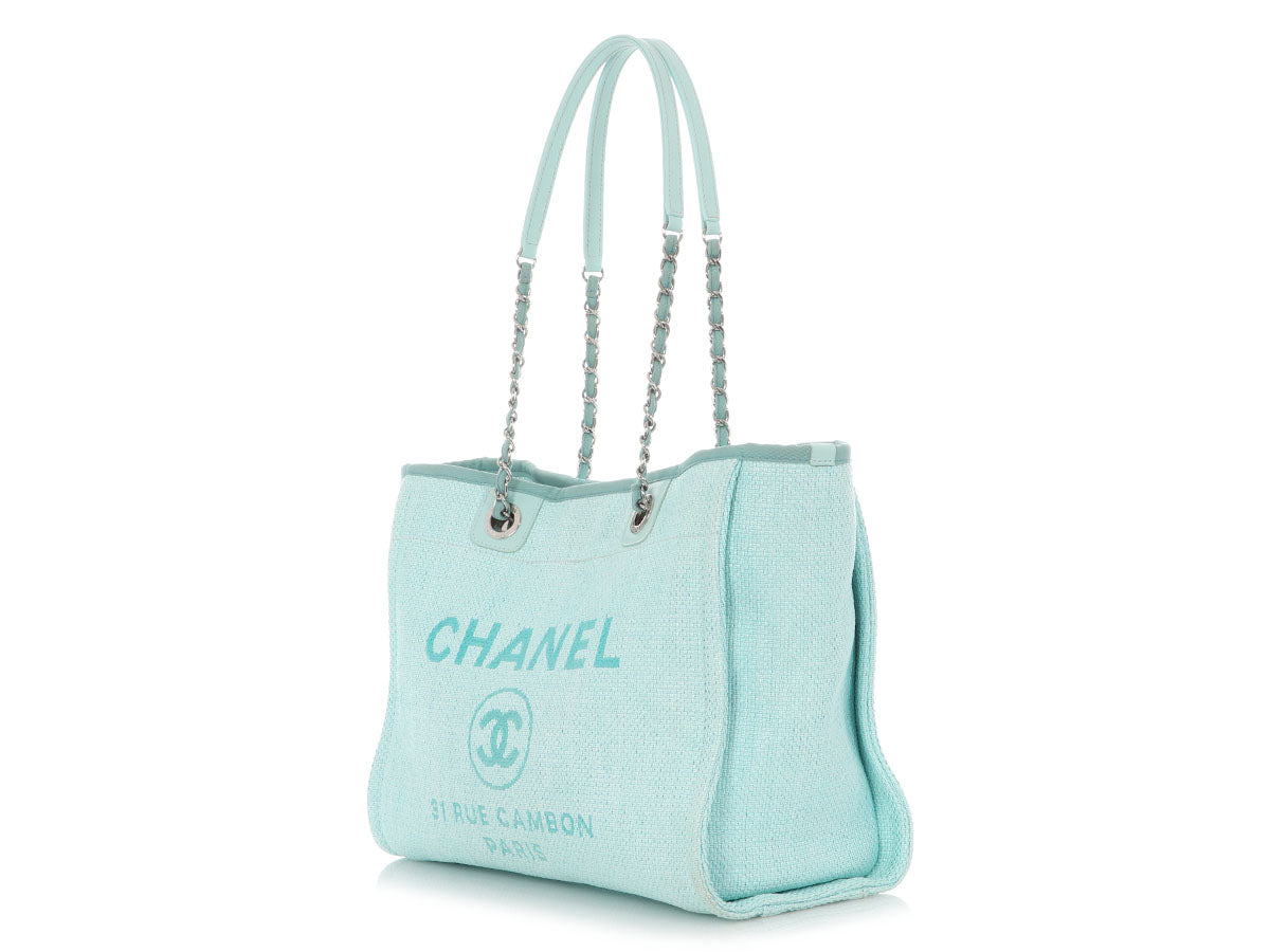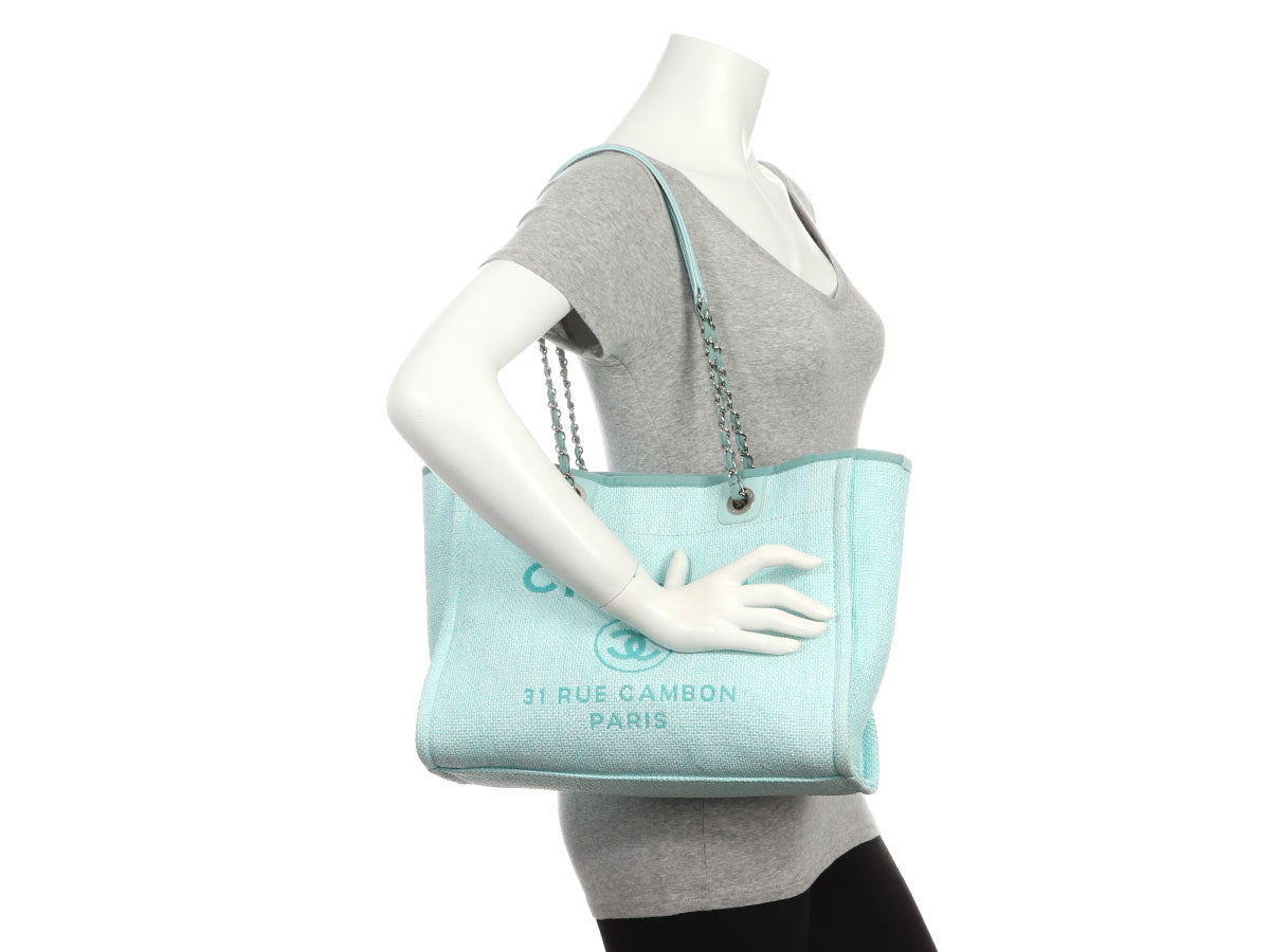 Chanel’s Small Turquoise Raffia Deauville Tote is a pretty carry in a summer color that can be worn year-round! It’s paired with silver-tone hardware in the grommets and dual fabric-and-chain handles with a 10.5-inch drop that can be worn on the shoulder with a leather pad. The front face is printed with the Chanel name, logo, and address, the bag is trimmed in a darker turquoise, and the top has a magnetic closure that opens to tonal fabric with one zipped and two slide pockets inside. In very good condition from 2017, it comes with a dustbag and card and has wear inside and light wear on the corners and edges. The squared side gussets offer a little structure to this otherwise slouchy-cool bag!
