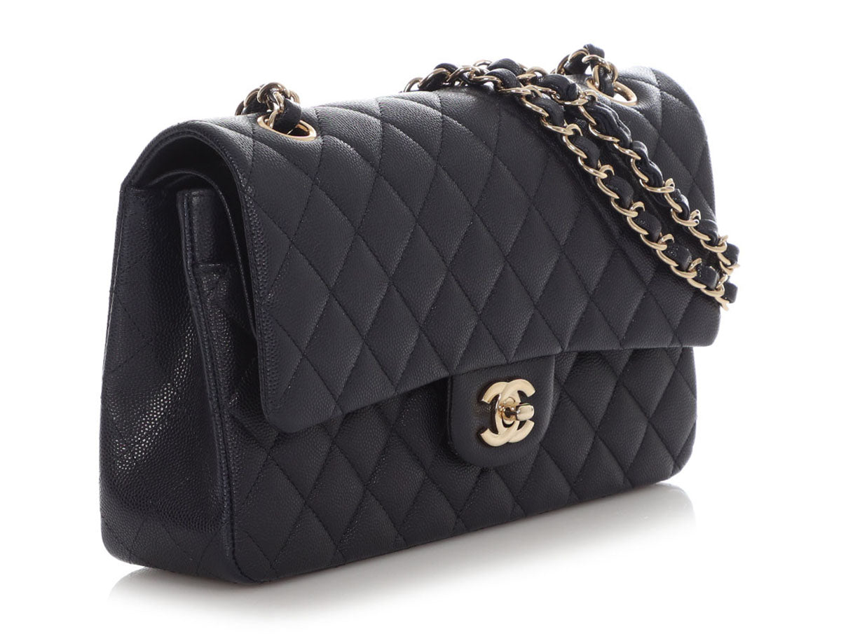 Chanel’s Medium/Large Navy Quilted Caviar Classic Double Flap is a timeless bag paired here with gold-tone hardware! A logo turnlock opens the first flap, which has a zippered love-letter pocket on its underside and a slide pocket beneath it. The second flap is logo stitched on its underside and unsnaps to reveal a slide pocket on the face of the bag and two slide pockets inside the tonal-leather interior, while an additional slide pocket rides the back face. In excellent condition from 2020, it comes with a dustbag, box, and has light wear on the second flap from the zipper of the love-letter pocket. The leather-and-chain strap offers two ways to carry this classic—with a 9-inch drop when doubled or on the shoulder when let out to its 17-inch length!