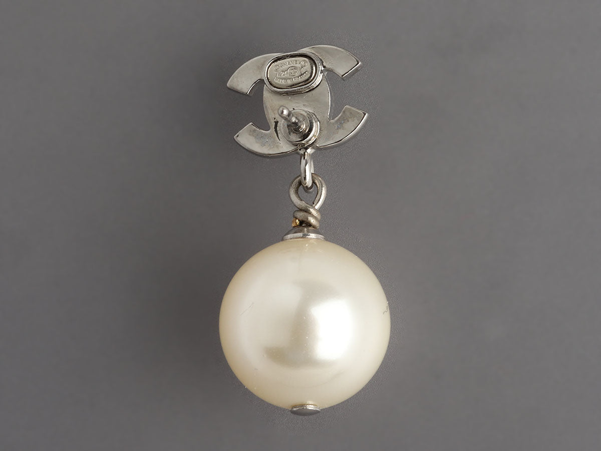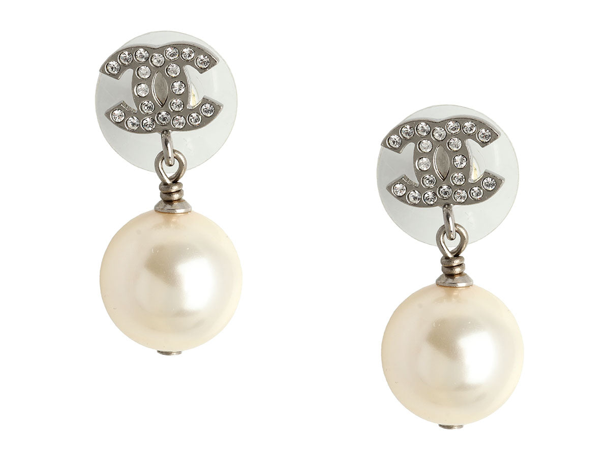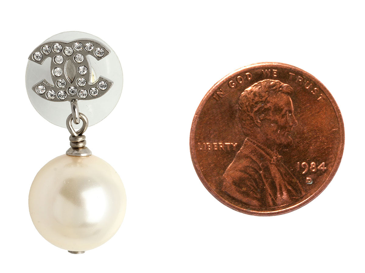 Chanel Pearl Crystal Logo Pierced Drop Earrings