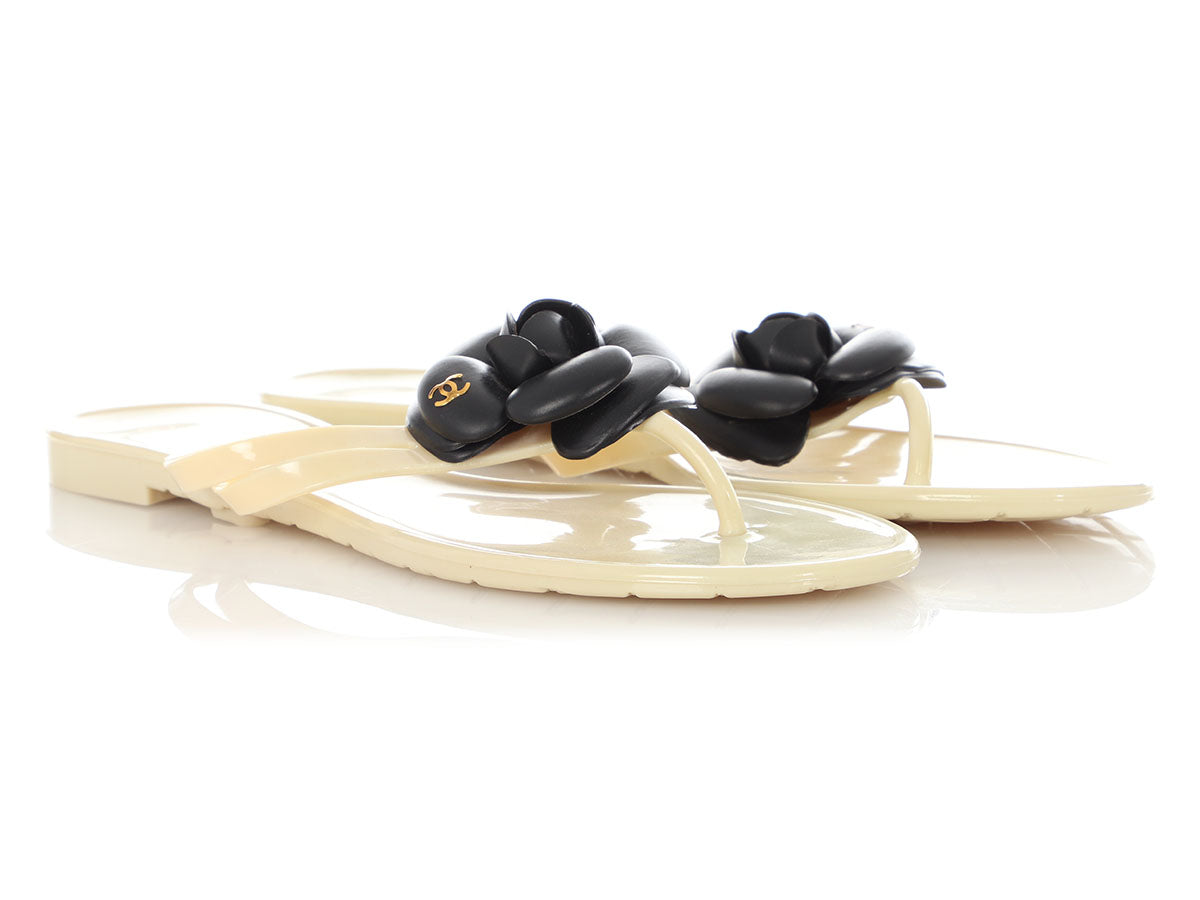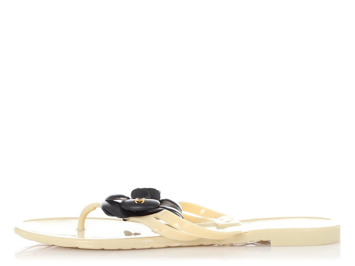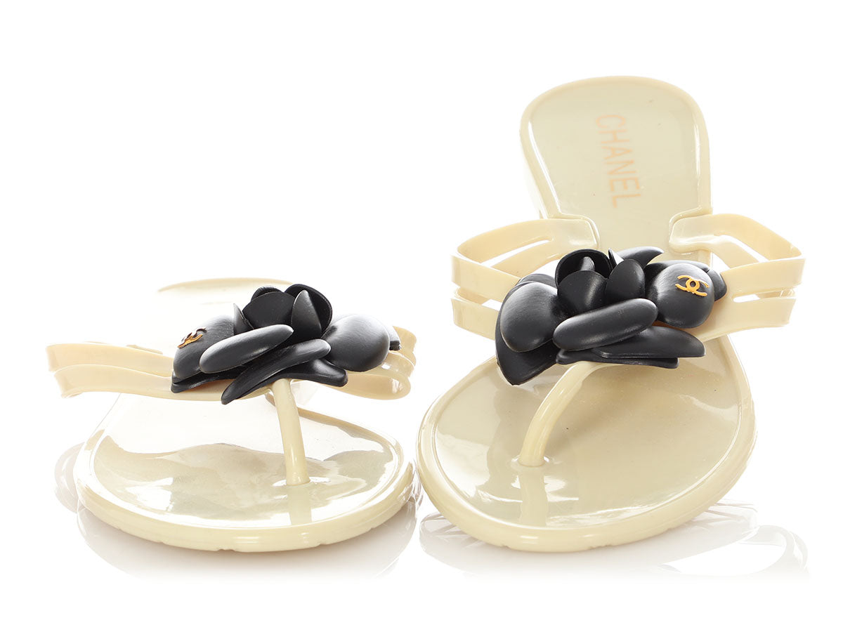 Slip on these Chanel Cream Jelly Camellia Flower Thong Sandals and hit the beach or even a party—either way, fashion is in the house! Crafted from cream PVC plastic, these water-friendly flip-flops feature black camellia flowers with a tiny gold CC logo on one petal. In very good condition, they have light wear throughout. Add these comfy-chic Chanel sandals to your shoe rack—your feet will thank you!