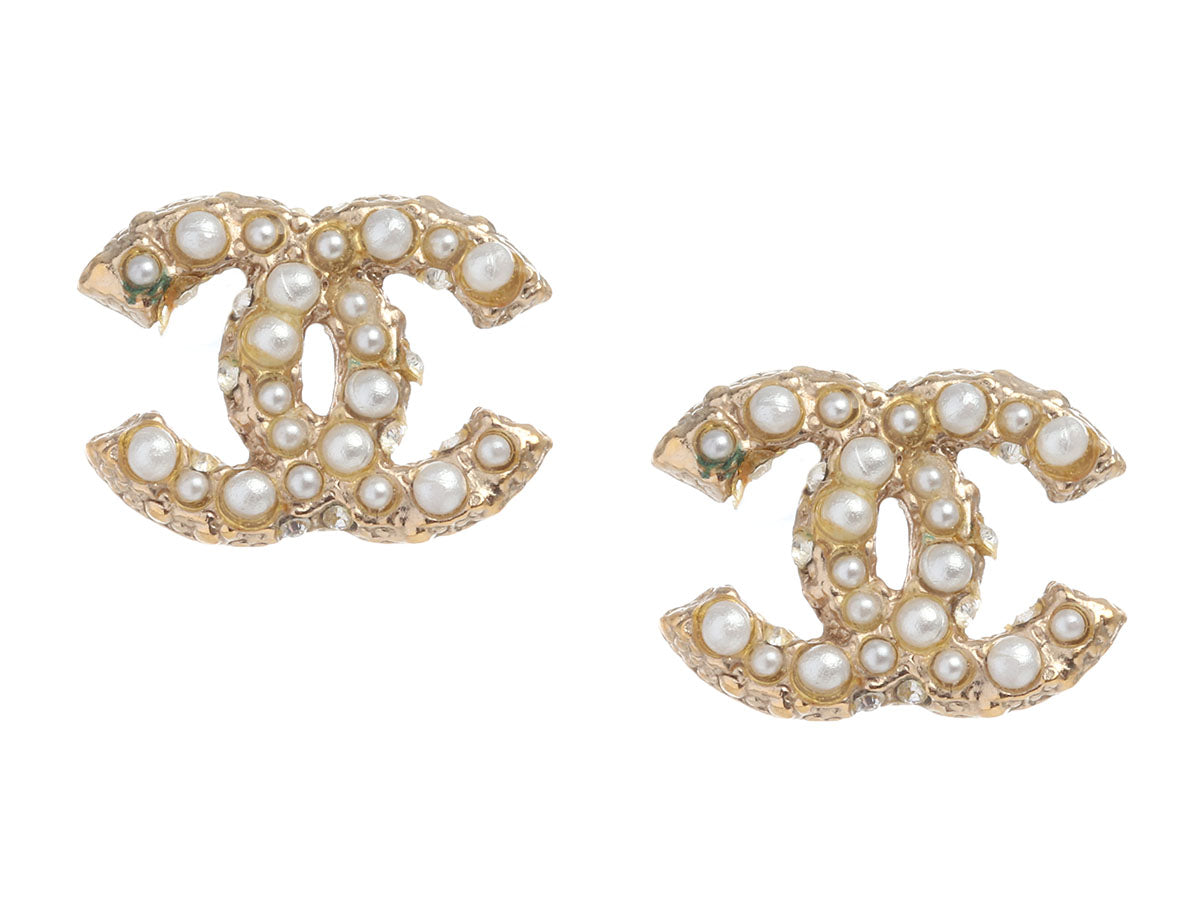 Chanel’s Small Pearl Logo Pierced Earrings are a petite homage to the house of Chanel! Made of gold-tone metal, the double C’s are encrusted with variously sized faux white pearls. Previously loved but still with a lot of life, they come with a box and have a missing pearl, tarnish, missing ear backs, and are a bit discolored. The backs of the earrings are etched and are almost, I say almost, as interesting as the fronts!