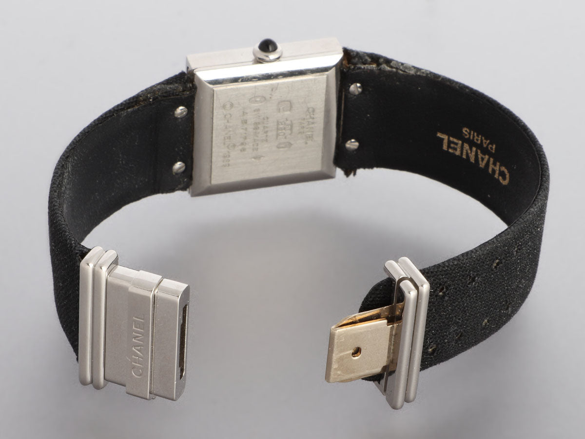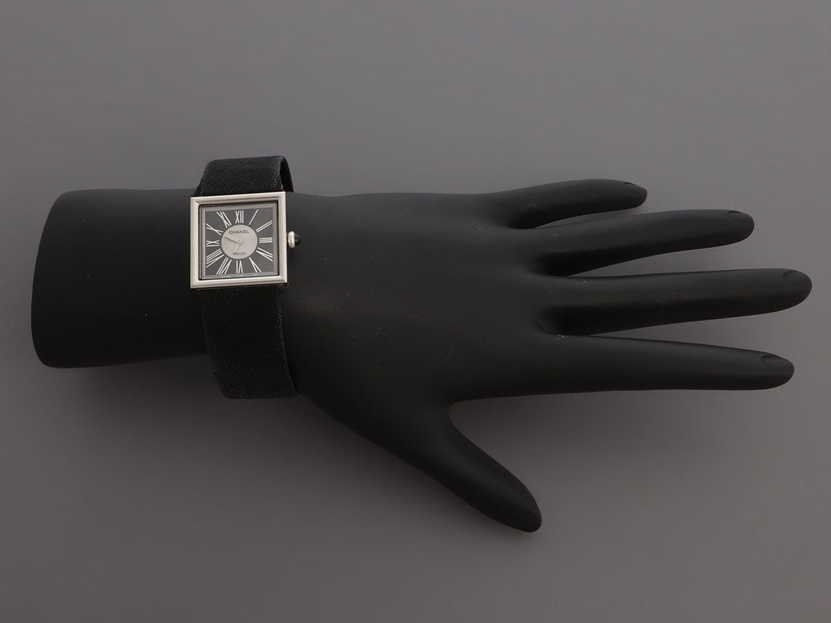 Chanel’s Platinum Matelassé Watch 19mm has a minimalist design for a sleek, futuristic presentation! The square head has a black dial with platinum hands and Roman numeral hour markers, and a black quilted grosgrain strap with a platinum push clasp. In very good condition, it comes with a box and booklet and has scratches on the metal and marks on the strap. This Swiss-made quartz watch is a rare find for a woman or a man!
