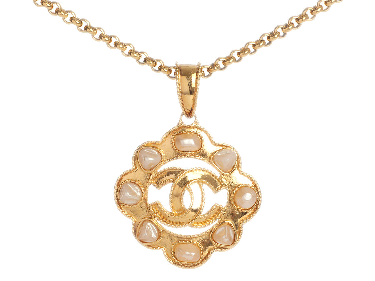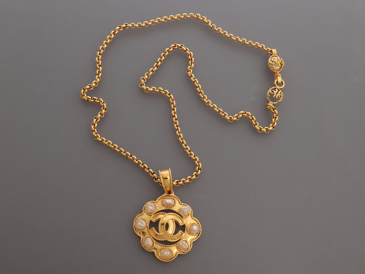 Chanel Vintage Long Pearl Logo Medallion Pendant Necklace