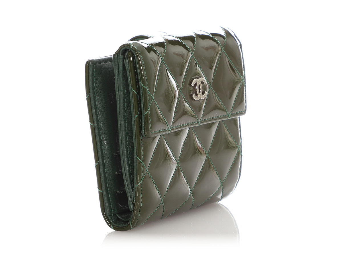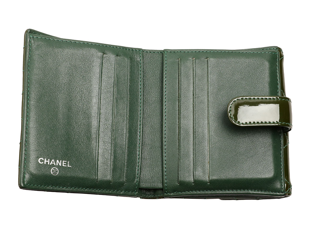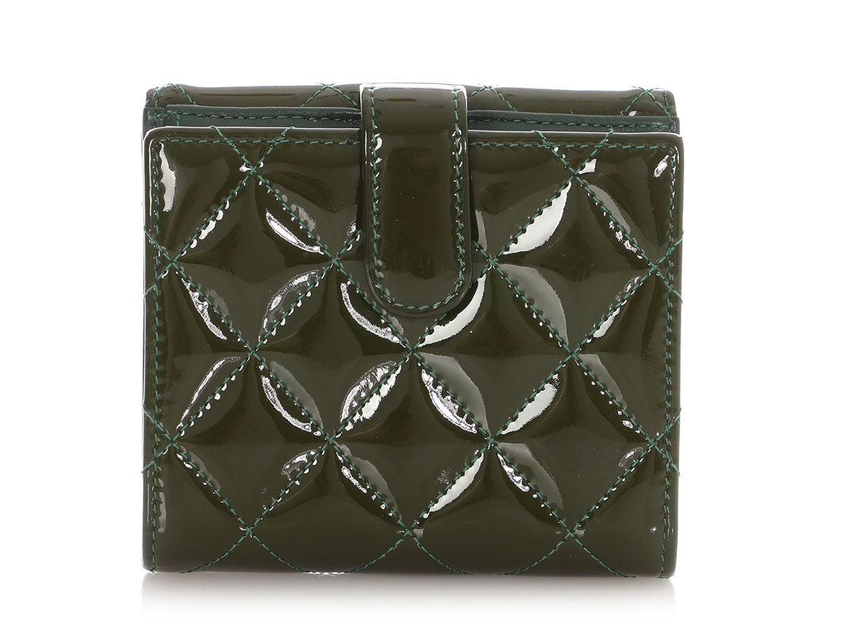 Compact in name only, this Chanel Green Quilted Patent Bifold Wallet is roomier than you’d think with space for bills, coins, and credit cards! The flap on the front face is adorned with a silver-tone CC logo and it unsnaps to a coin pocket. The back face has a snapped tab flap that opens to a leather interior that lies flat and has one pocket for bills, two medium slide pockets, In very good condition from 2011, it comes with a box and card and has wear inside and scratches on the logo metal. This little accessory is a treasure trove of hidey-holes!
