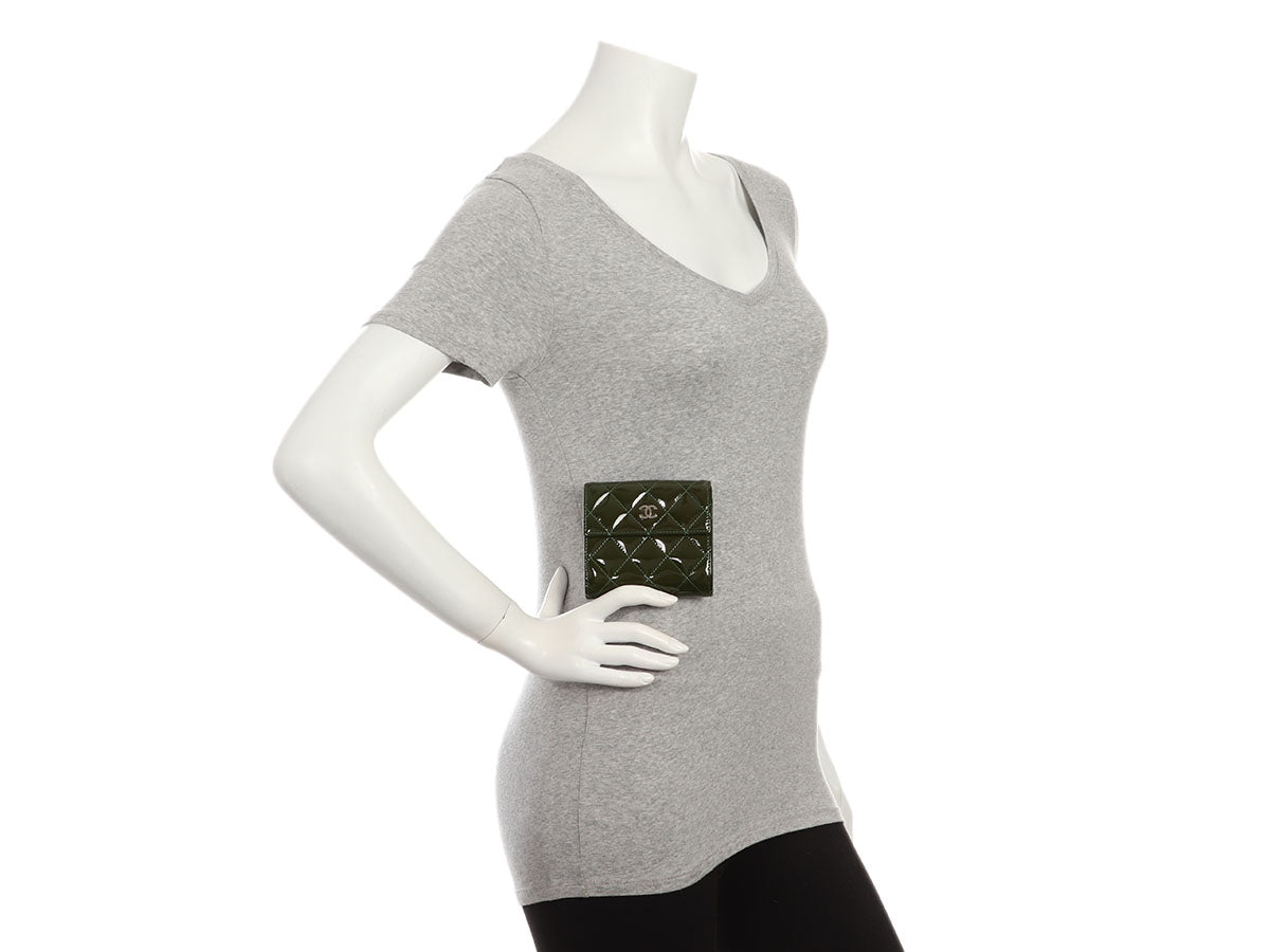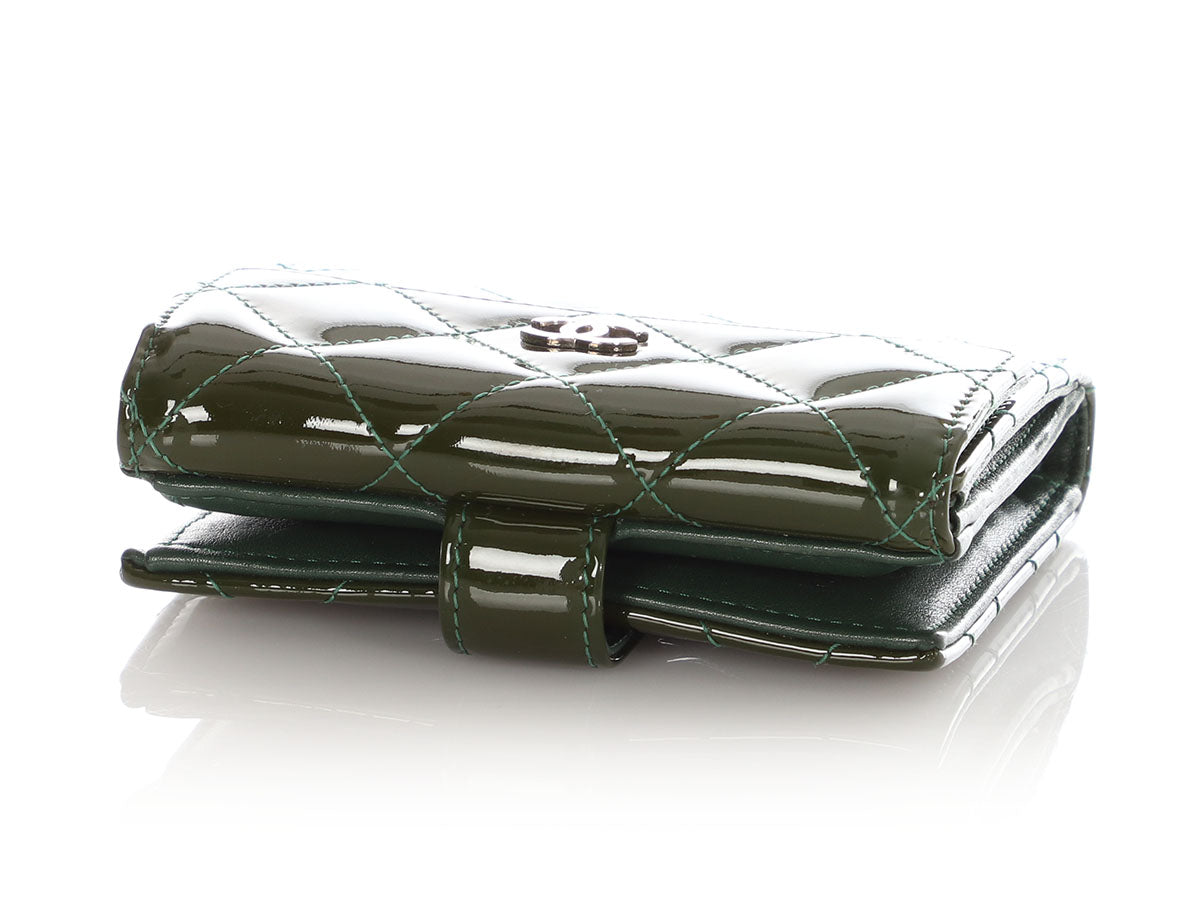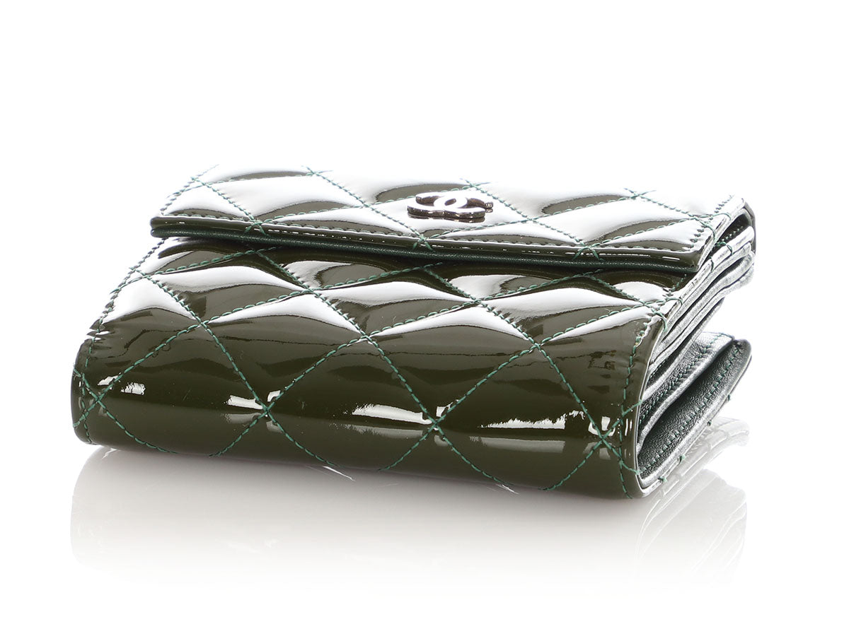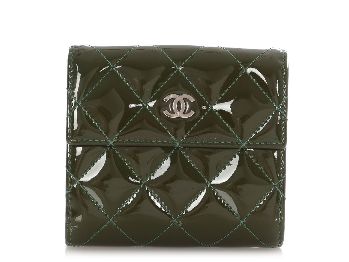 Compact in name only, this Chanel Green Quilted Patent Bifold Wallet is roomier than you’d think with space for bills, coins, and credit cards! The flap on the front face is adorned with a silver-tone CC logo and it unsnaps to a coin pocket. The back face has a snapped tab flap that opens to a leather interior that lies flat and has one pocket for bills, two medium slide pockets, In very good condition from 2011, it comes with a box and card and has wear inside and scratches on the logo metal. This little accessory is a treasure trove of hidey-holes!