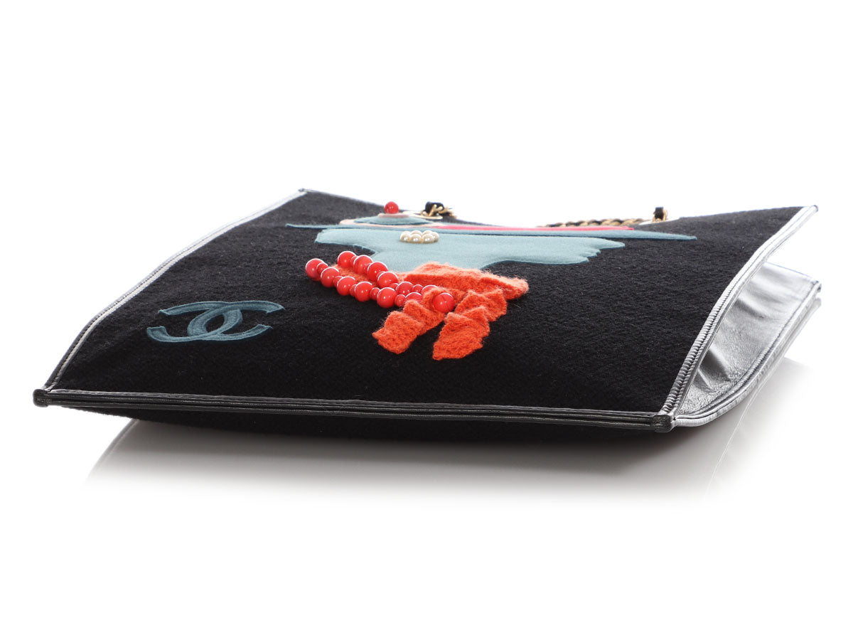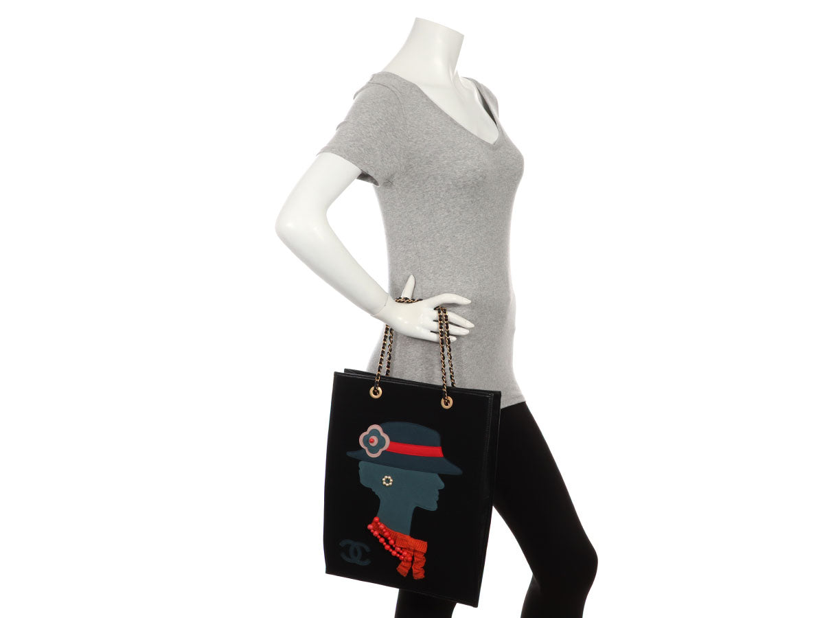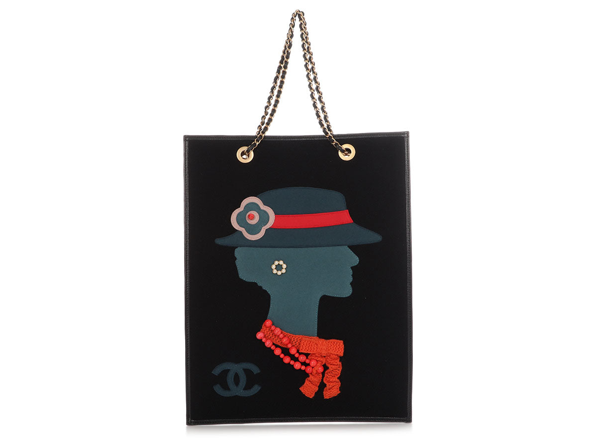 Chanel’s Vintage Black Wool Coco Silhouette Tote is a whimsical homage to the great one herself! This vintage, slim-line shopper trimmed with black leather has an open top with no pockets in the black-fabric lining and dual leather-and-antiqued gold chain straps with a 6.75-inch drop. But the real show here takes place on the front face with a silhouette of Gabrielle in reds and grays, multicolored beads and a crochet bow around her neck, a faux pearl earring, a camellia on her signature chapeau, and a 2-inch CC logo appliqué in the lower left corner. In very good condition from 2002-03, it comes with a dustbag and has not been worn but it has peeling on the metal of one back grommet. This rare bag is a real collector’s piece!