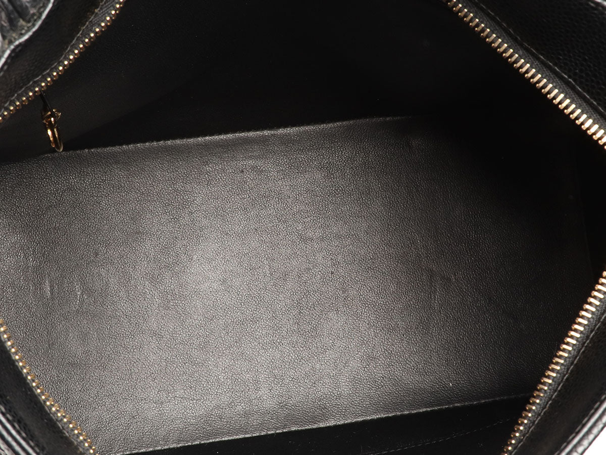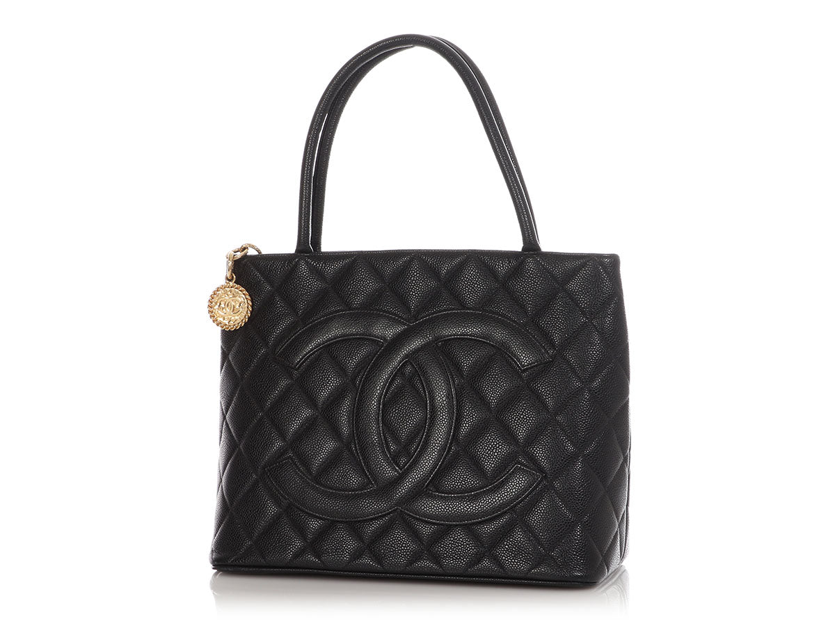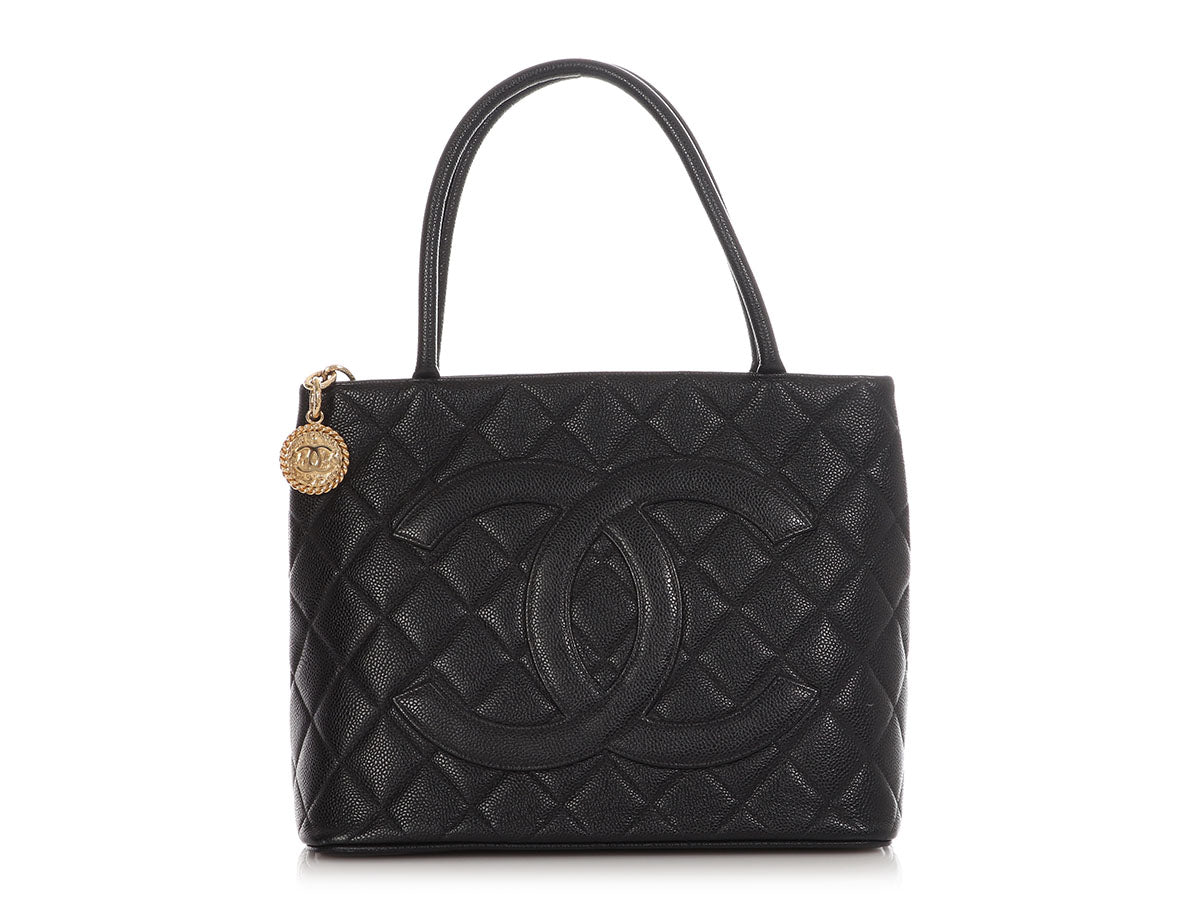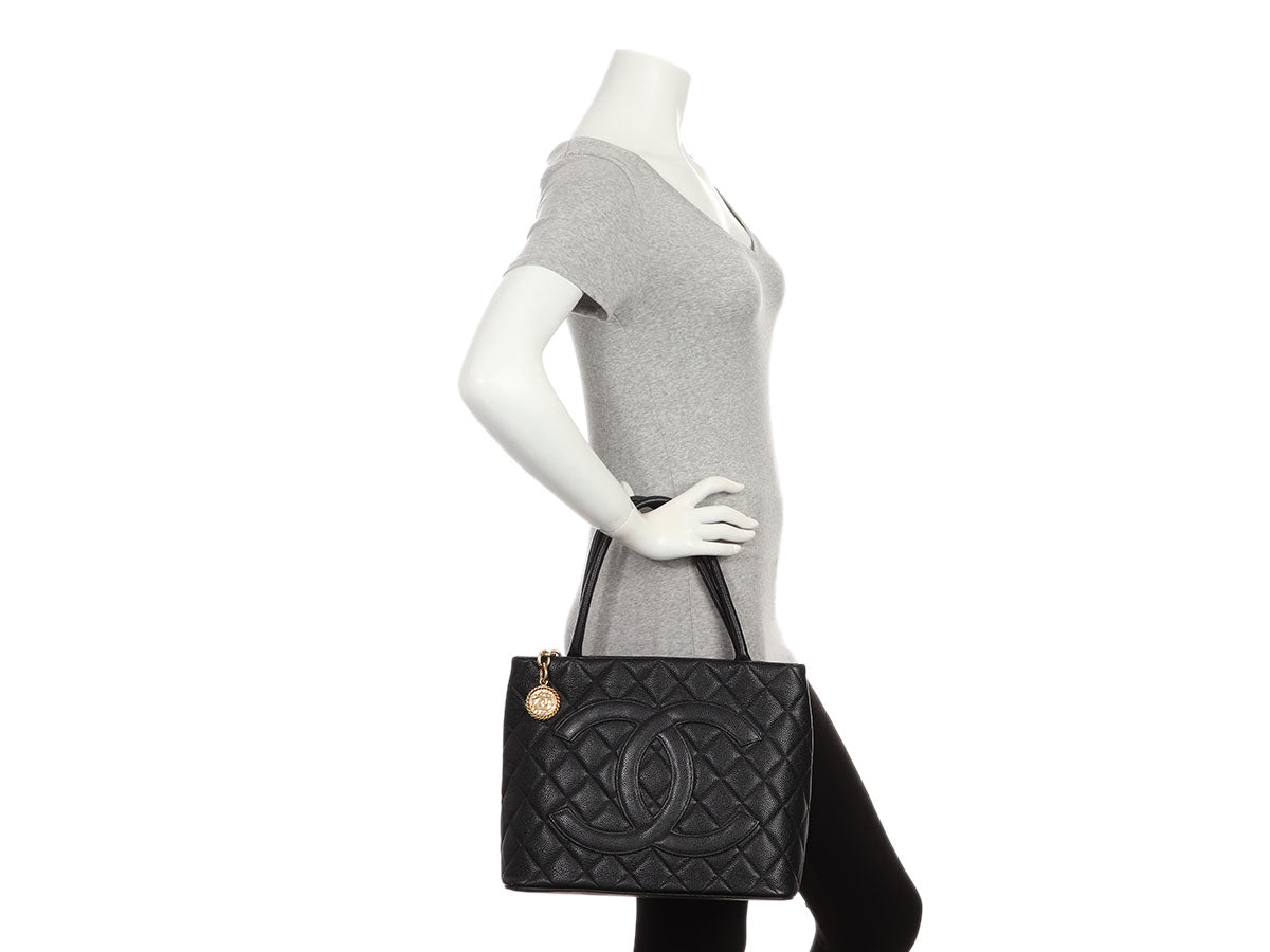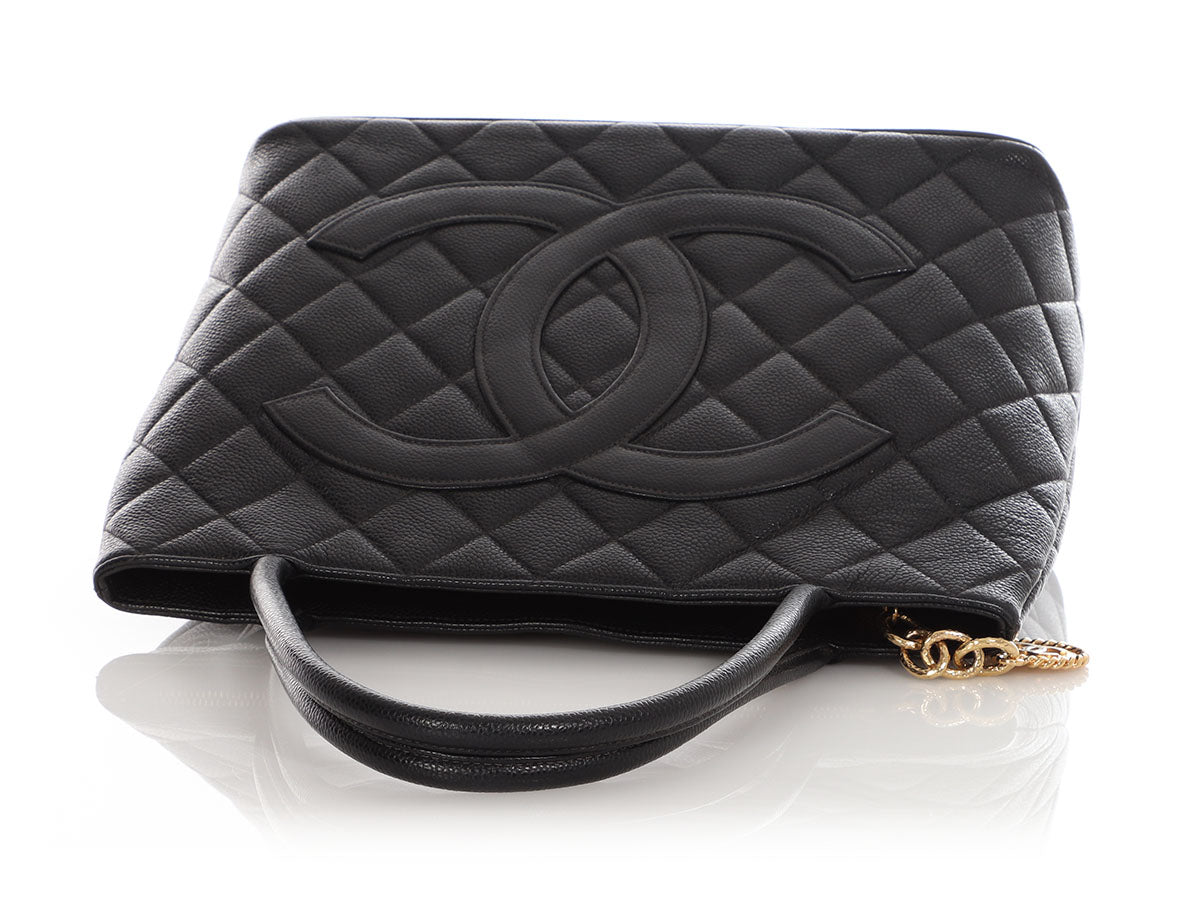 It’s all about the CC logos on Chanel’s Black Quilted Caviar Medallion Tote! The front face of this diamond-quilted bag features a large stitched logo and an ornate CC medallion zipper pull that secures the top in gold tone. The black-leather interior has one zipped and one slide pocket, while the back face has an additional slide pocket and the dual rolled-leather handles have a 6.25-inch drop. In very good condition from 2002-03, it comes with a dustbag and has wear on the corners, edges, and exterior bottom. Until it was discontinued in 2013, this style was on the arm of every fashionista in the 2000s; snap this one up while you can!