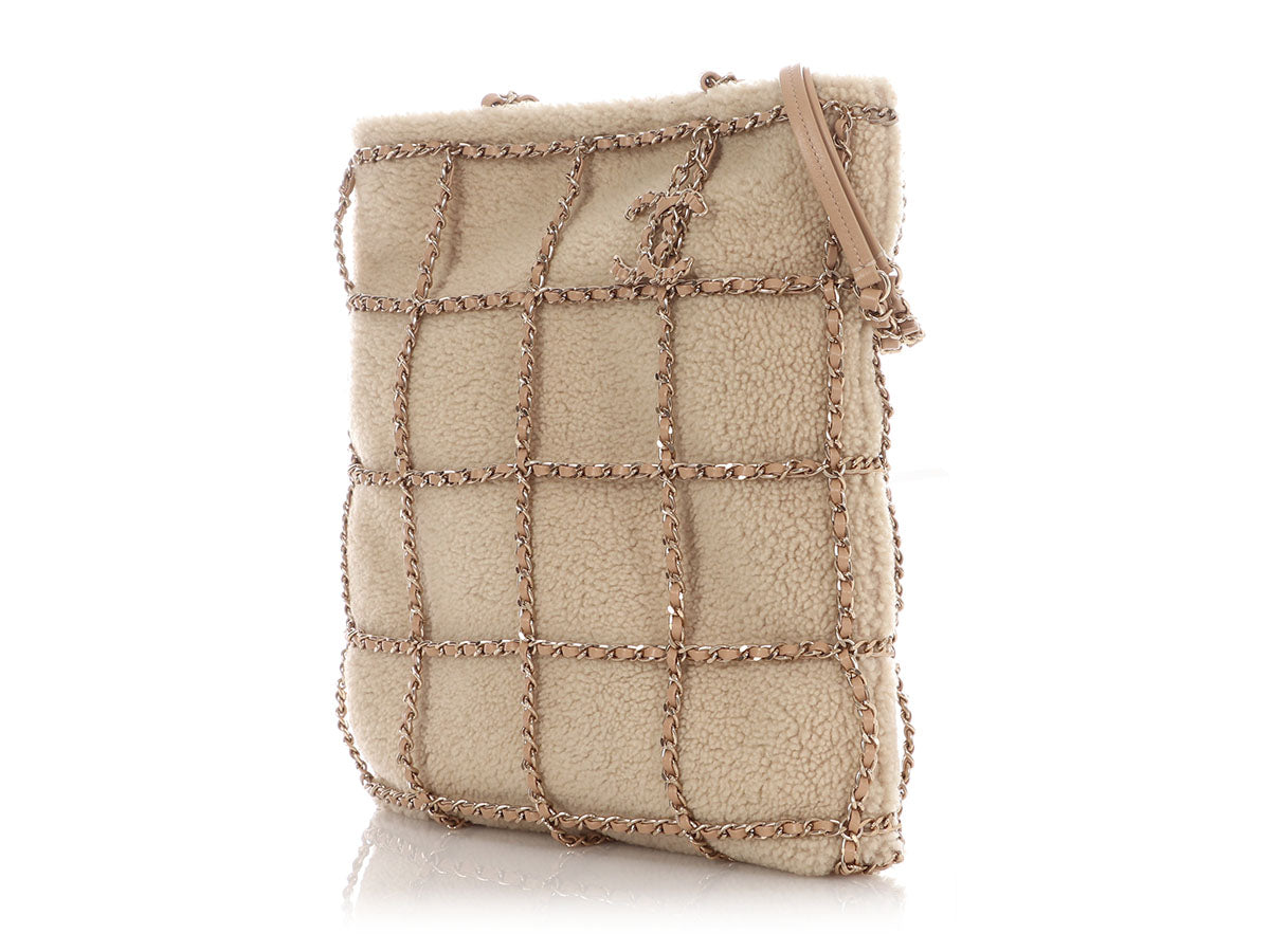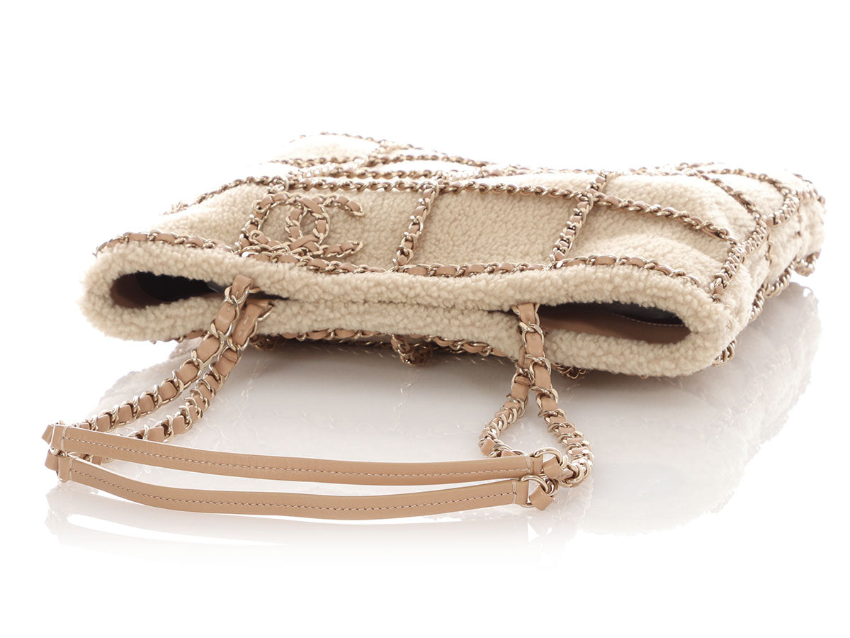 Chanel’s Shearling CC Chain Shopping Tote debuted with the 2020 collection by Virginie Viard! This slim-line bag is made of neutral-toned shearling with leather trim and gold-tone hardware. Nearly square in shape, it has a checkerboard pattern made of leather and chain on top of the wool. The open top has a magnetic closure that reveals a brown-fabric lining with one zipped pocket inside and the dual straps have leather tops and 12-inch drops. New and never worn from 2021, it comes with a dustbag, card, and large leather-and-chain logo charm. Just looking at this bag gives me the warm fuzzies!