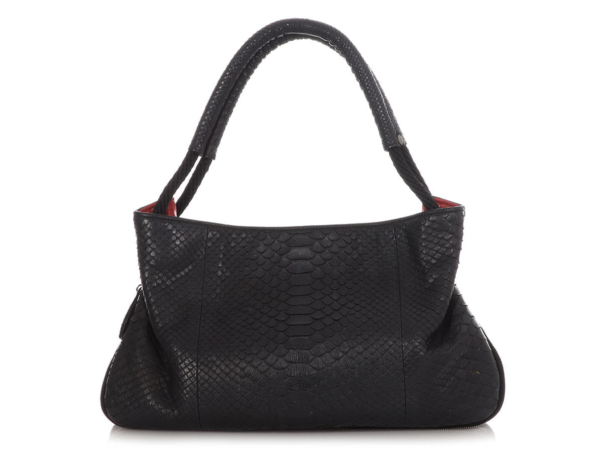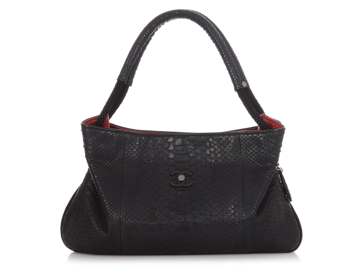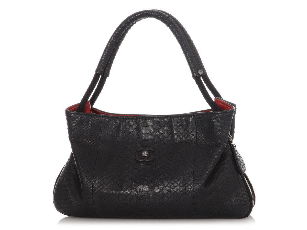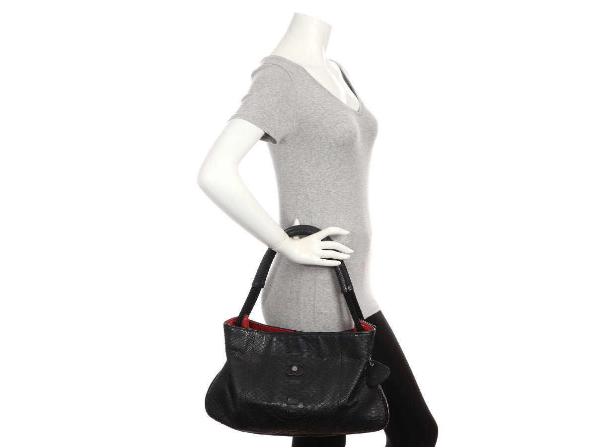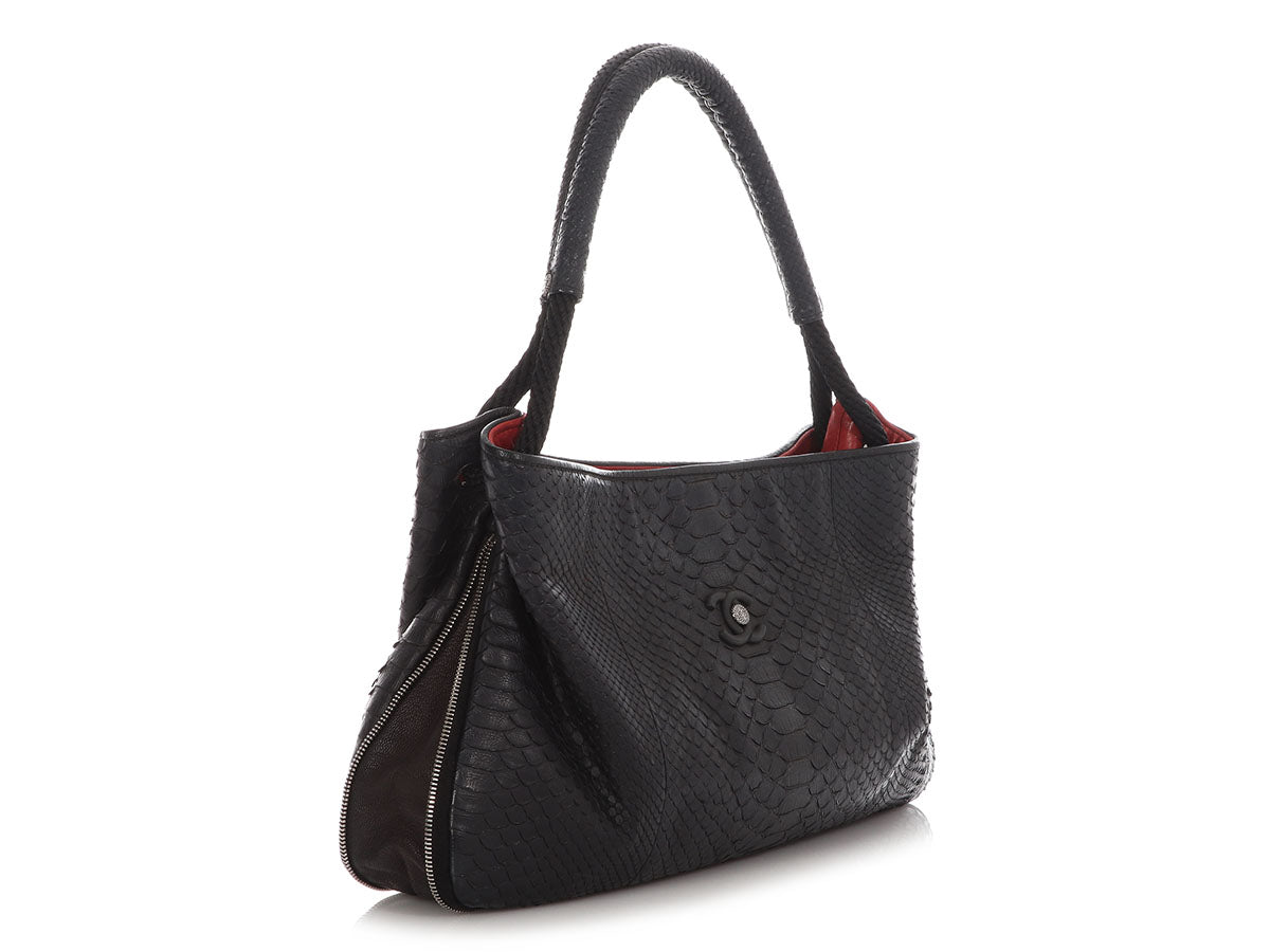Chanel‘s Black Python Expandable Yacht Hobo features a silver-tone zipper that goes around the bottom and up the sides to enlarge it! No two python skins are alike making this hobo unique. The front face has a python CC logo with a small medallion at the center and the open top has a magnetic closure at the center. Lined in burgundy leather, it has one zipped and two slide pockets inside, and the python strap has a 9-inch drop. In previously loved condition from 2013-14, it has most of the wear and stains inside plus some marks on the skin. As of May 16, 2019, Chanel has stopped crafting bags and accessories with exotic leathers like python and others making this a highly coveted item!