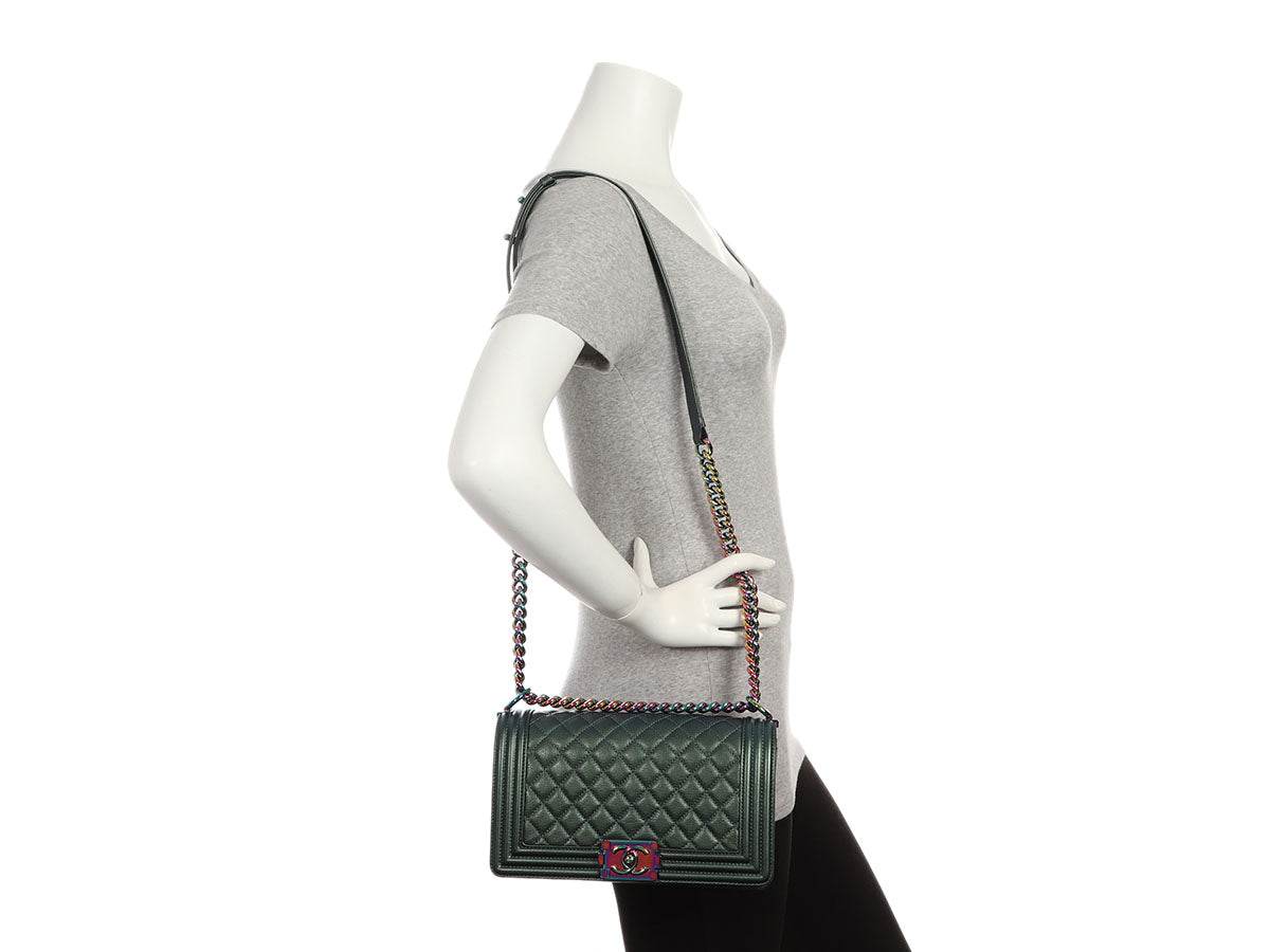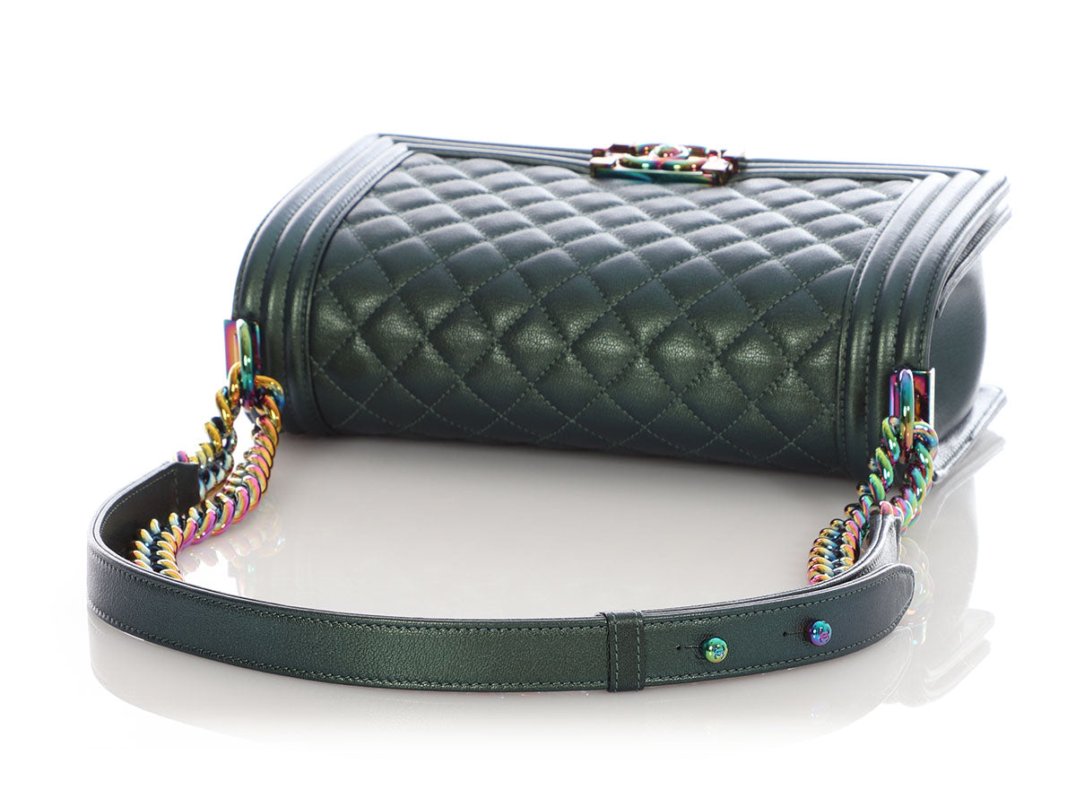 This Chanel Old Medium Iridescent Green Quilted Goatskin Boy is gorgeous especially with the rainbow hardware! The faces are diamond quilted, the edges are channel stitched, and the flap opens by squeezing the sides of the logo clasp. The black-fabric interior has one slide pocket and the chain-and-leather strap with a leather shoulder pad has a drop of 11 inches when doubled and 19 inches when let out to its crossbody length. In very good condition from 2014-15, it comes with a dustbag, box, and has a little wear inside and a few marks on the leather. This Boy has a very cool color palette for fall or any time of year!