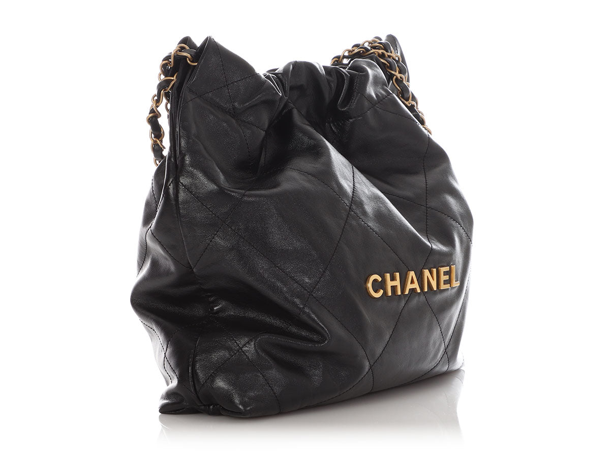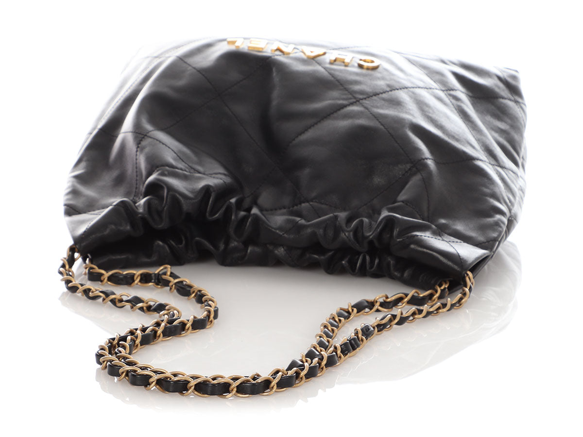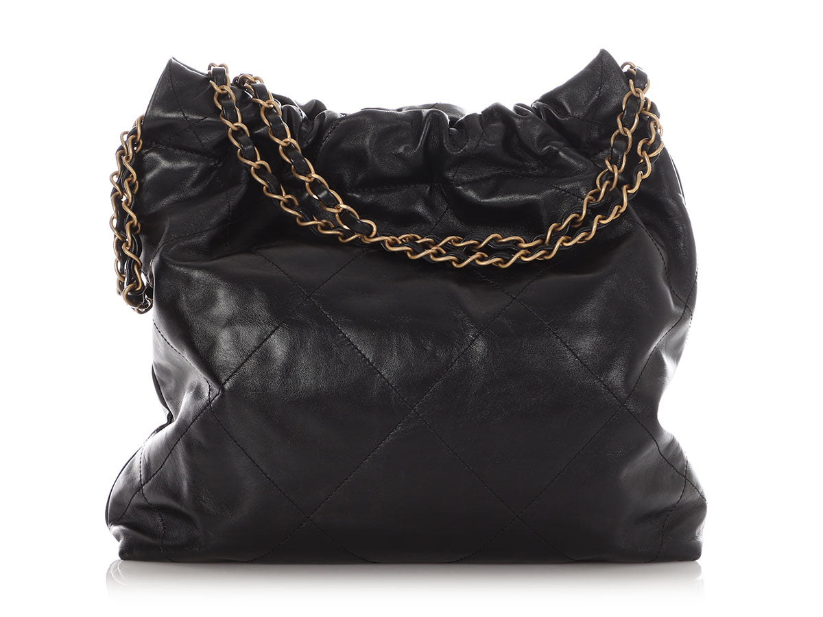 Chanel’s Small Black Quilted Shiny Calfskin 22 is a charming tote with a top gathered by the dual leather-and-chain straps that run through it! It’s paired with antiqued gold-tone hardware evident in the nameplate on the front and the faces are made of large, flat, diamond-quilted lightweight leather with sides that snap in. There is a hidden magnetic clasp that brings the open top in and the black-satin interior has one zippered pocket plus a leather zippered case. The interior has the new date stamping and it’s in great condition and comes with a dustbag and has wear inside and inside the zippered case, and a few marks on the exterior leather. This slouchy-cool bag has dual shoulder straps with an 11-inch drop!