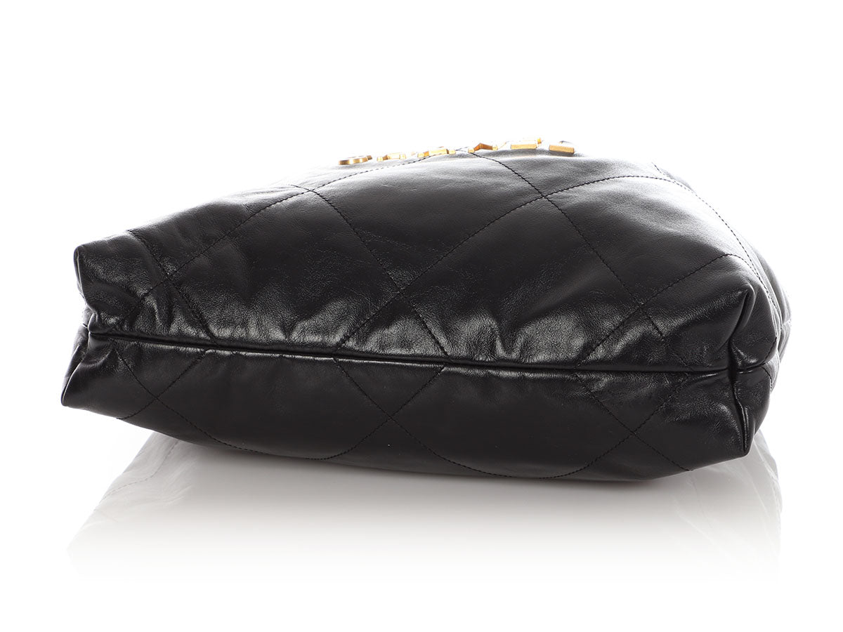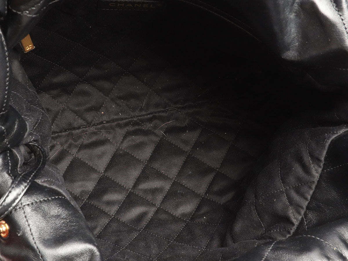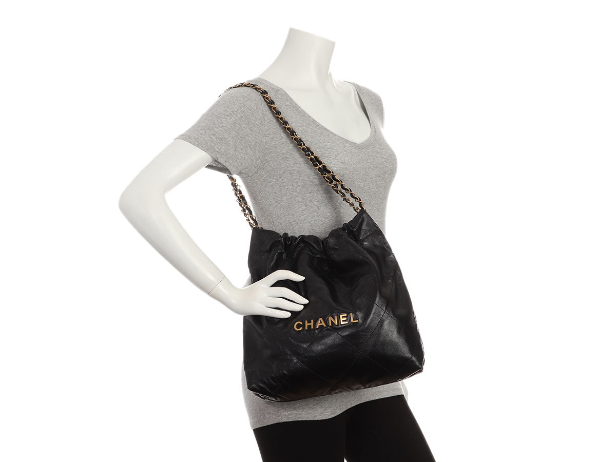 Chanel’s Small Black Quilted Shiny Calfskin 22 is a charming tote with a top gathered by the dual leather-and-chain straps that run through it! It’s paired with antiqued gold-tone hardware evident in the nameplate on the front and the faces are made of large, flat, diamond-quilted lightweight leather with sides that snap in. There is a hidden magnetic clasp that brings the open top in and the black-satin interior has one zippered pocket plus a leather zippered case. The interior has the new date stamping and it’s in great condition and comes with a dustbag and has wear inside and inside the zippered case, and a few marks on the exterior leather. This slouchy-cool bag has dual shoulder straps with an 11-inch drop!