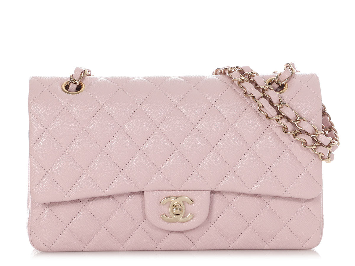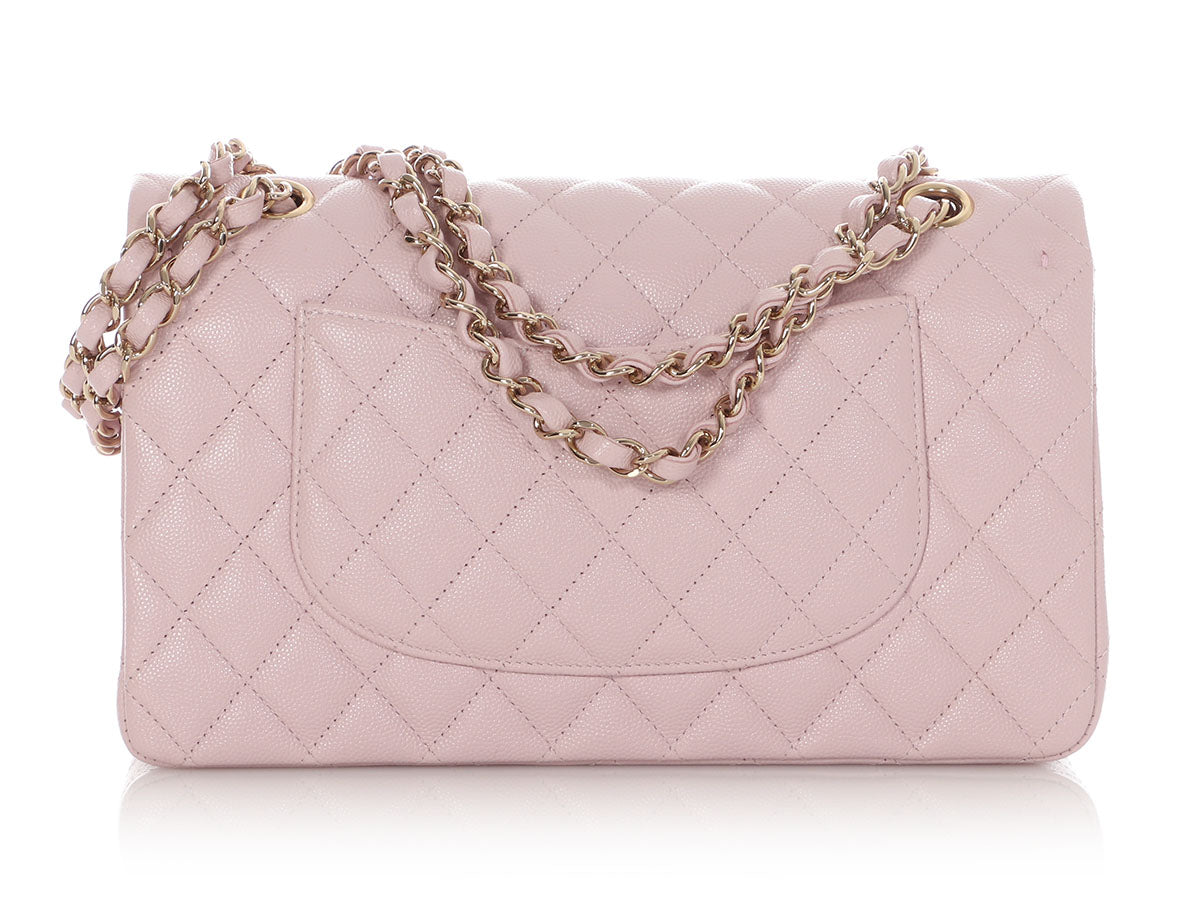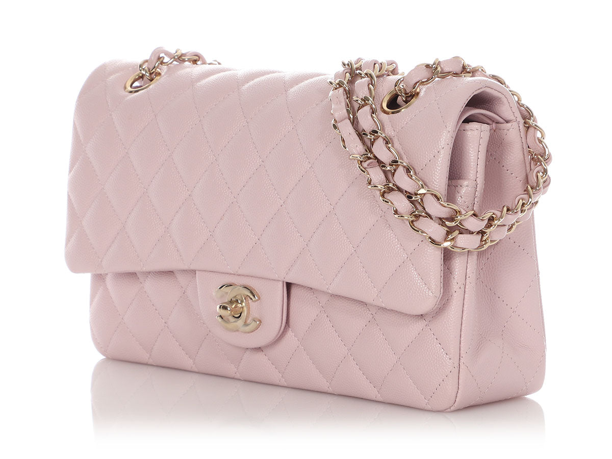 Chanel’s Medium/Large 21S Light Pink Rose Claire Classic Double Flap is highly collectible in a color known as Rose Claire Chaud in France! In light pink diamond-quilted Caviar leather, it’s paired with gold-tone hardware in the logo turnlock that opens the first flap to a zippered pocket on its underside and a slide pocket beneath it. The second flap is logo stitched on its underside and snaps over a slide pocket on the face, and the tonal-leather-lined interior has two slide pockets, while the back face has an additional slide pocket. The leather-and-chain strap can be worn as a shoulder bag with a 9-inch drop or worn singly for a longer shoulder drop of 16.5 inches. In excellent condition from 2021, it comes with a dustbag and box, and has light wear on the second flap from the zipper and scratches on the turnlock. As its French color name implies, this is one hot bag!