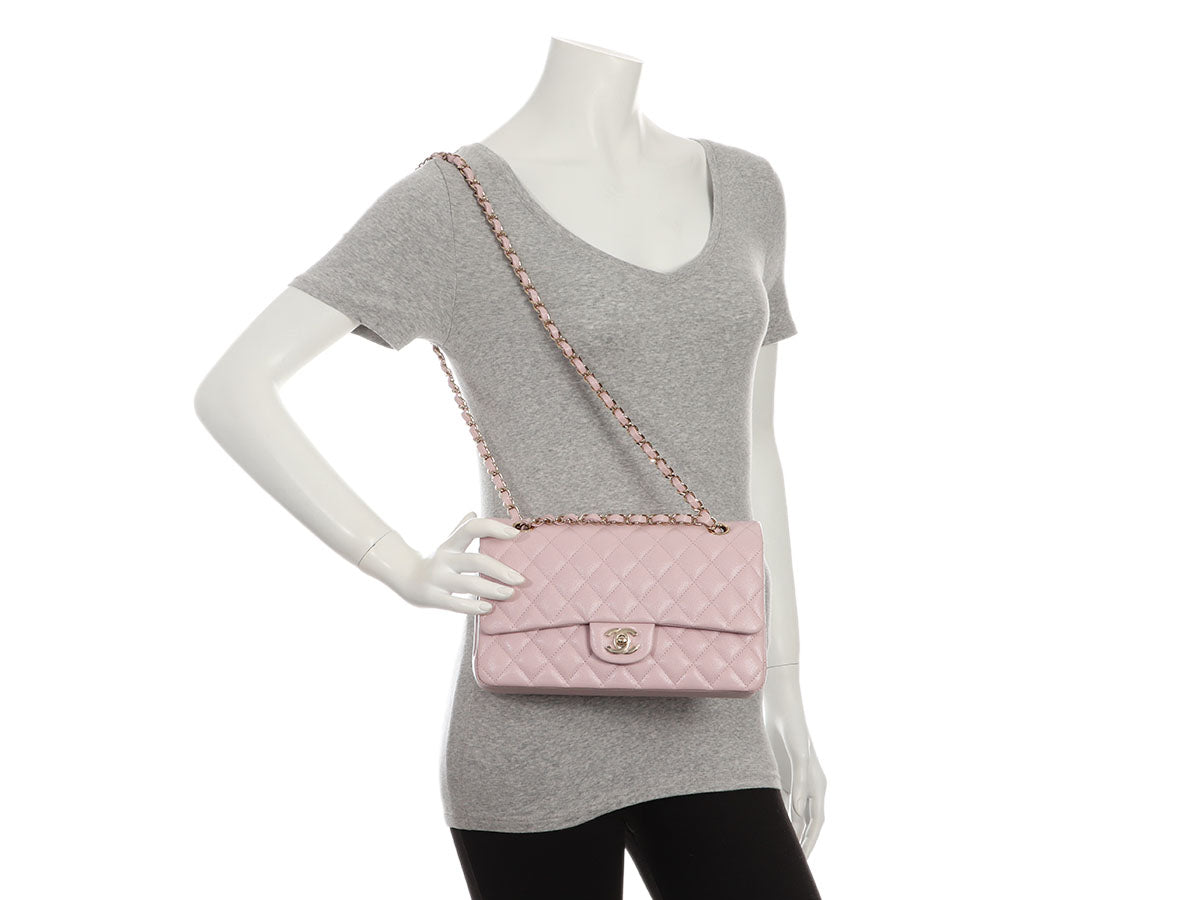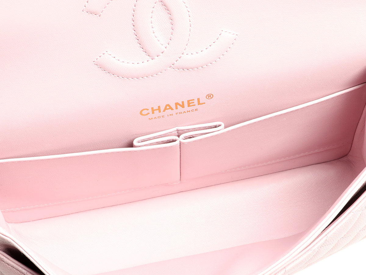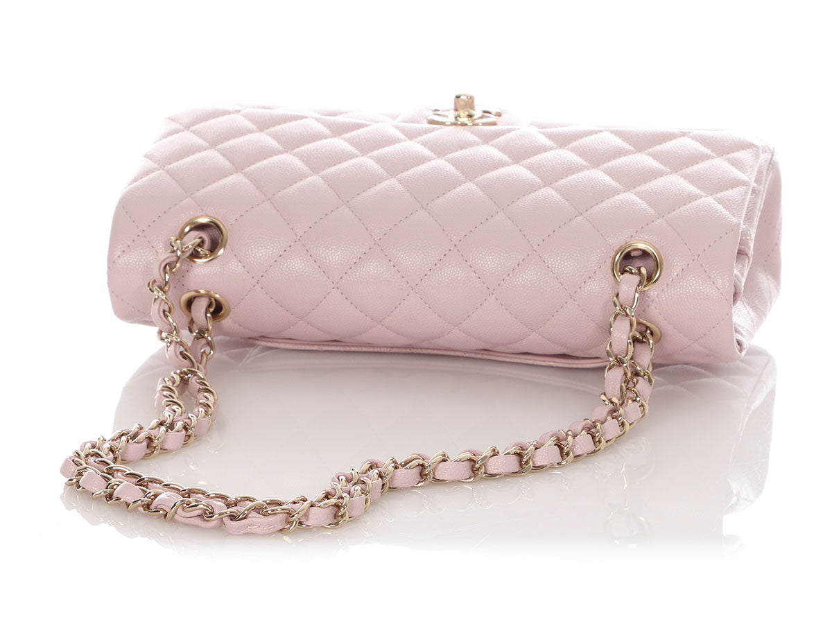 Chanel’s Medium/Large 21S Light Pink Rose Claire Classic Double Flap is highly collectible in a color known as Rose Claire Chaud in France! In light pink diamond-quilted Caviar leather, it’s paired with gold-tone hardware in the logo turnlock that opens the first flap to a zippered pocket on its underside and a slide pocket beneath it. The second flap is logo stitched on its underside and snaps over a slide pocket on the face, and the tonal-leather-lined interior has two slide pockets, while the back face has an additional slide pocket. The leather-and-chain strap can be worn as a shoulder bag with a 9-inch drop or worn singly for a longer shoulder drop of 16.5 inches. In excellent condition from 2021, it comes with a dustbag and box, and has light wear on the second flap from the zipper and scratches on the turnlock. As its French color name implies, this is one hot bag!
