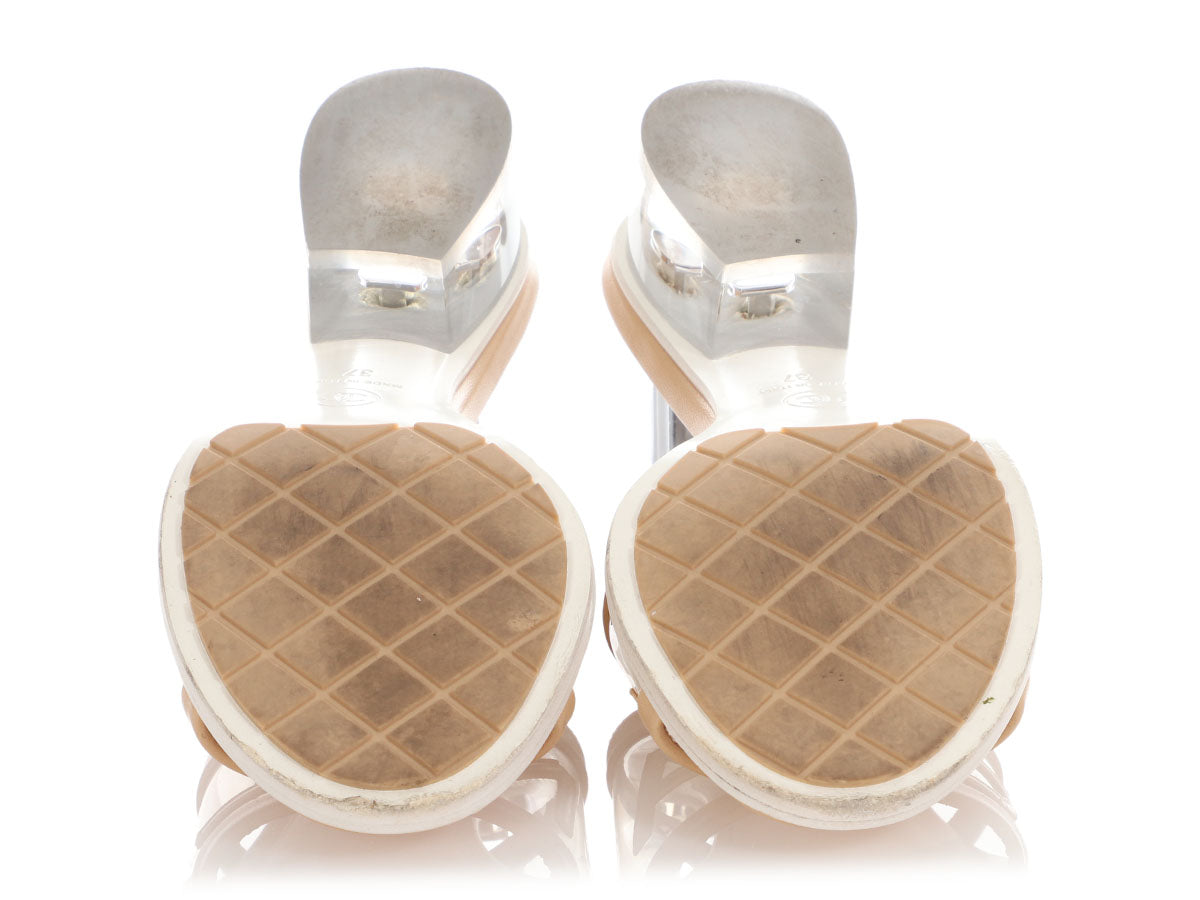 Chanel’s 2019 Beige Leather and PVC Slide Sandals are a playful nod to logo lovers with a modern, see-through twist! These slip-on sandals sport the Chanel name across the straps and feature 1.25-inch chunky clear lucite heels. Silver CC tabs above the heels lend a subtle signature touch. In very good condition with two dustbags, they have wear on the leather-and-rubber soles, light wear on the leather inners, and a few marks on the PVC that may clean up with care. These cute sandals are sure to leave the most luxurious of tan lines!