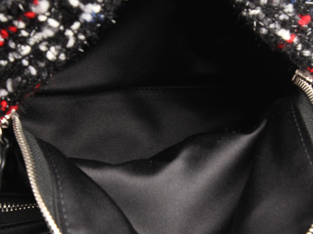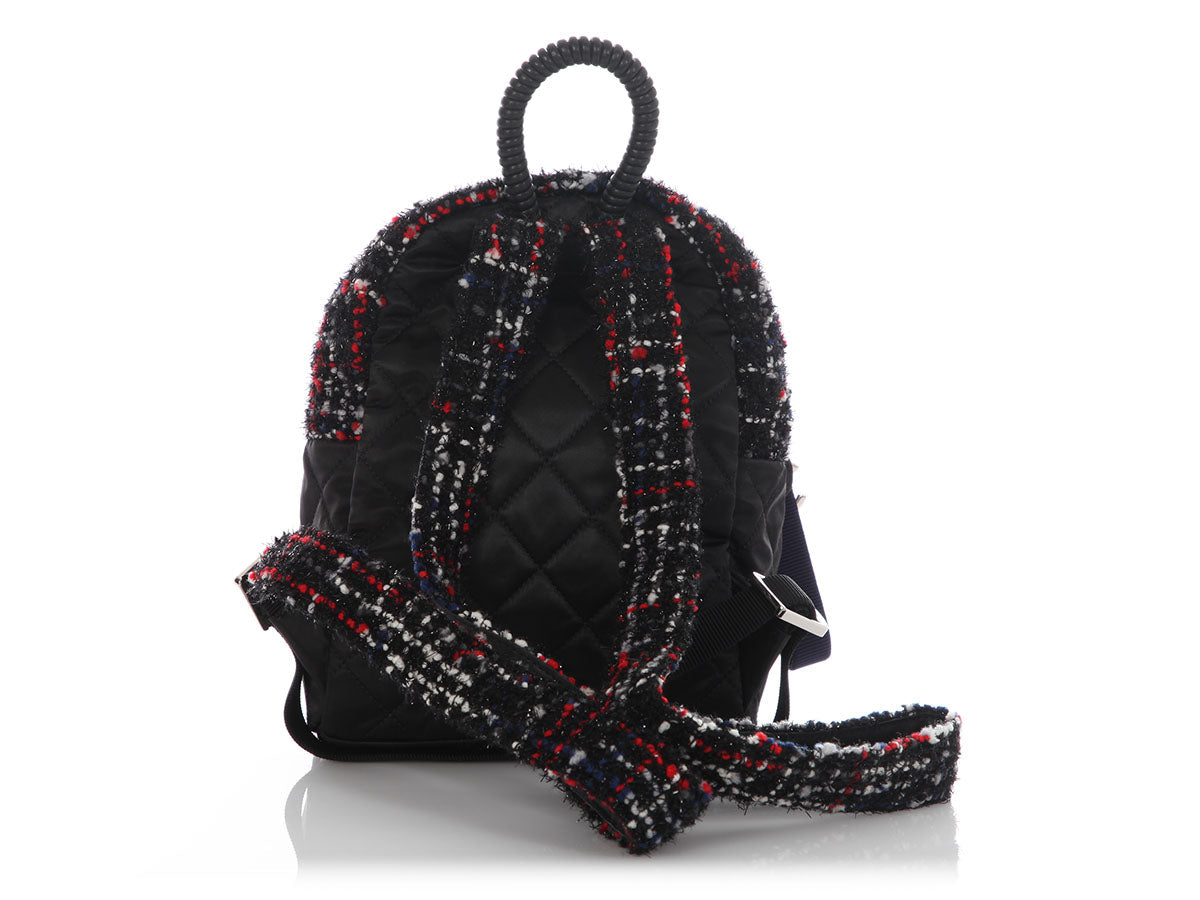 Chanel’s Mini Black Tweed and Satin Backpack is a playful blend of texture and charm! Designed with a mix of black, red, and white tweed and diamond-quilted black satin, it’s trimmed with black leather with silver hardware and one zipped pocket on the front. The top zips closed with a CC logo zipper pull, while the 2-inch top handle and adjustable backpack straps offer styling flexibility. In great condition from 2017-2018 with a dustbag and box, it has a small mark on the bottom and wear on the hardware. With its compact size and Coco-approved combo of materials, this little backpack packs a fashionable punch!