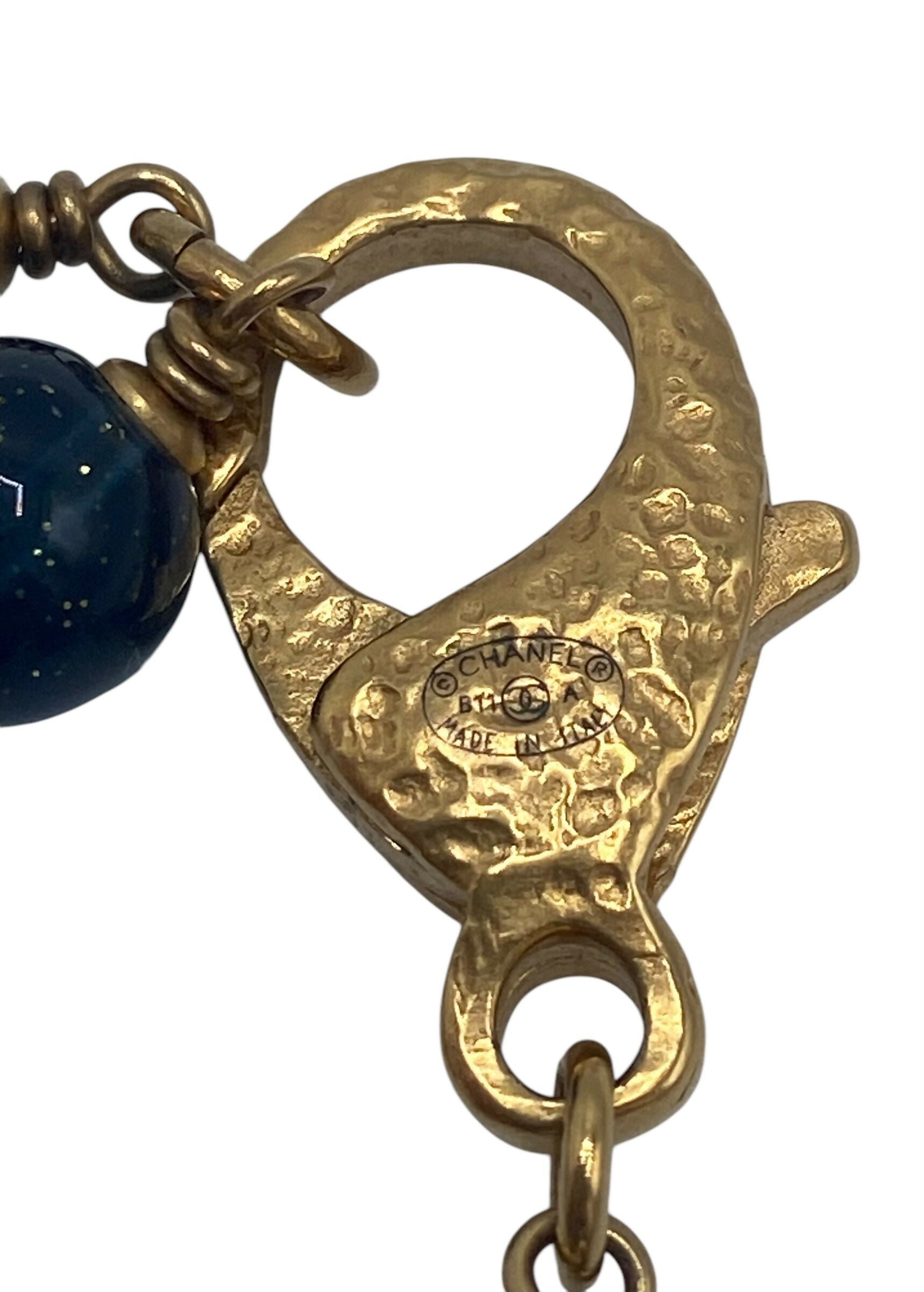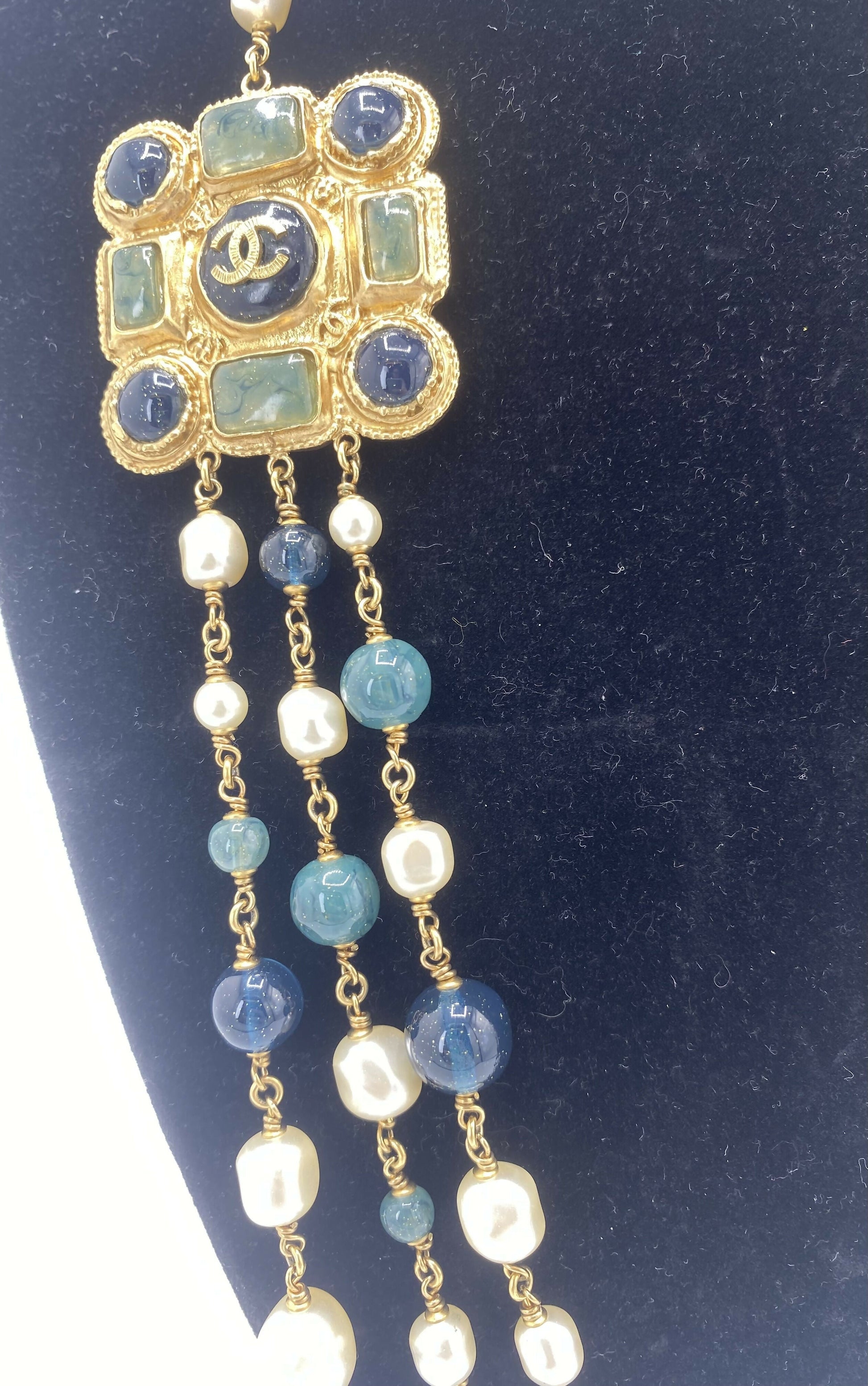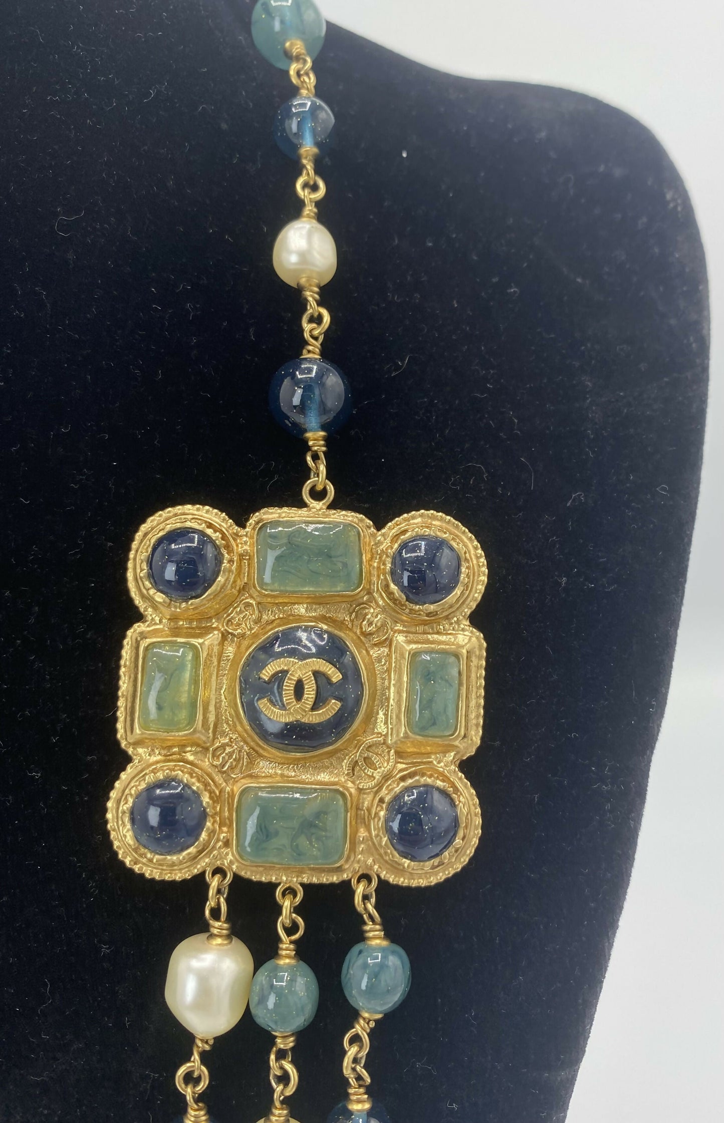 This elegant necklace features an array of faux pearls, texturized CC logos, 2 Large Medallions, and translucent glitter Pearl, Blue, Green, Jade Color glittered beads suspended from a brushed light gold chain.