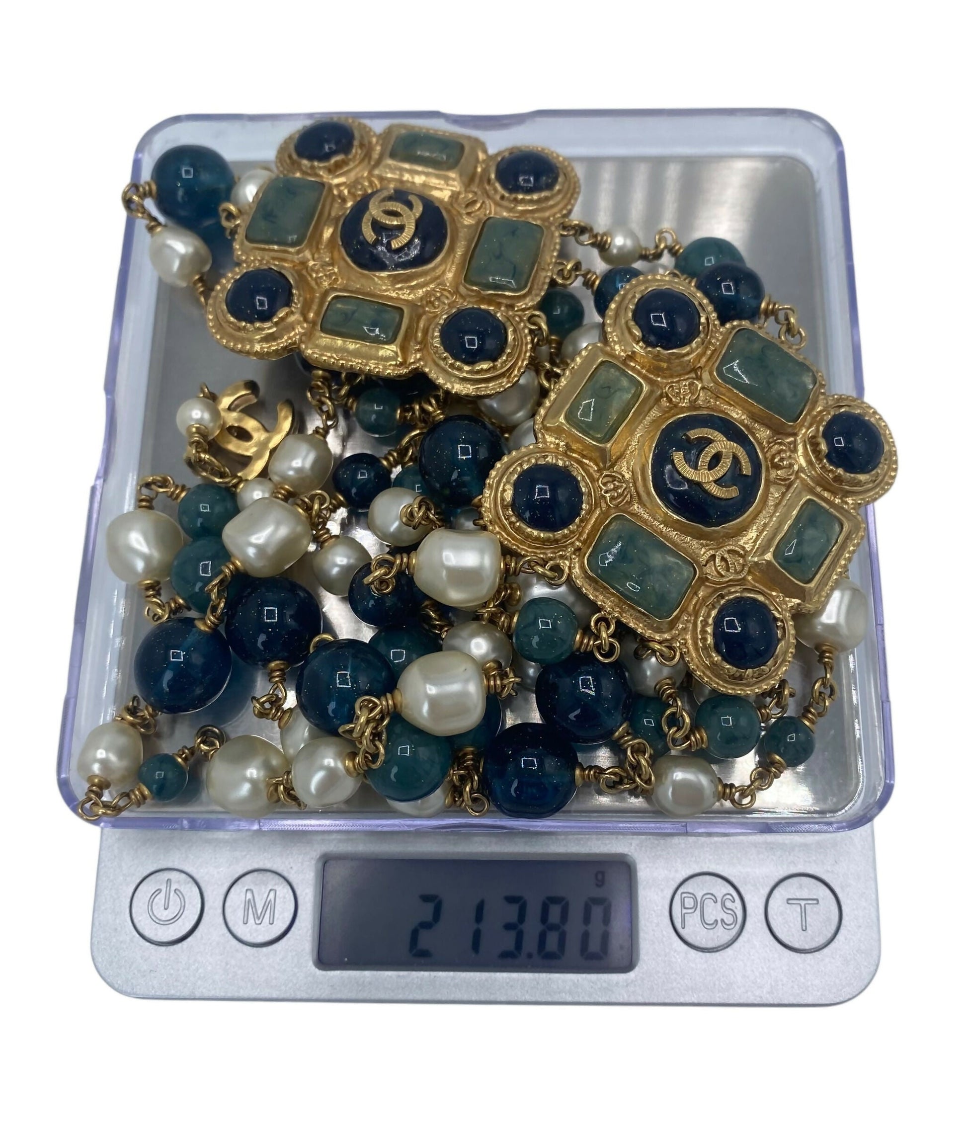 Chanel 11A Paris-Byzance 3 Strand Pearl Medallion Gold Green Blue Necklace/Belt