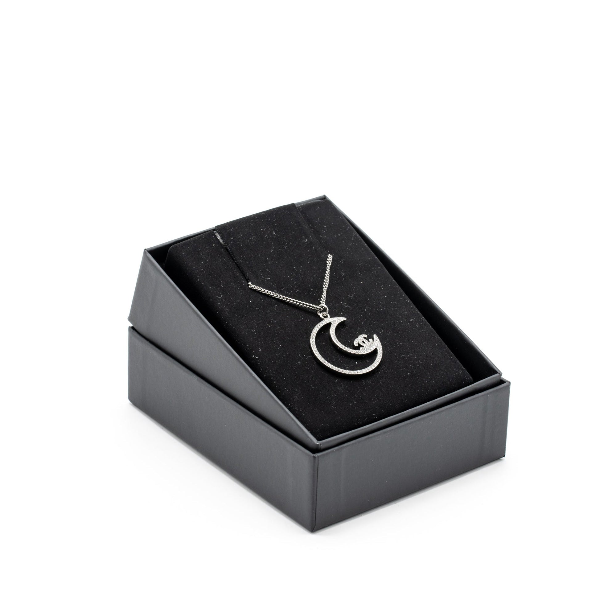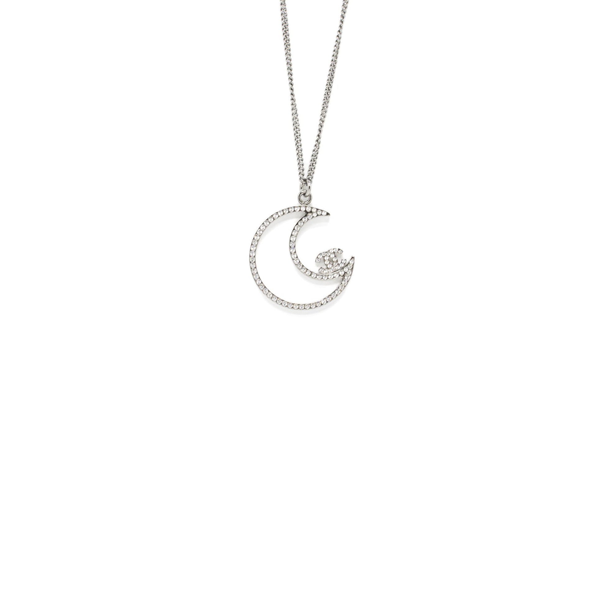 Chanel 17K Moon with CC Logo Necklace Crystal Silver Tone