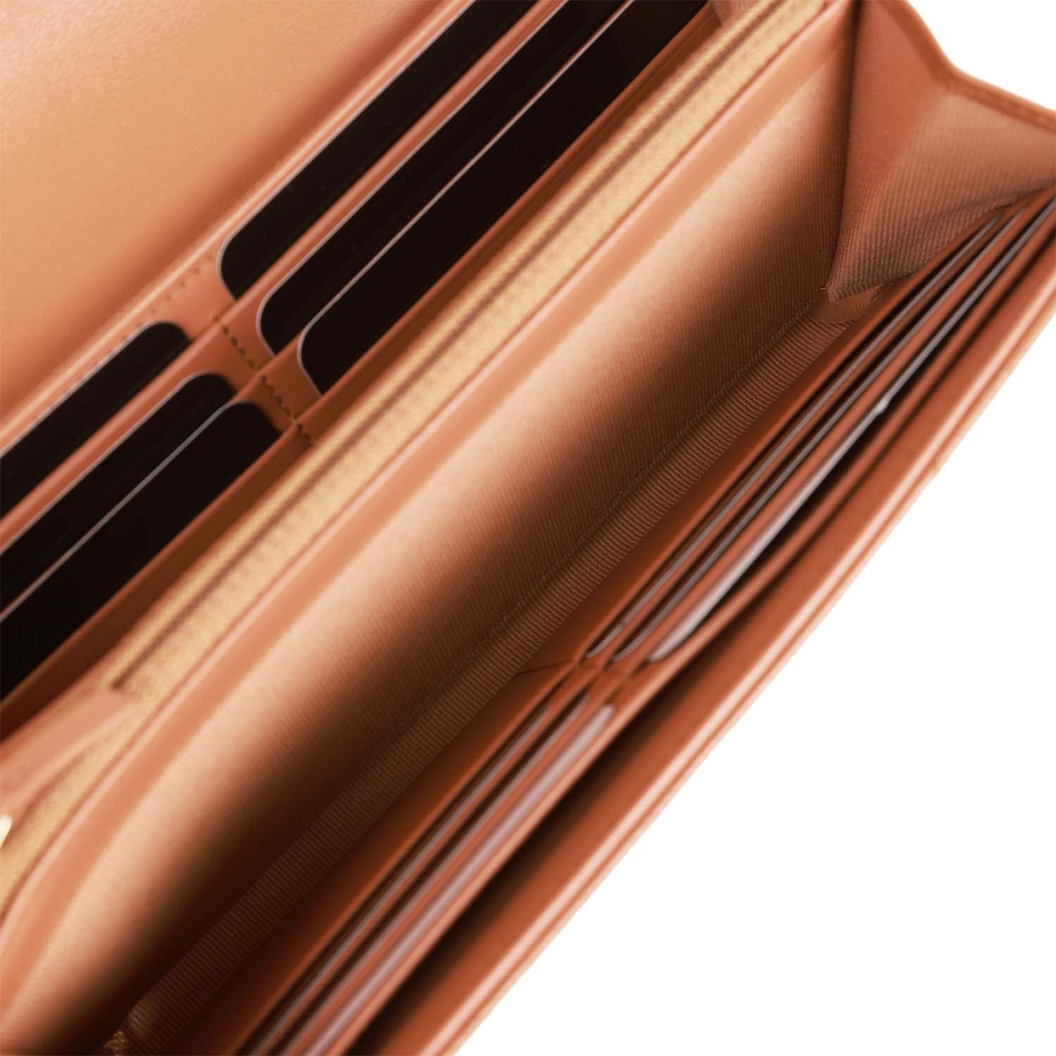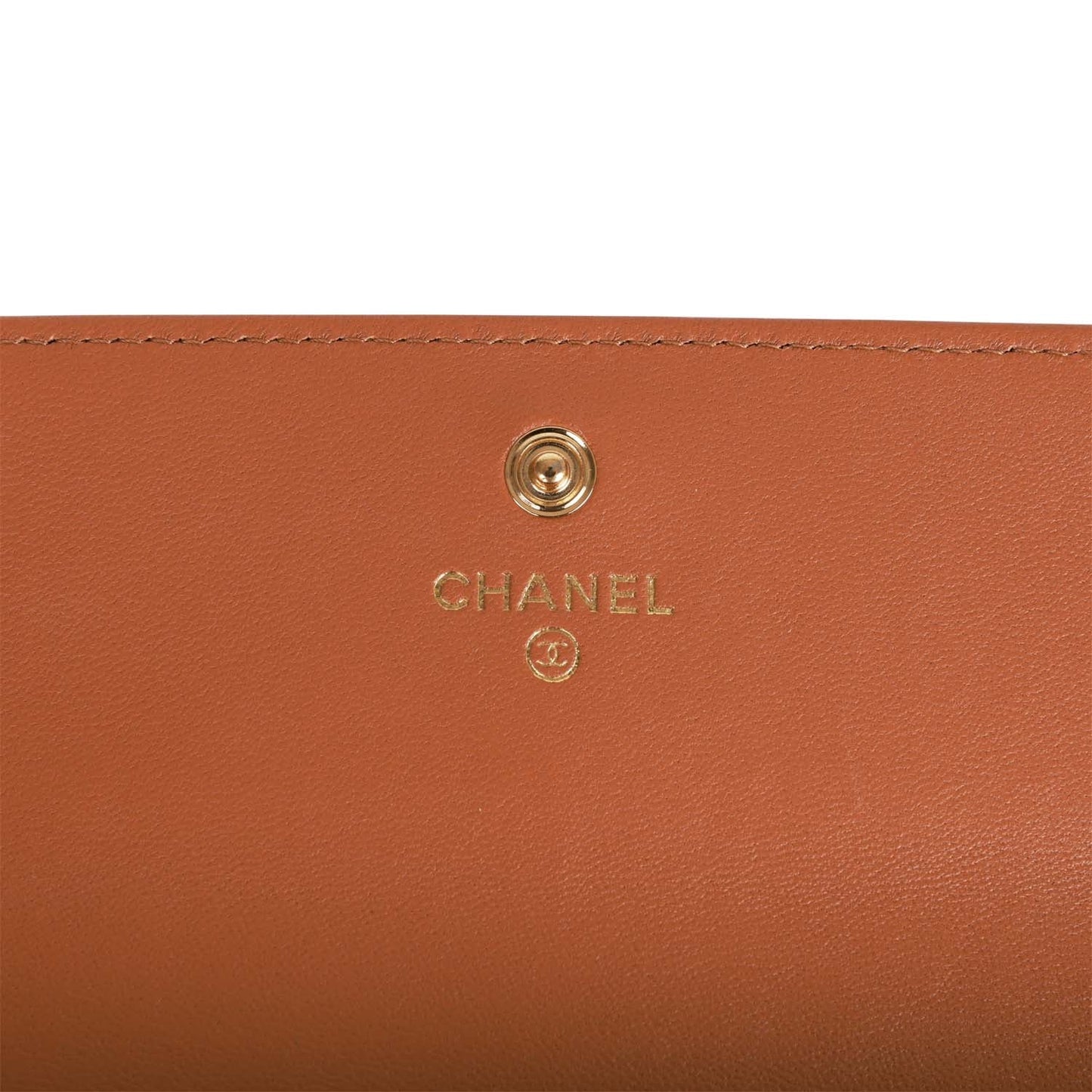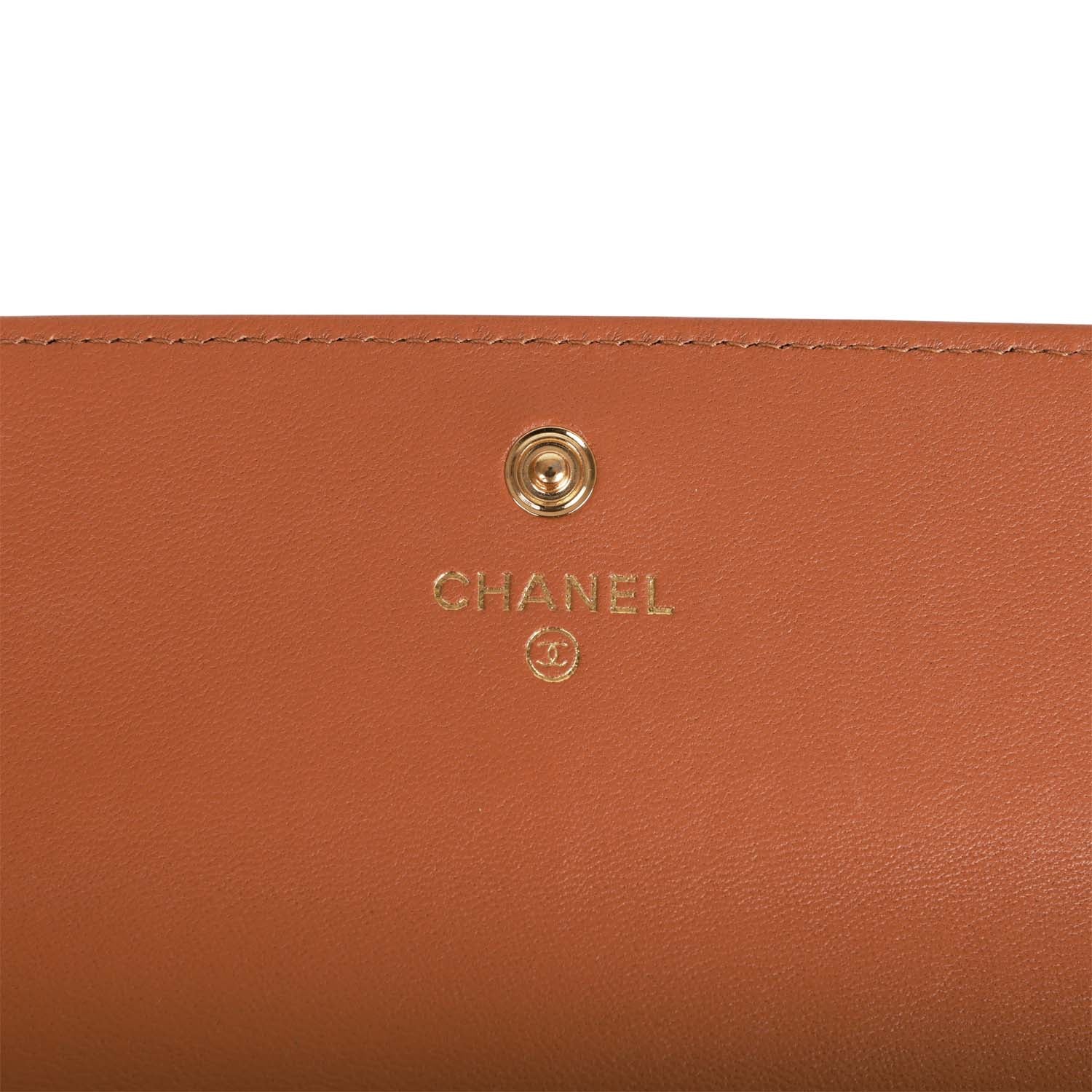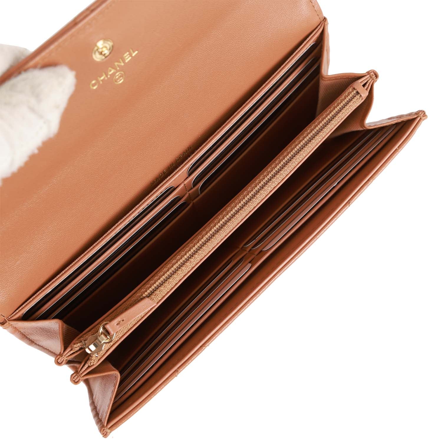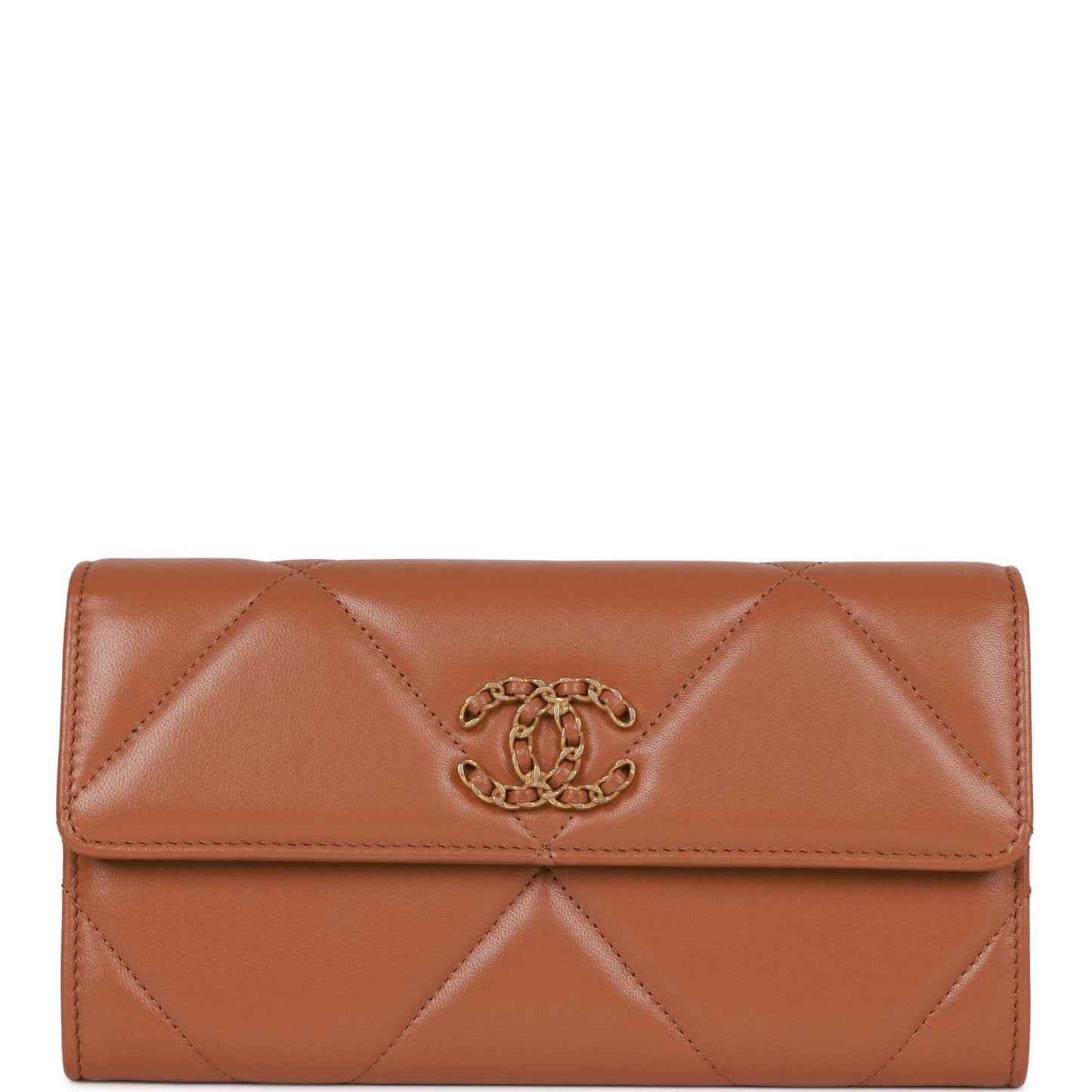 This Chanel 19 Large Flap Wallet is of Brown lambskin with gold hardware and features a Classic CC logo, signature diamond quilting and front flap snap closure.