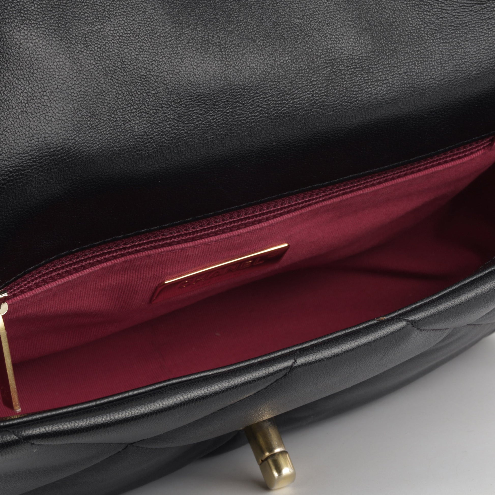 - ‘Chanel’ engraved in metal hardware plaque