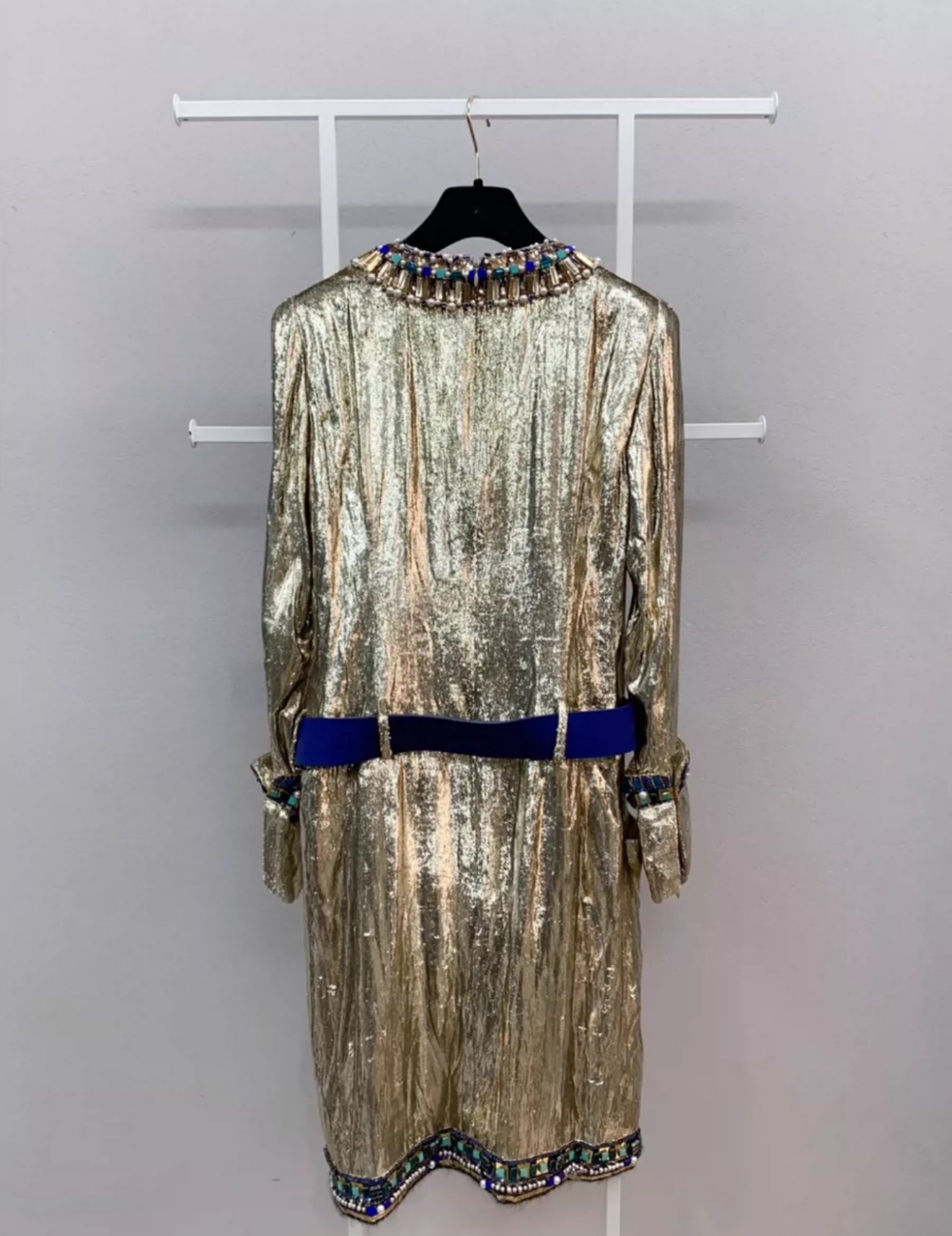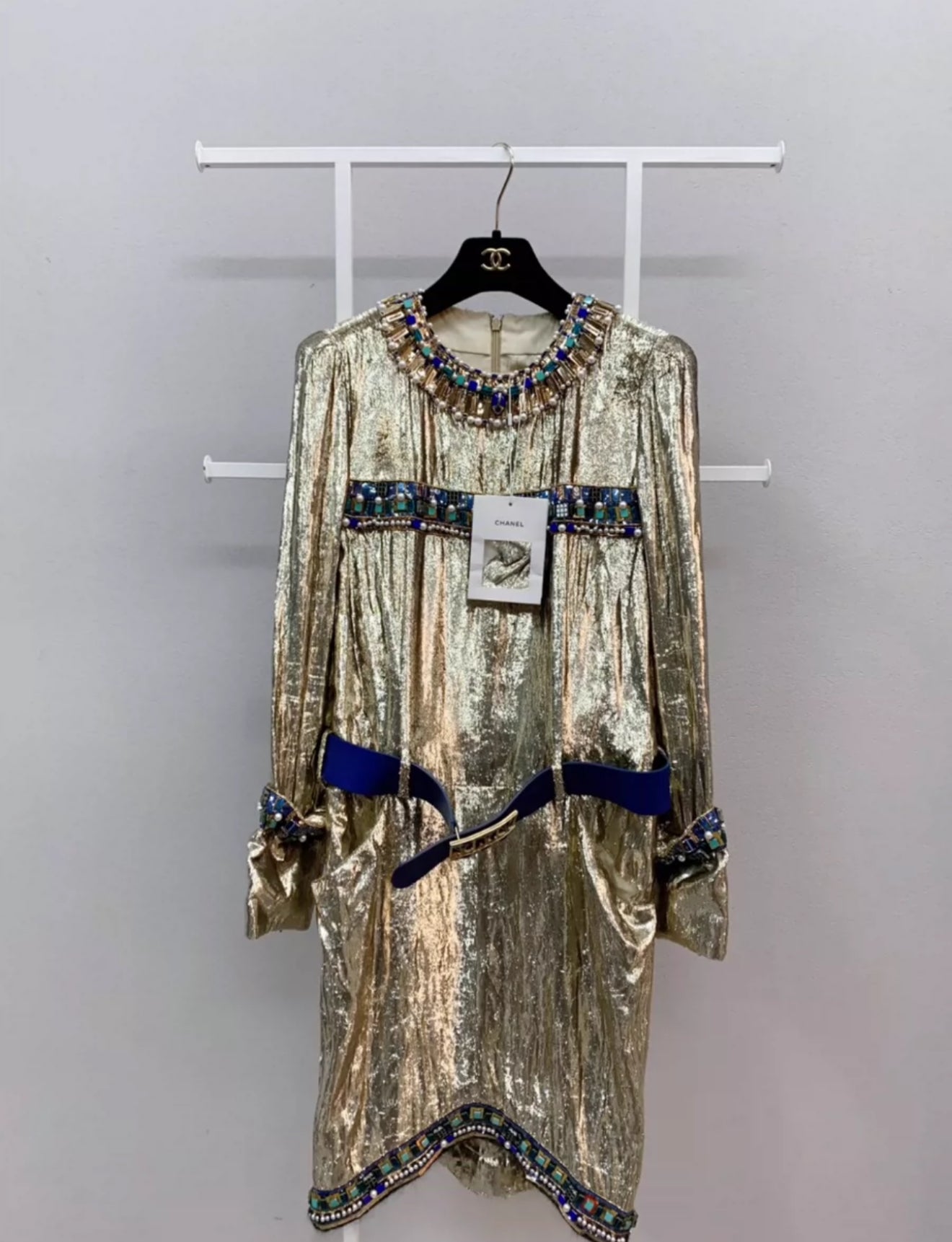 Chanel 19A Embroidered Velvet Light Gold Belt Dress