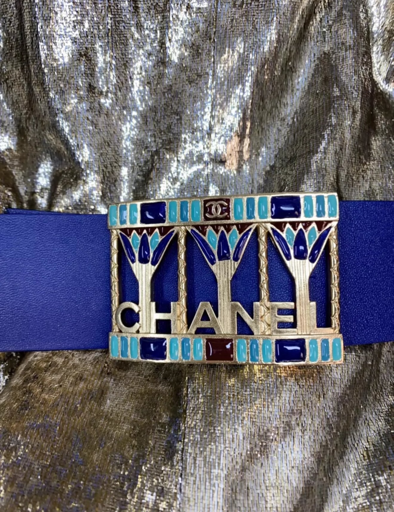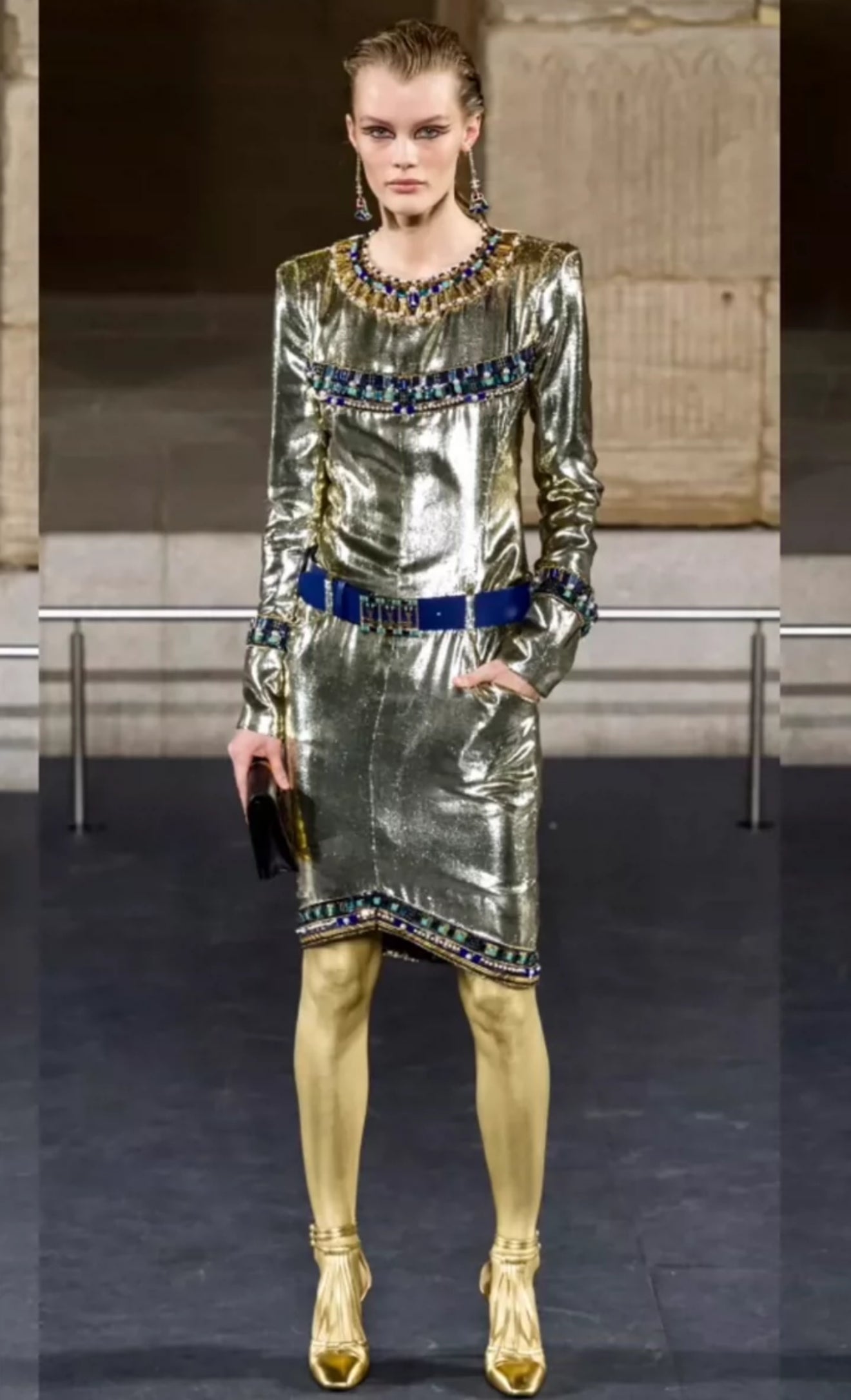 Expertly crafted by Chanel, the Chanel 19A Embroidered Velvet Light Gold Belt Dress showcases Egyptian influence on the runway with rare and unique details. Made for size, this dress is a true piece of art with intricate embroidery and a stunning light gold belt. Size 38