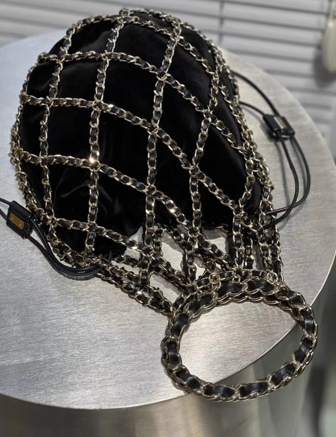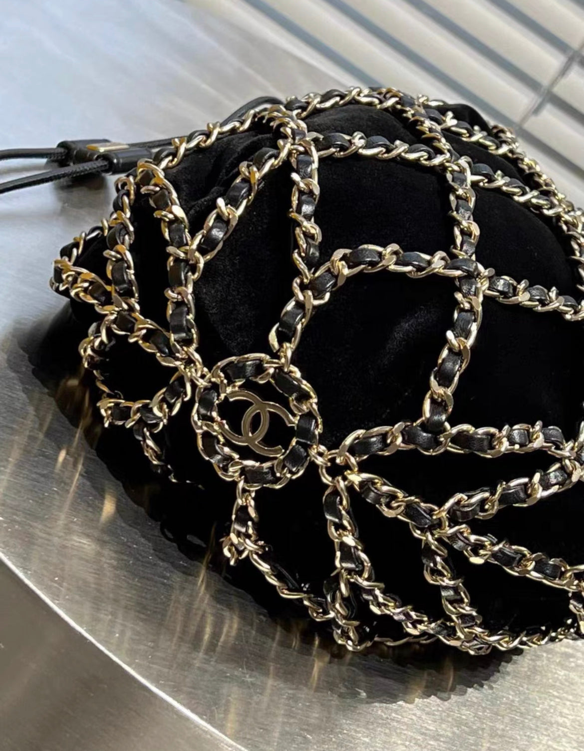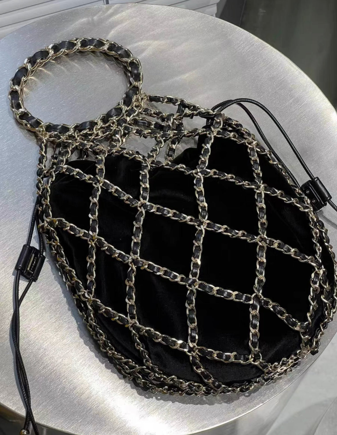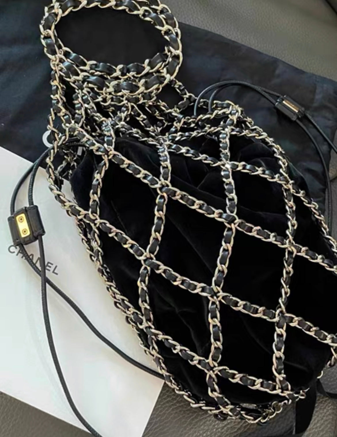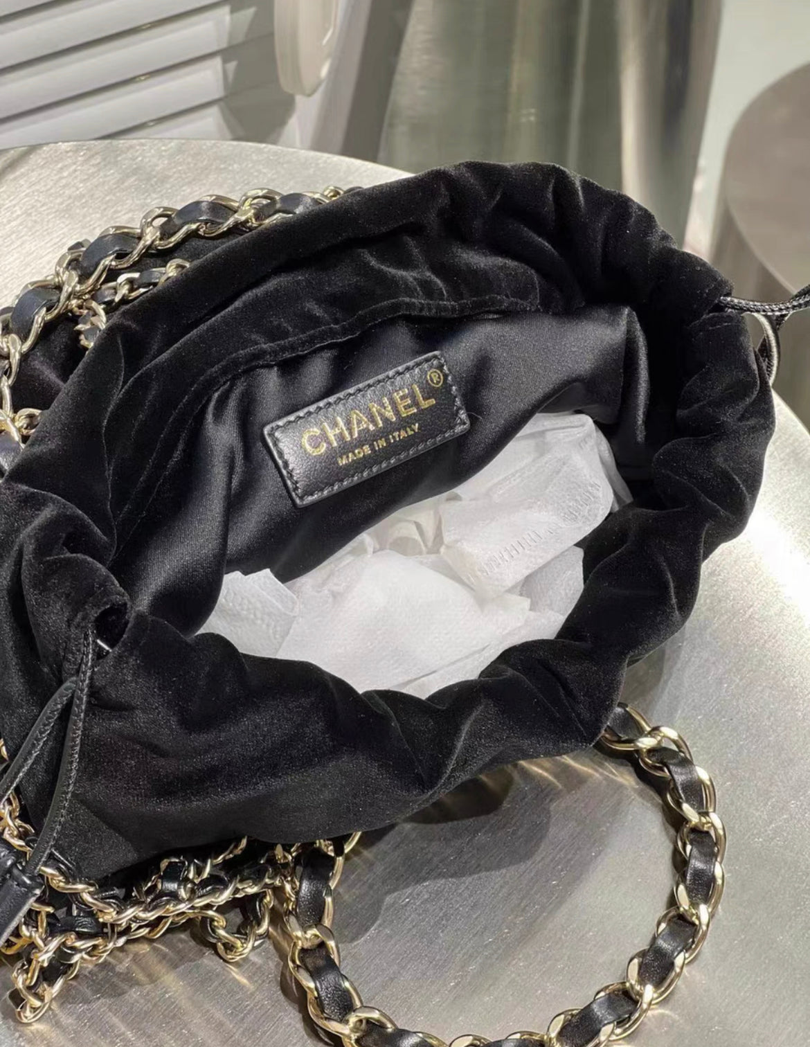 CHANEL 2021 RUNWAY BLACK VELVET DRAWSTRING BAG WITH GOLD HARDWARE