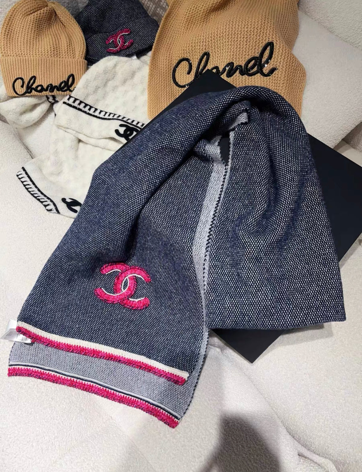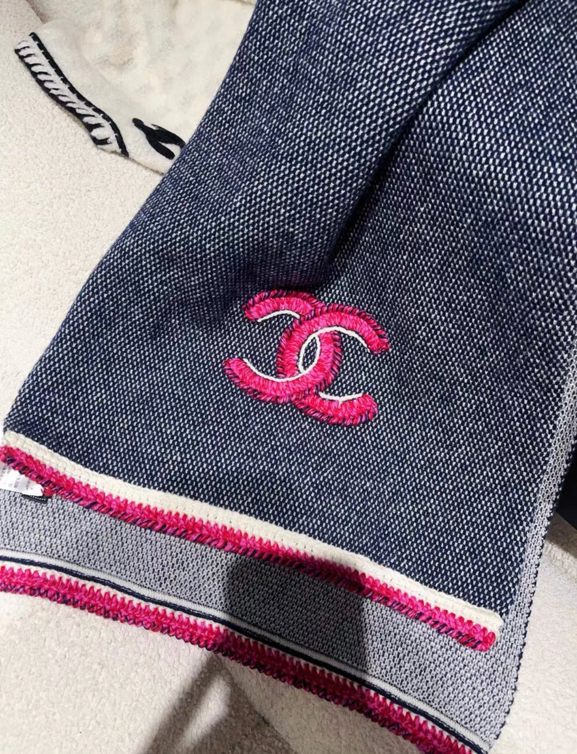 Stay warm and stylish with the Chanel 20A cashmere scarf. Featuring a beautiful blue gray and pink color, this scarf is made of luxurious cashmere for ultimate comfort. Perfect for any occasion, it will keep you cozy while adding a touch of elegance to your outfit.