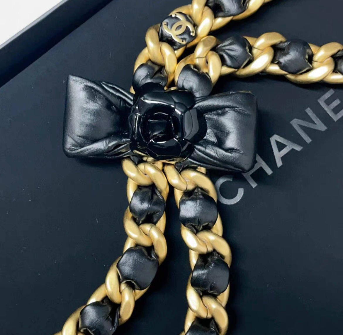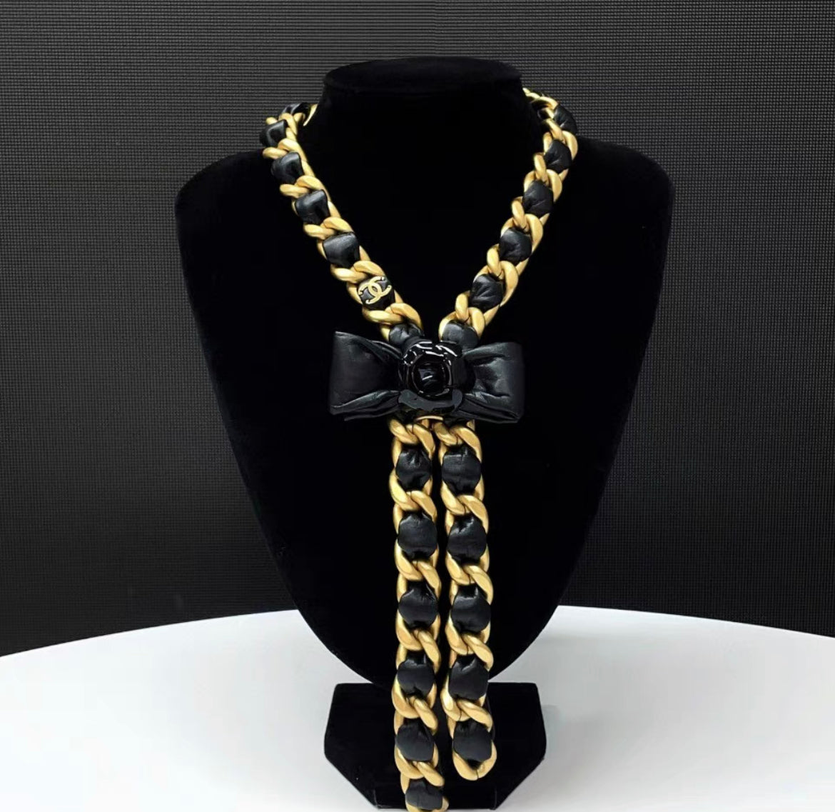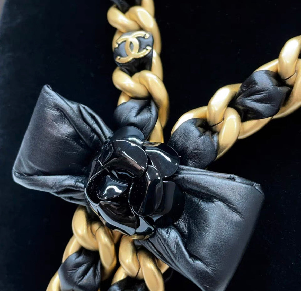 Elevate your outfit with the rare and elegant Chanel 20 tie style necklace. Crafted with a gold and black ribbon bow and adorned with a beautiful camellia flower, this necklace adds a touch of sophistication to any look. The luxurious leather chain ensures comfort and durability.