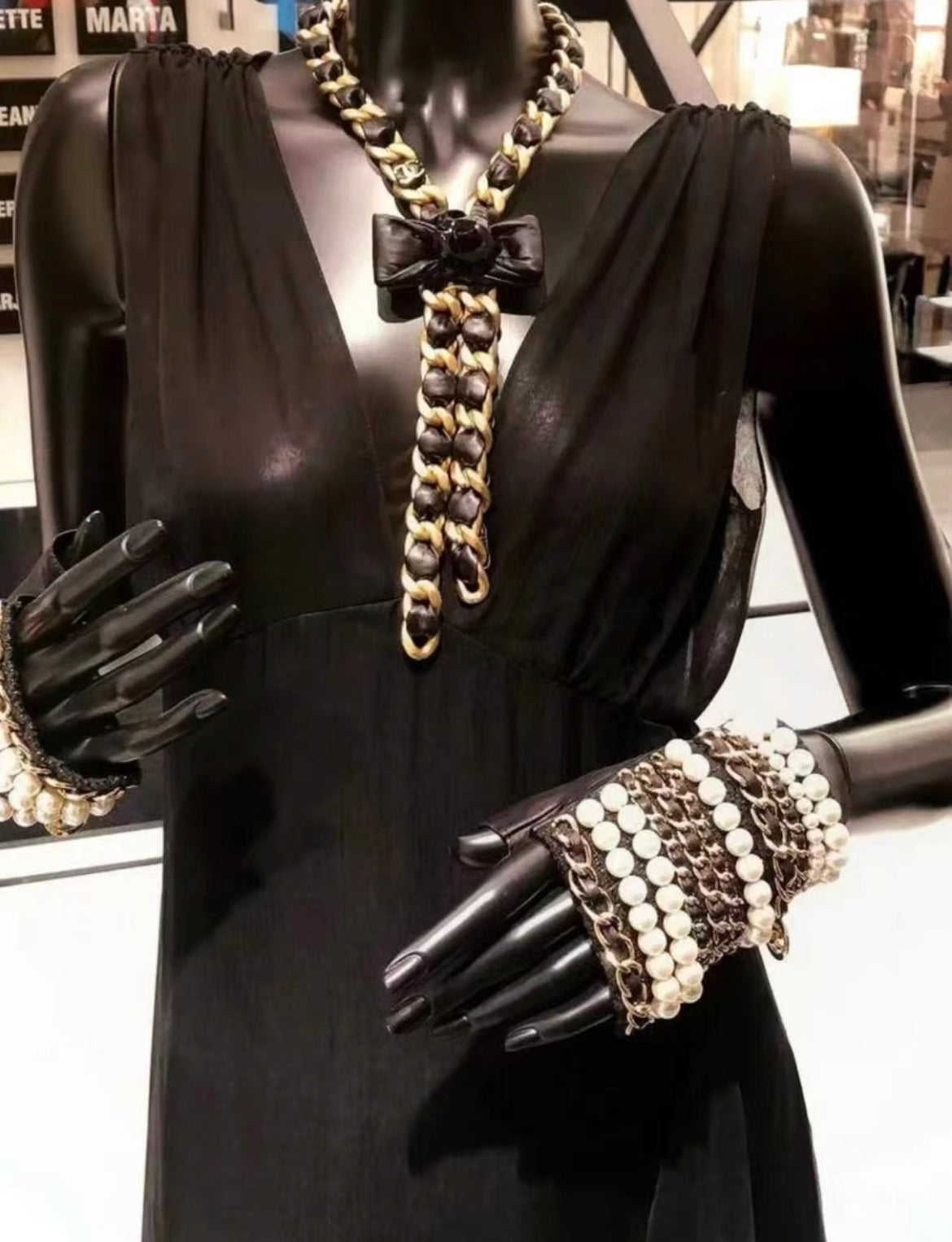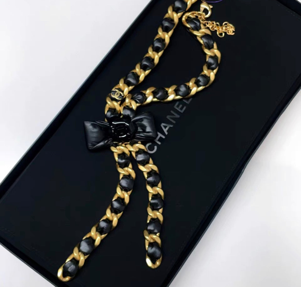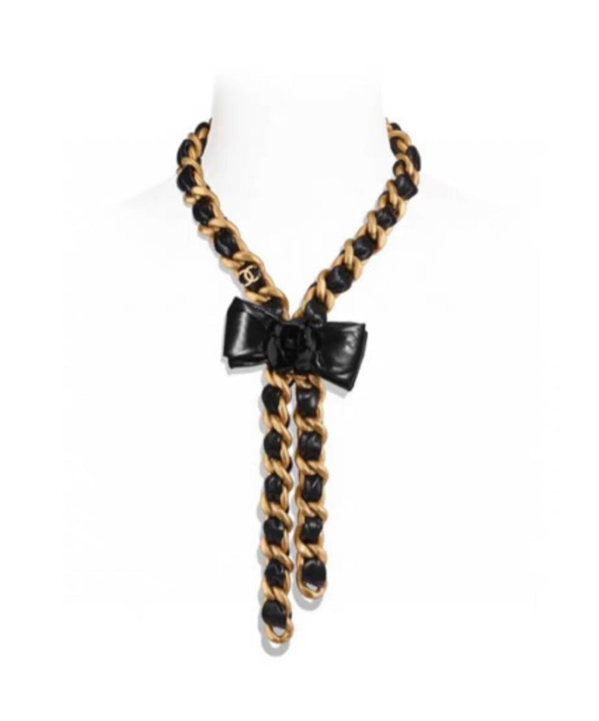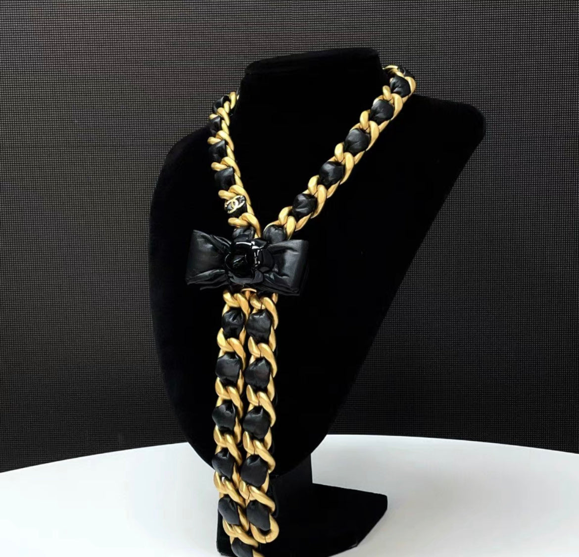 Elevate your outfit with the rare and elegant Chanel 20 tie style necklace. Crafted with a gold and black ribbon bow and adorned with a beautiful camellia flower, this necklace adds a touch of sophistication to any look. The luxurious leather chain ensures comfort and durability.