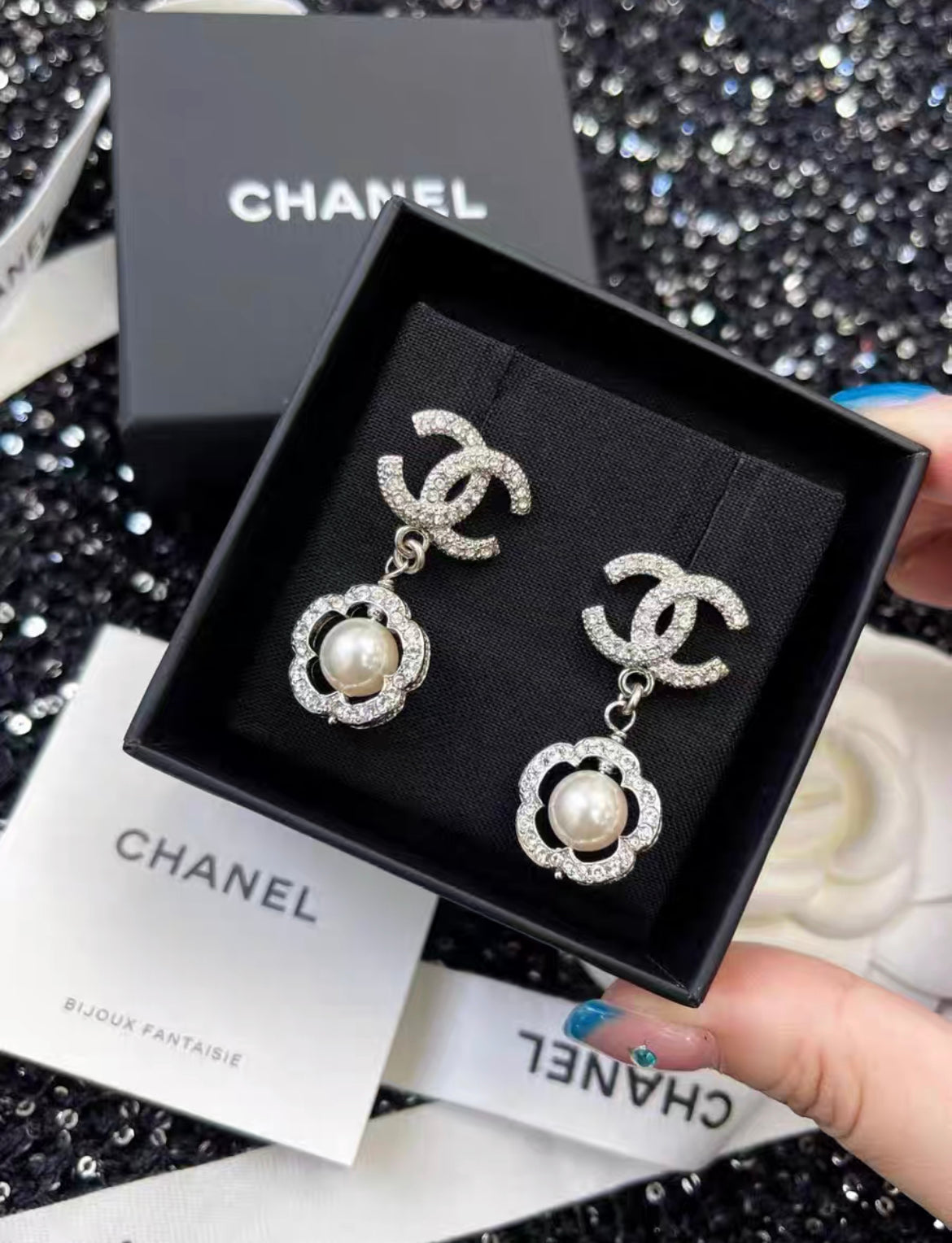Chanel 20P Double C Full Diamond Camellia Pearl Earrings