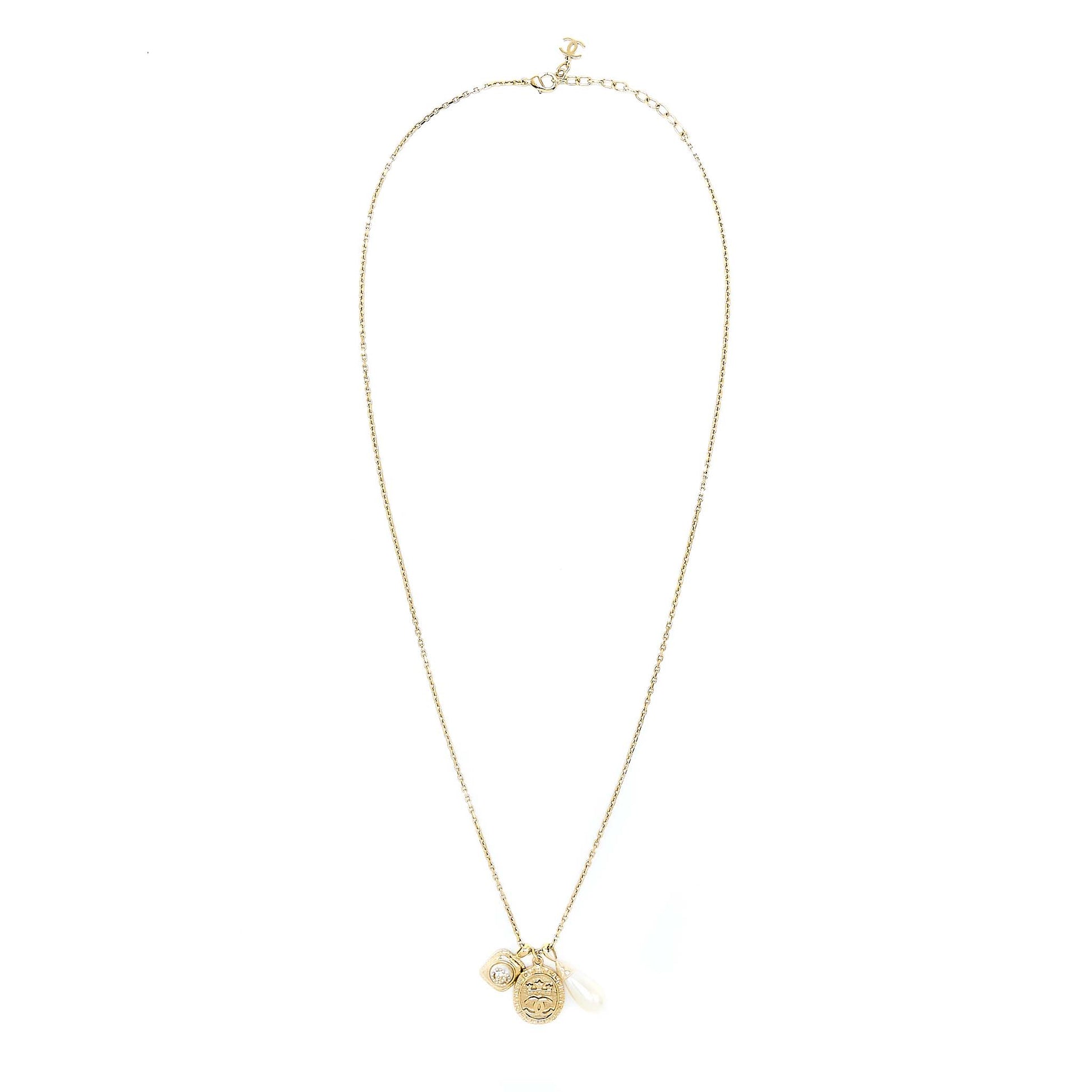 Chanel 21A Metal Plate And Crystal Necklace Brushed Gold Tone