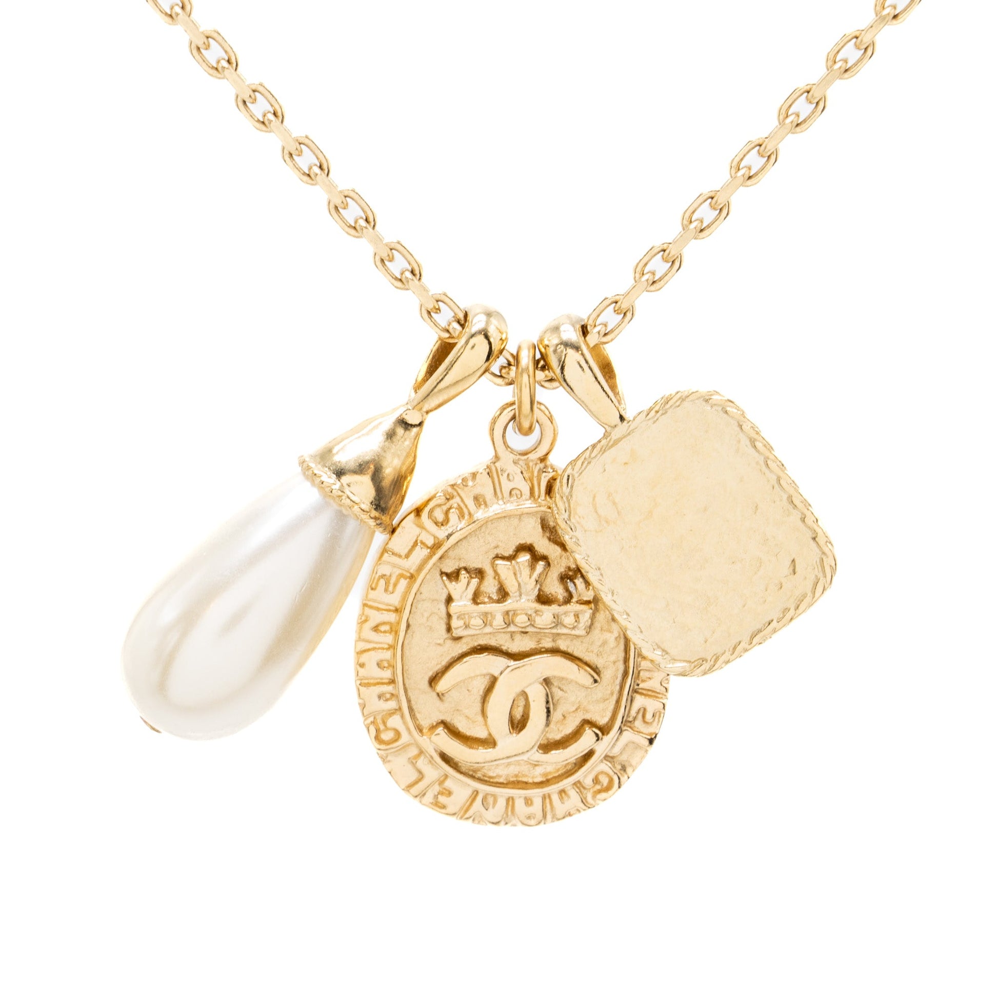 Chanel 21A Metal Plate Crystal Necklace Brushed Gold Tone