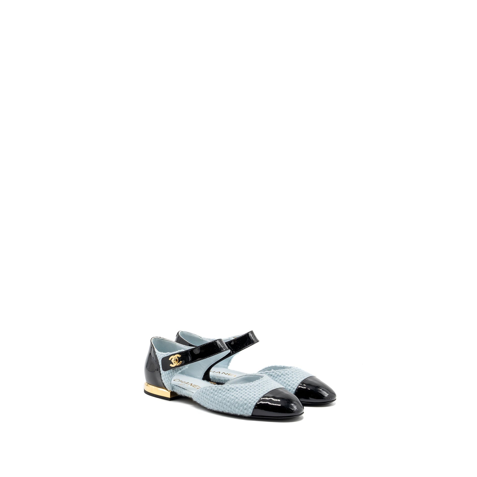 Chanel 21k Size 38 Ballerinas Flat Shoes Tweed/Patent Calfskin Light Blue/ Black