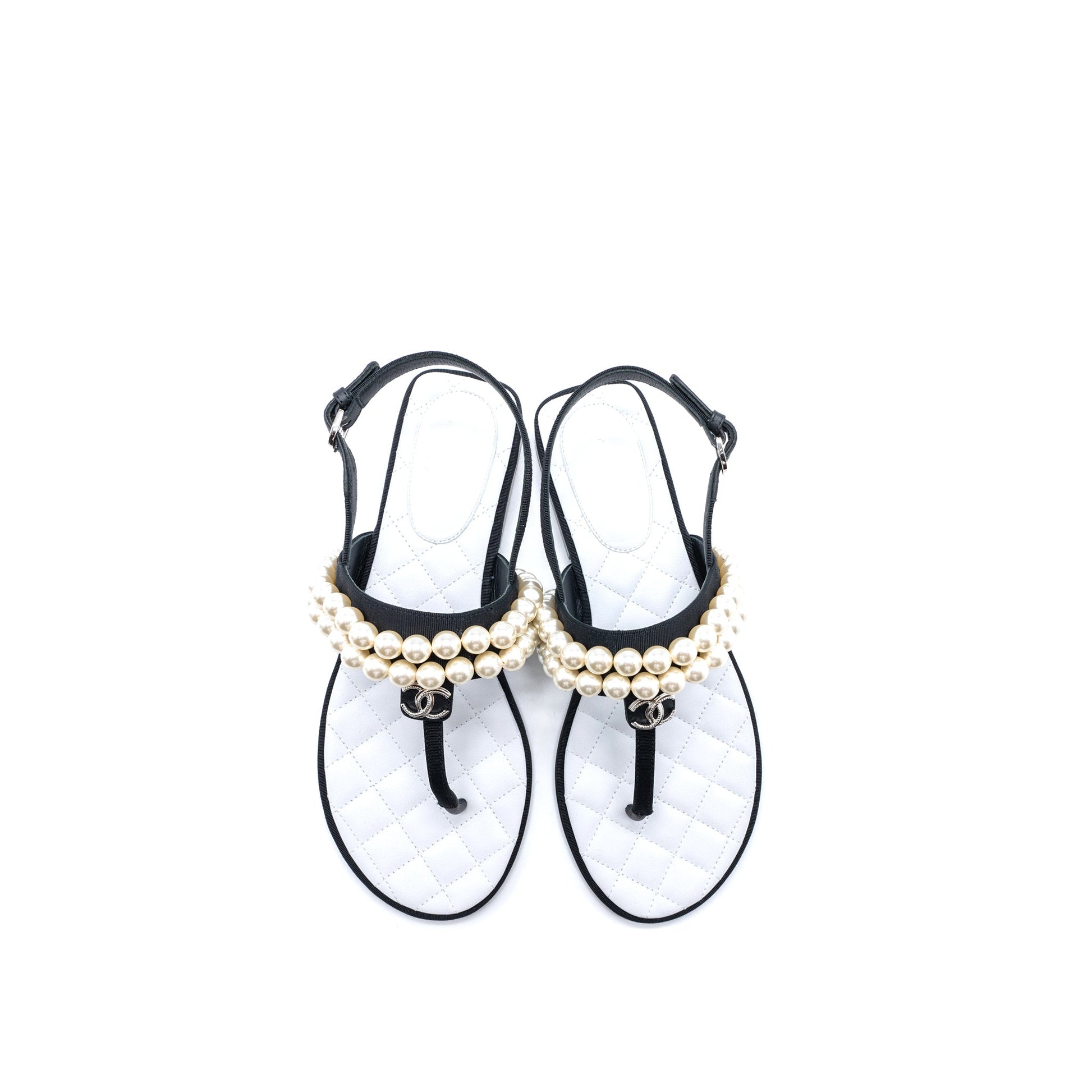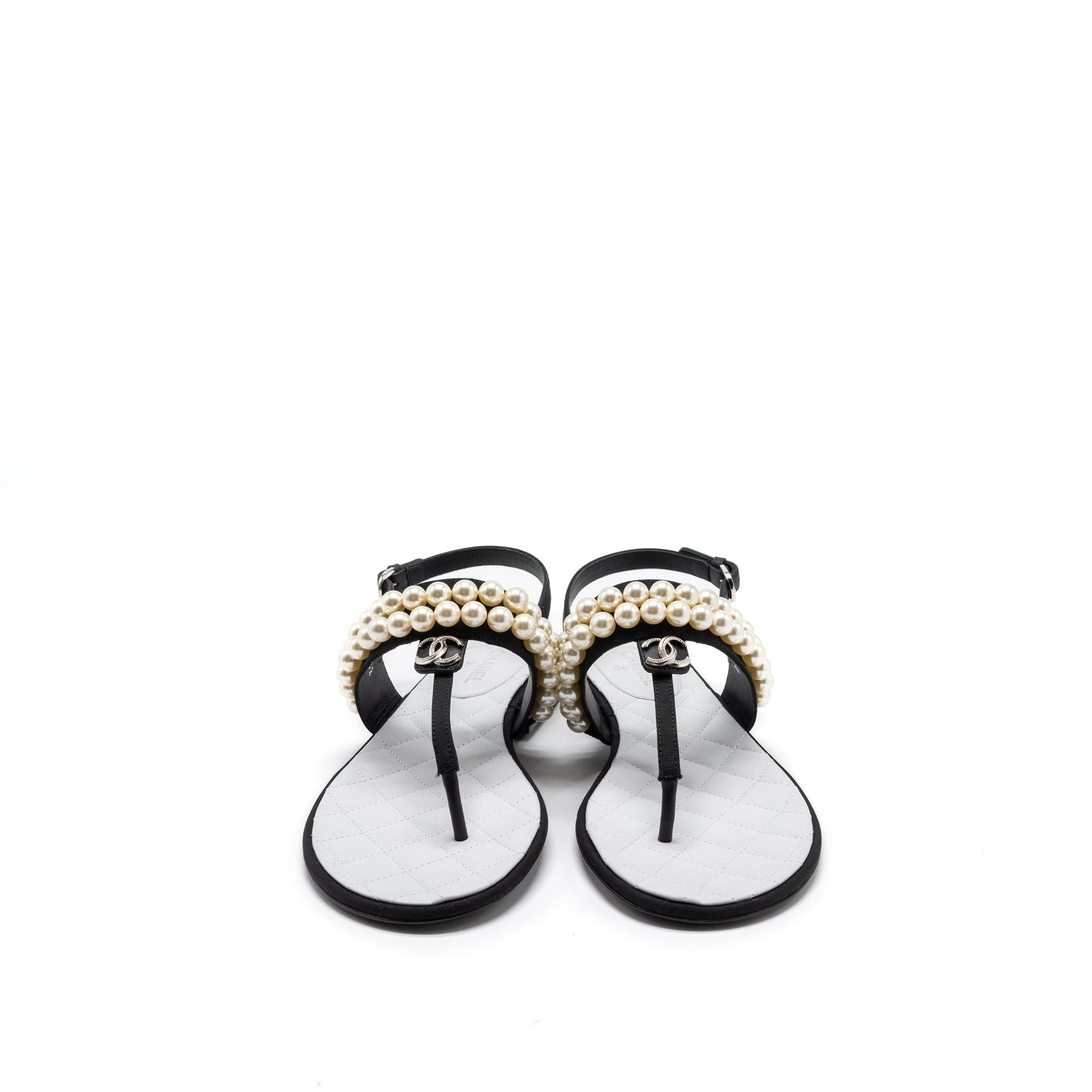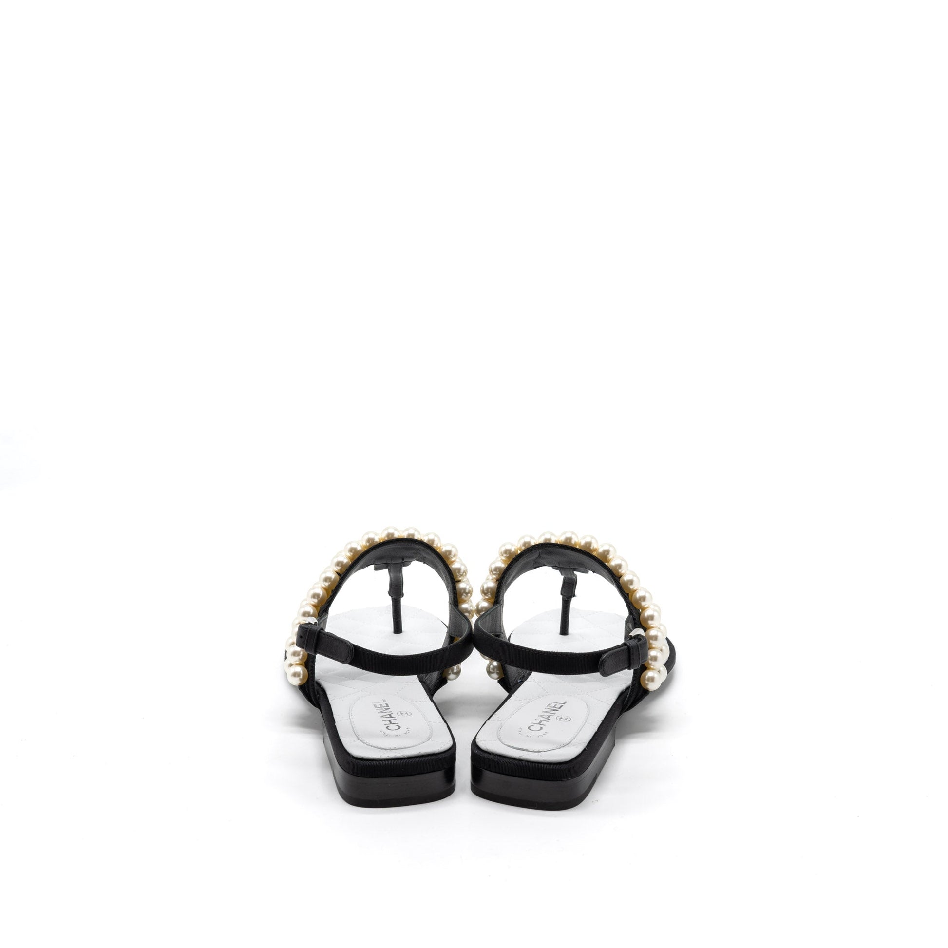 Chanel 22B Size 36 Flip Flops Sandals Pearl Leather/Fabric Black
