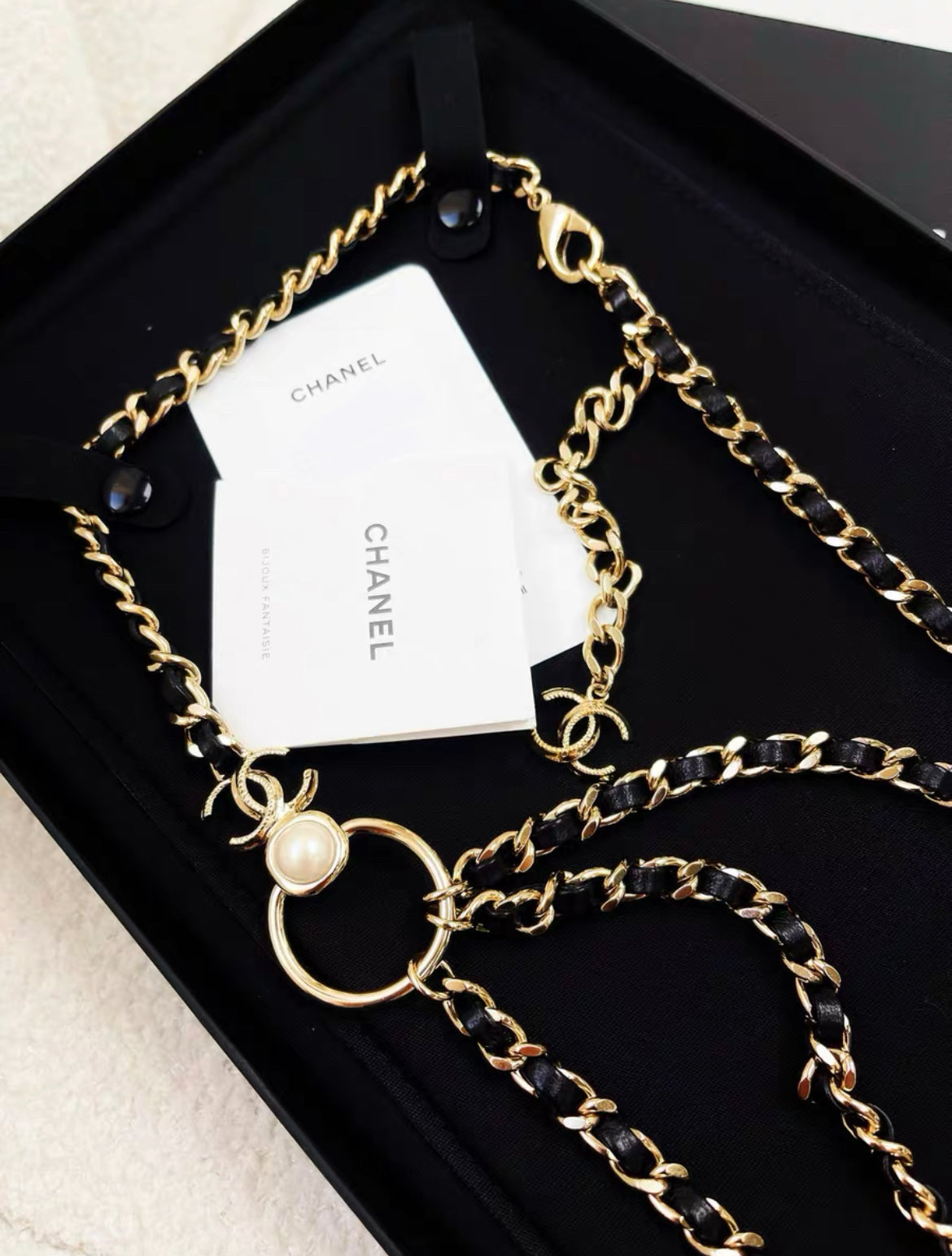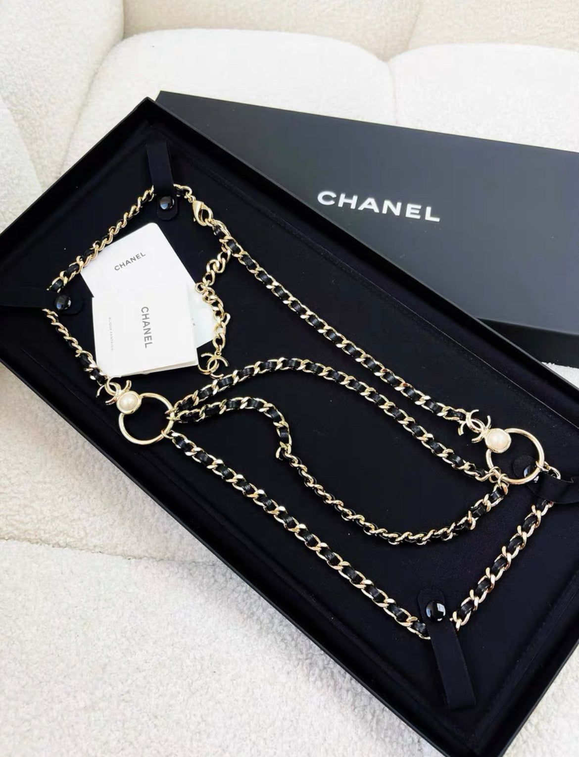 Elevate your style to new heights with the Chanel 22C black and gold leather waist chain. Adorned with a delicate pearl chain, this luxury accessory is perfect for early spring vacations. Complete with a length of 70-80cm and presented in its original box, indulge in sophistication and elegance.