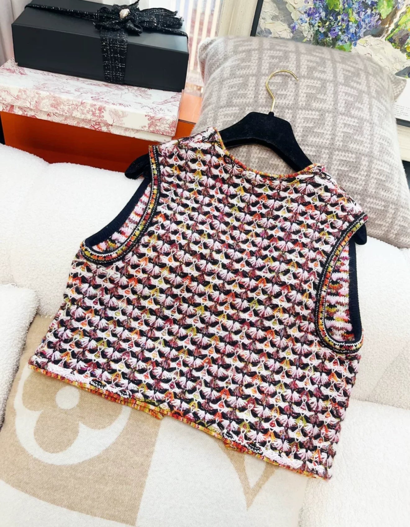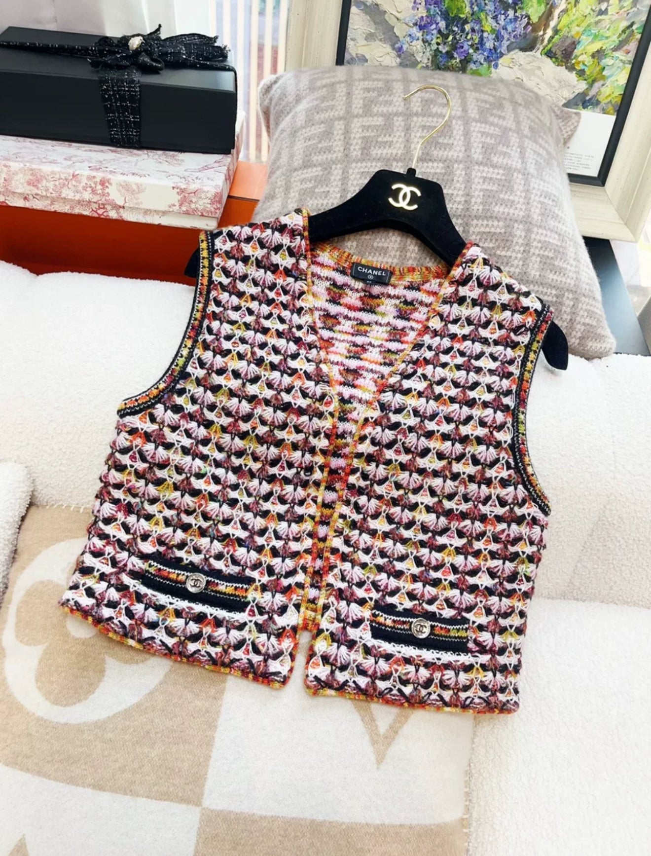 As an expert in fashion, I present to you the Chanel 23A Tweed Vest. This size 36 vest is in very good condition, making it a perfect addition to any wardrobe. Made with tweed fabric, this vest brings a classic and sophisticated touch to any outfit. Enhance your style with this timeless piece.