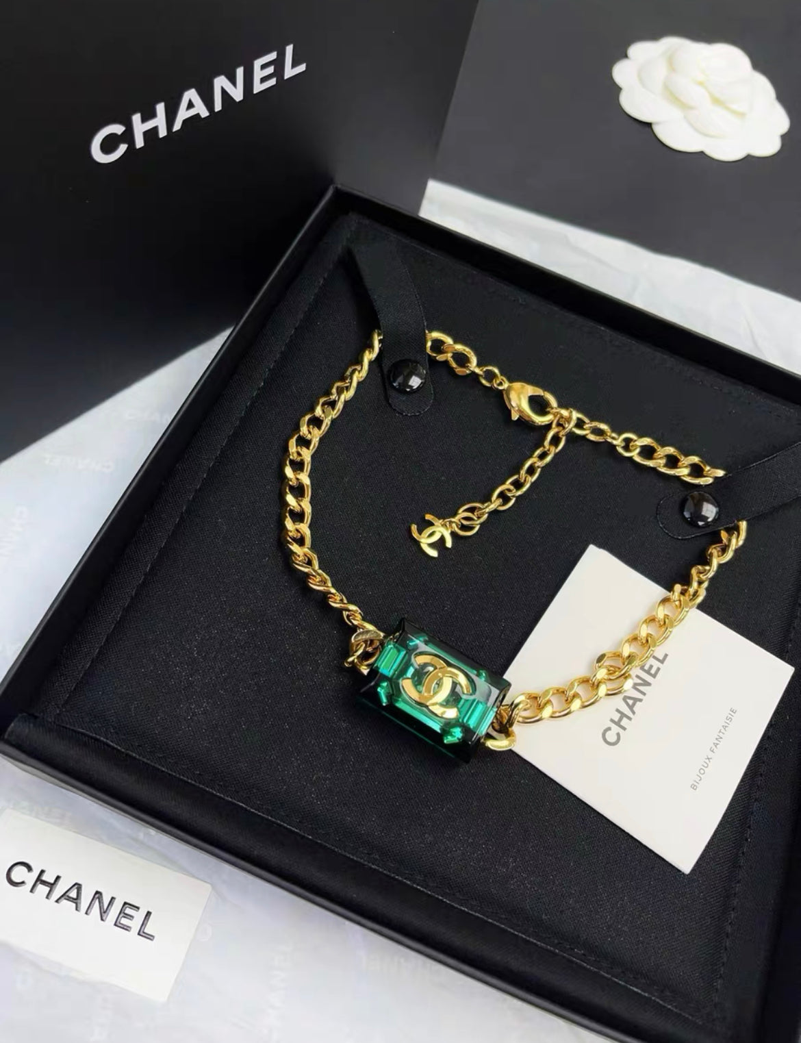 Chanel 23P emerald green square gold chain necklace