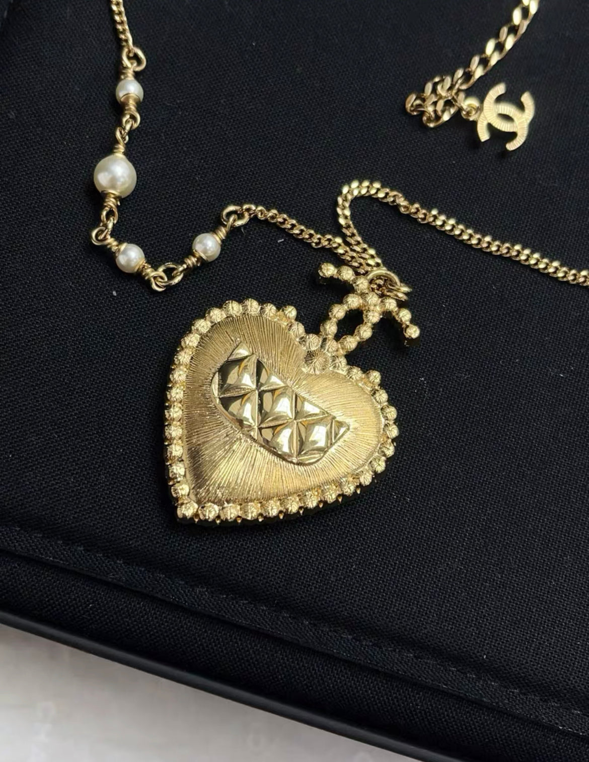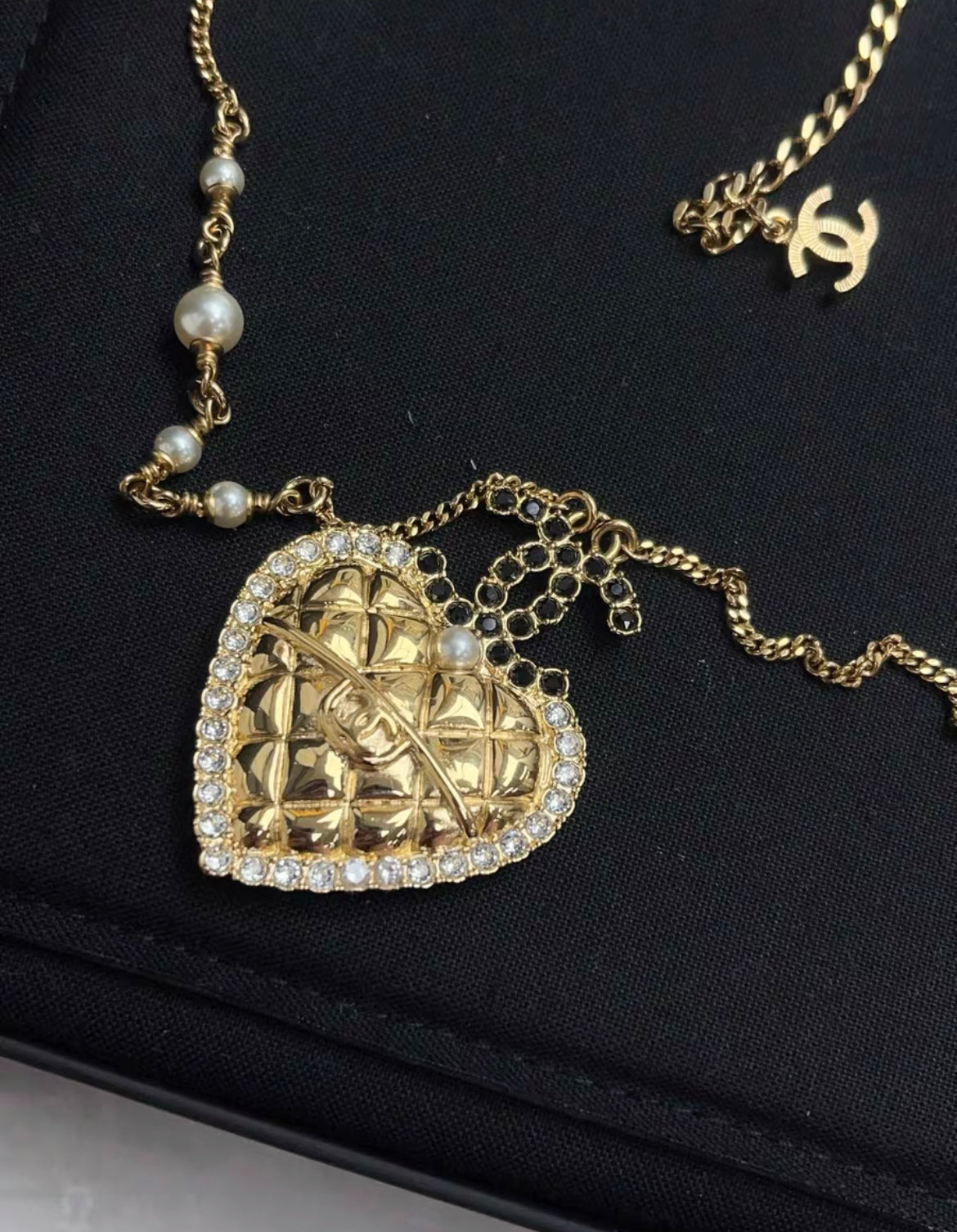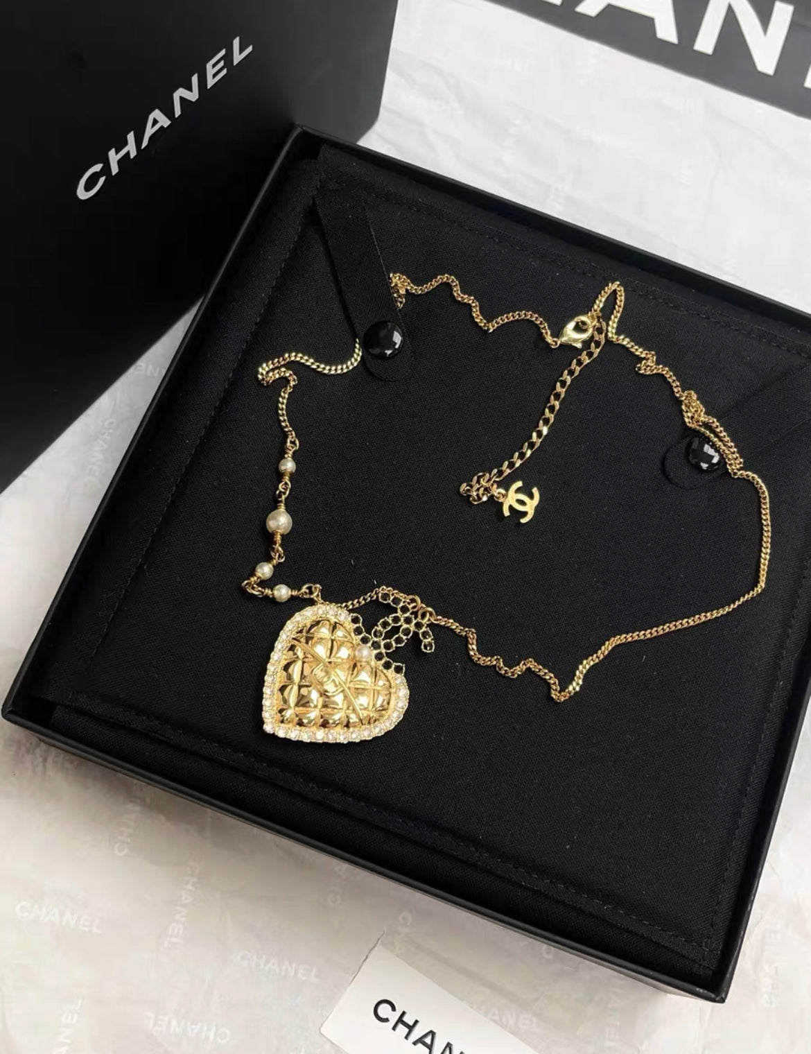 The Chanel 24A gold heart-shaped diamond necklace is a stunning statement piece that exudes elegance and luxury. Made with genuine gold and adorned with sparkling diamonds, this necklace is sure to turn heads. In pristine condition, it comes with its original box, making it the perfect gift for yourself or a loved one. Elevate any outfit with this exquisite Chanel necklace.