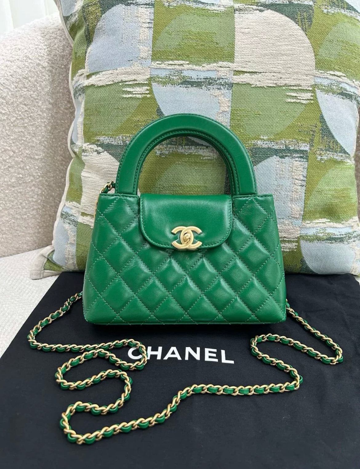 This CHANEL 24A Green Kelly Bag is in very good condition. The gold hardware adds a touch of luxury to this classic and timeless piece. Perfect for any occasion, this bag is both functional and stylish. Treat yourself to the best in designer fashion with this beautiful handbag.