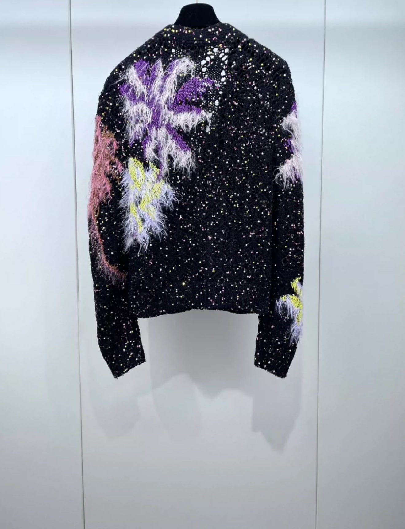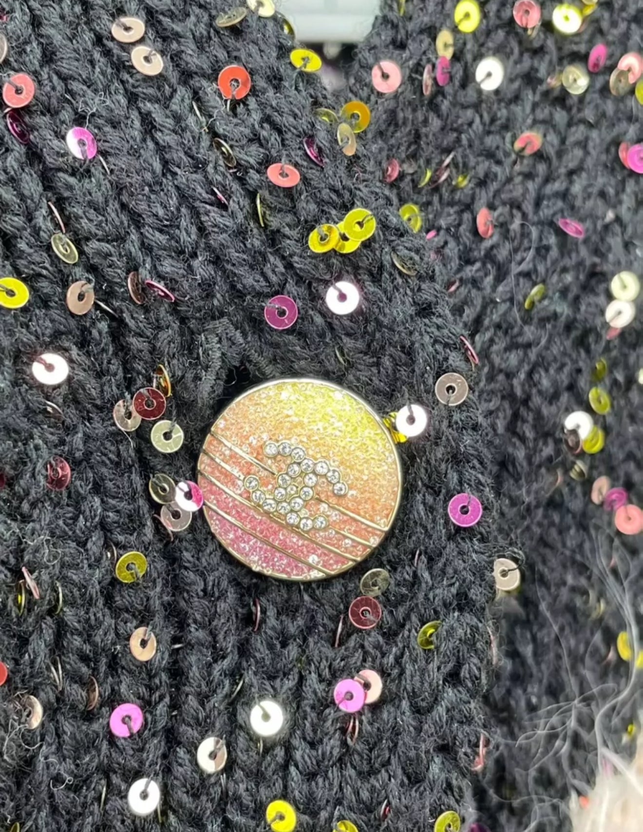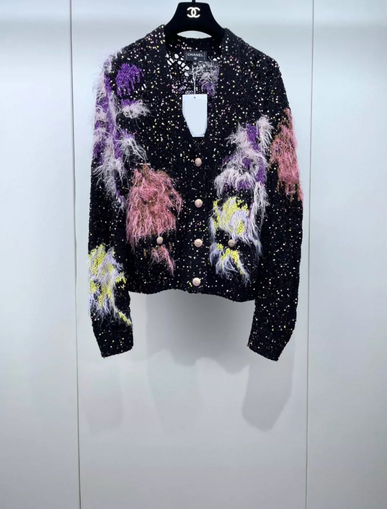 Experience luxury and elegance with the Chanel 24C colorful cardigan. Featuring a stunning sequined knitted design, this cardigan is the perfect addition to elevate any outfit. Stay stylish and comfortable with the iconic Chanel brand. Size 38