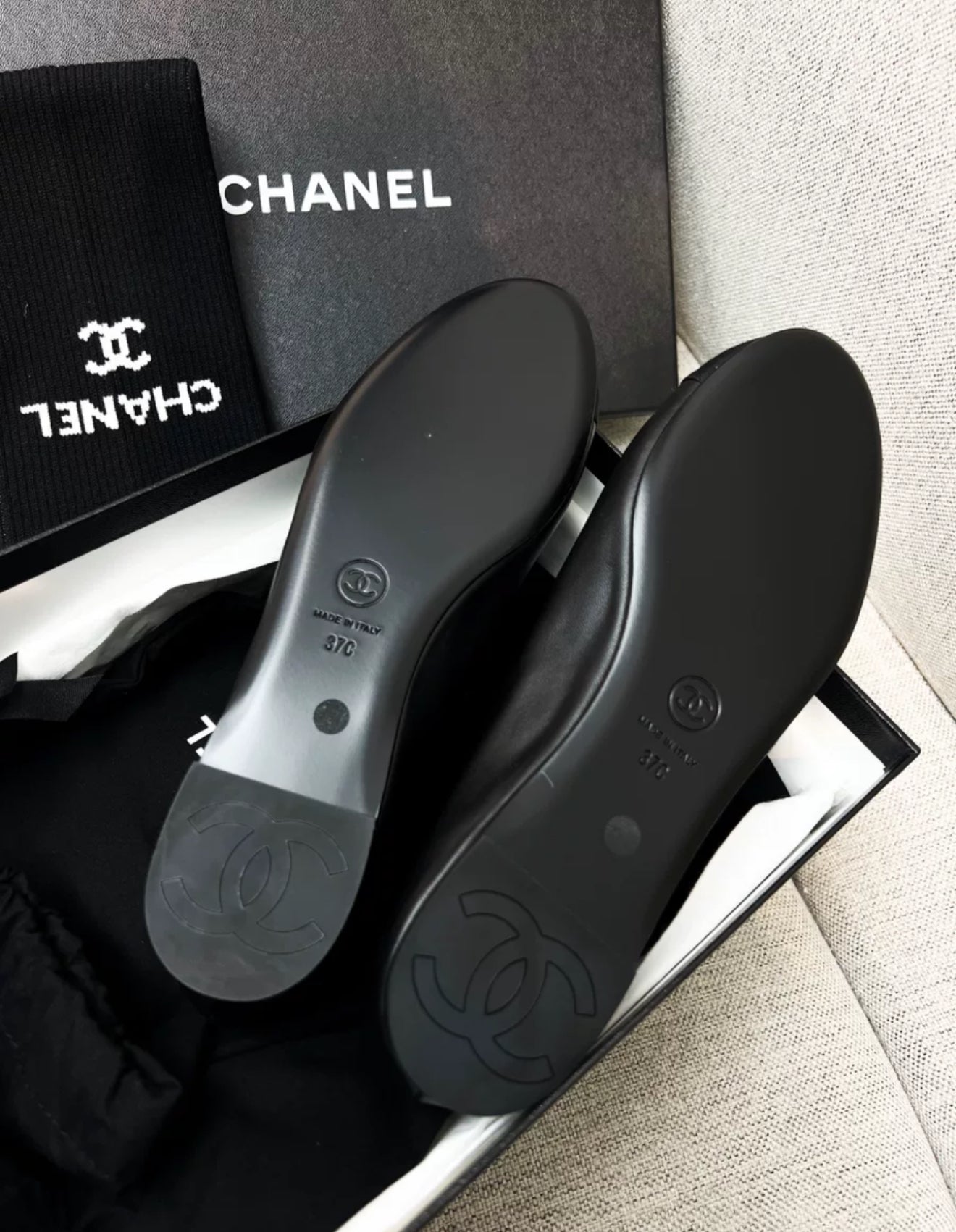 Expertly crafted with black leather, these Chanel ballet flats are a must-have for any fashion-forward individual. The timeless design and quality materials ensure durability and comfort. These size 37C flats are both trendy and popular, making them the perfect addition to any wardrobe.