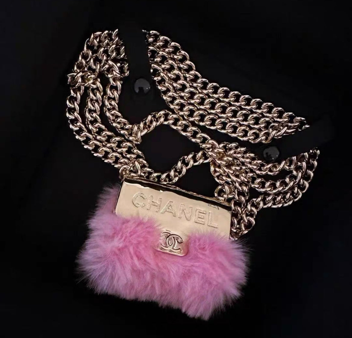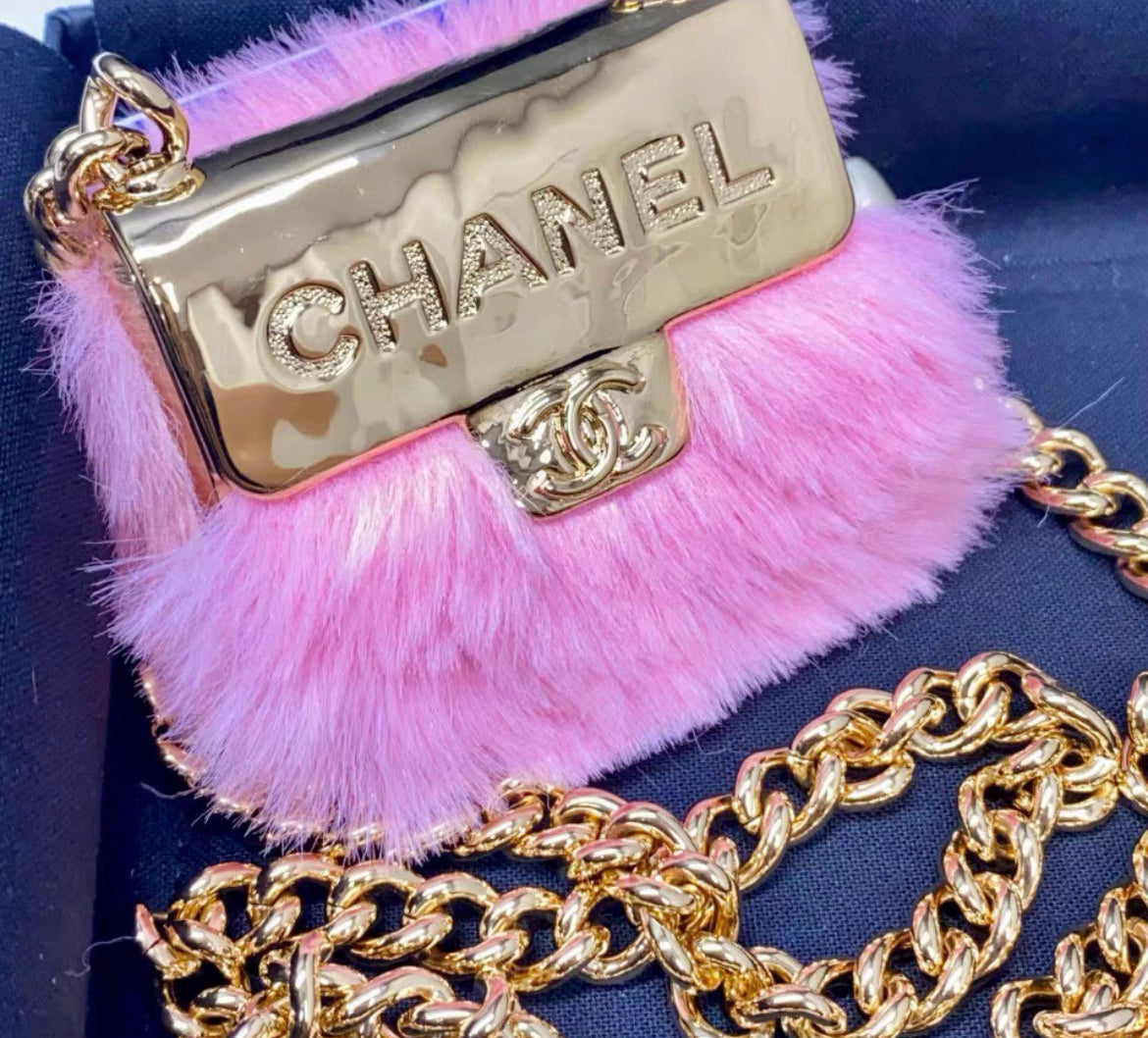 This mini bag necklace from Chanel's 2024 cruise l’os Angeles series collection features a luxurious pink furry design and a delicate gold chain. Elevate your outfit with this unique and stylish accessory.