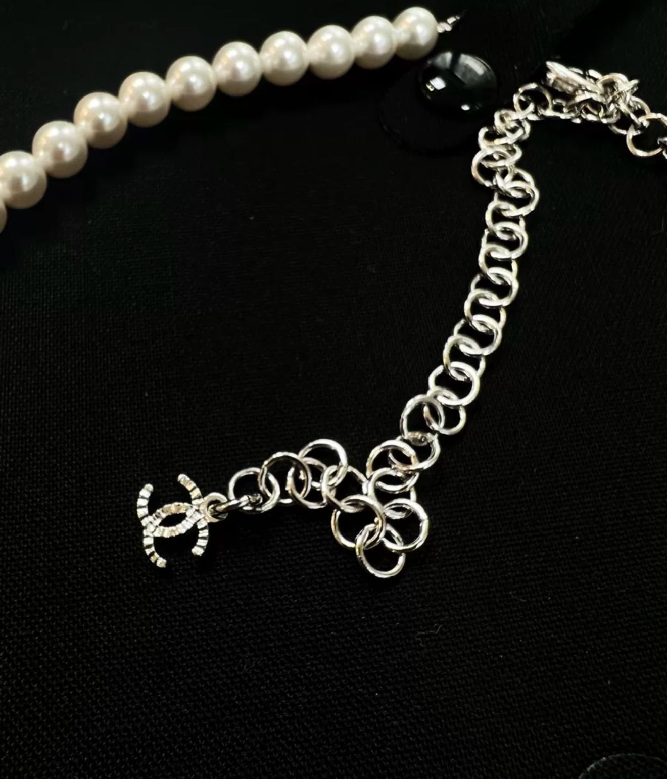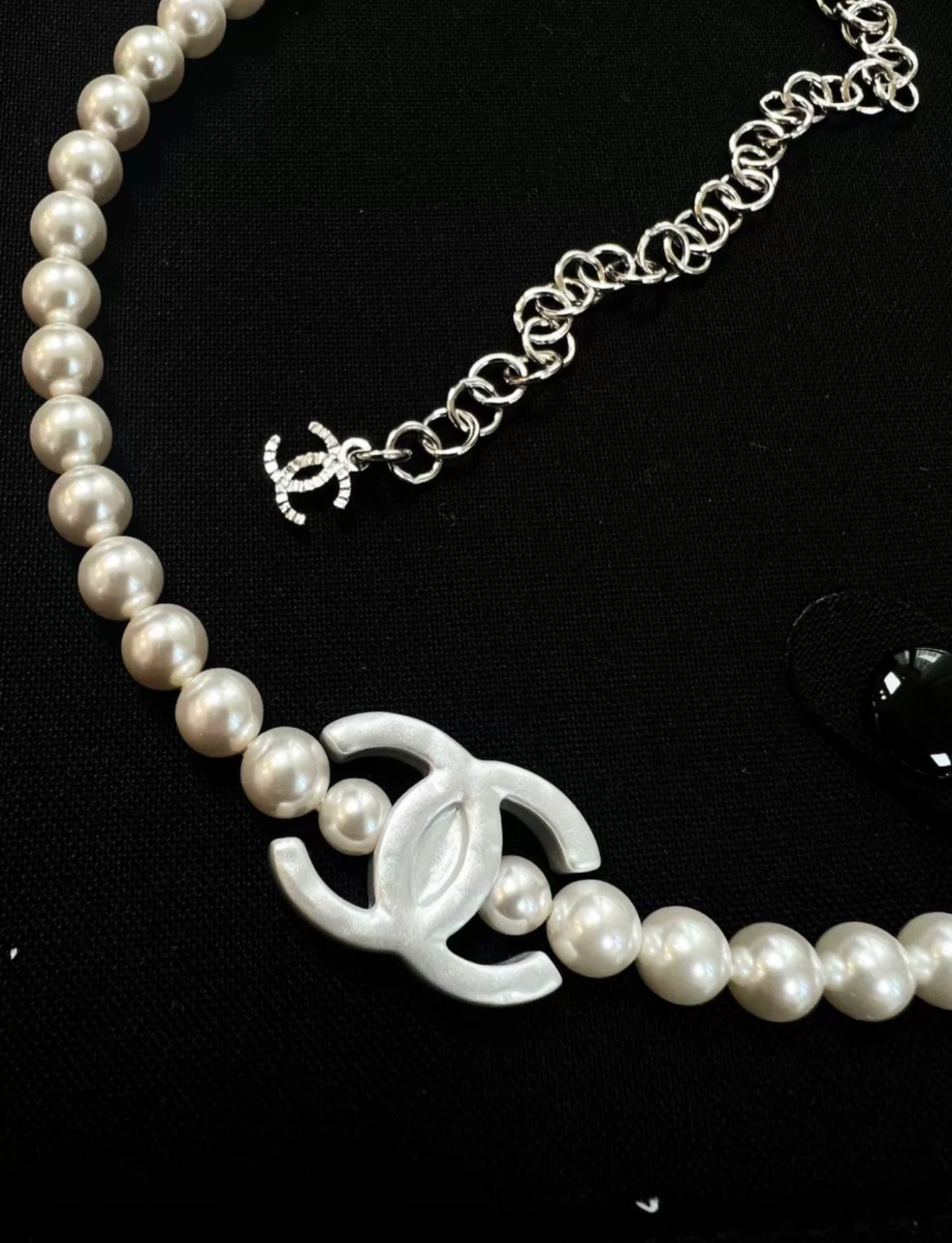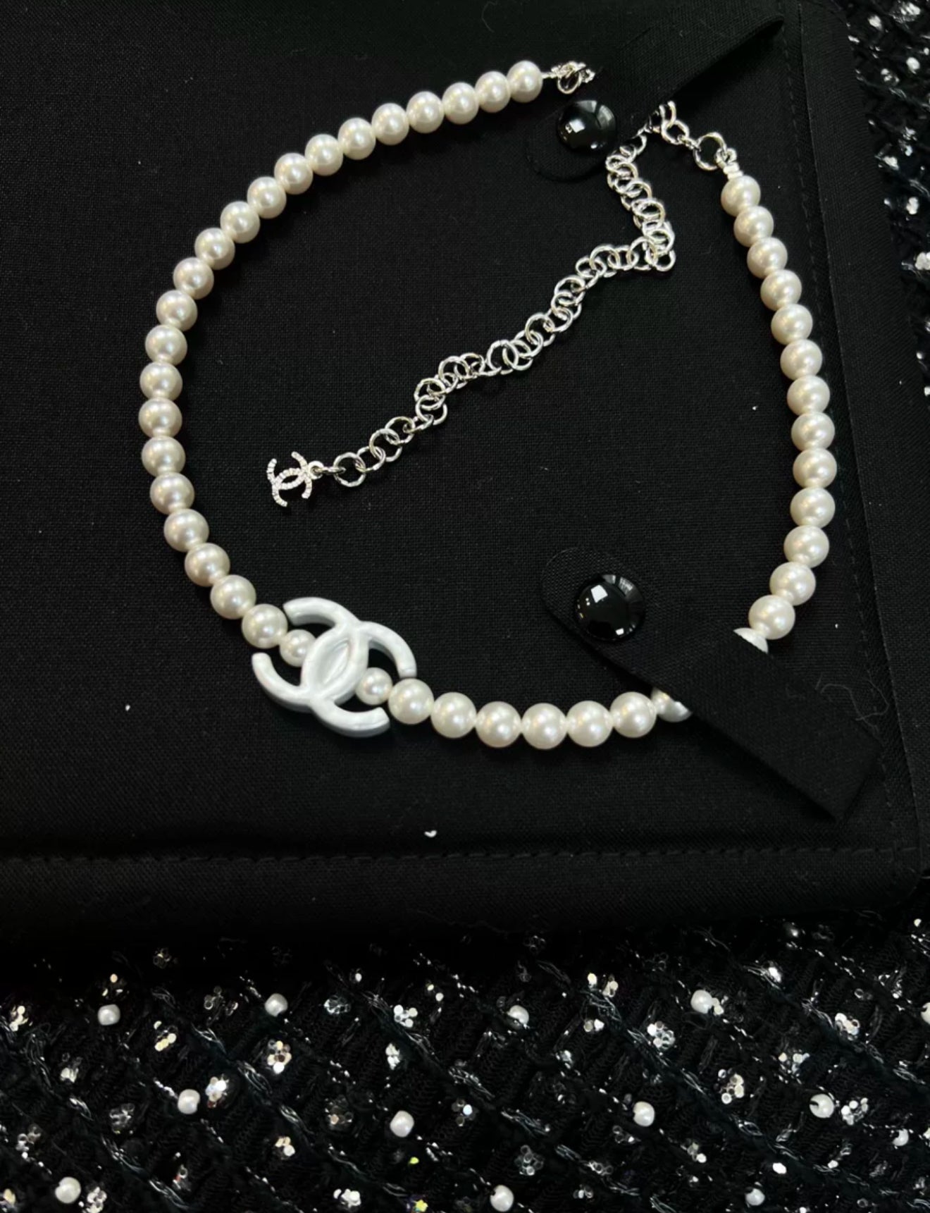 Introducing the elegant Chanel 25C white double C pearl choker necklace. Part of the new collection, this timeless piece exudes sophistication and style. With a classic design and high-quality materials, it is perfect for any occasion. Elevate your outfit with this beautiful and versatile necklace.